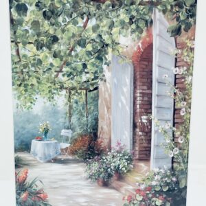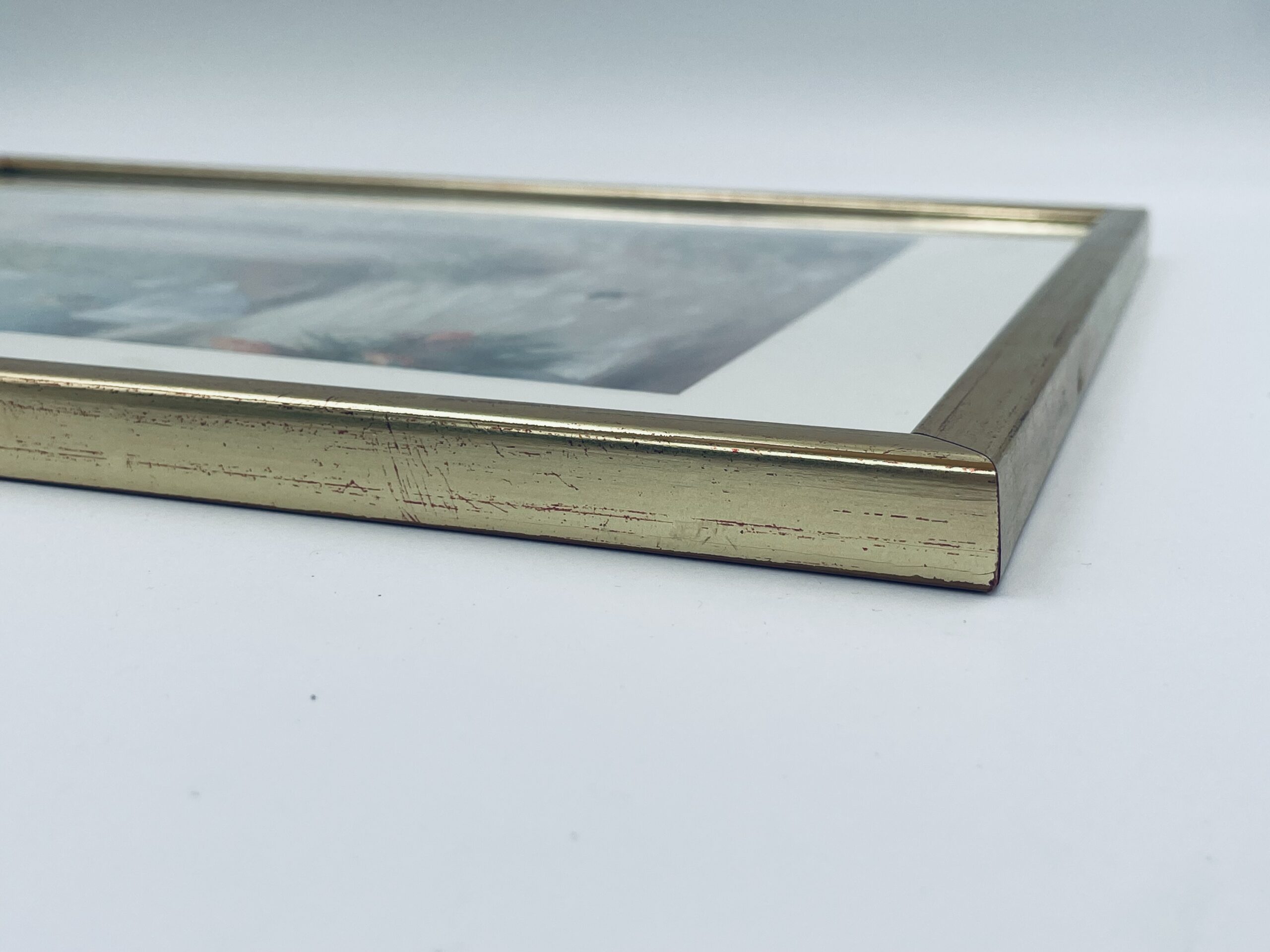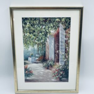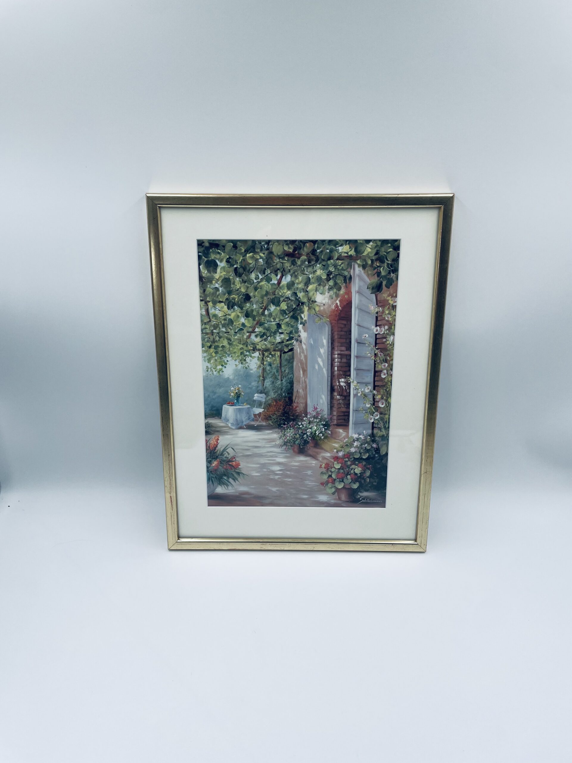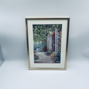 Grafika w ramce złoconej przedstawiająca wyjcie na ogród.