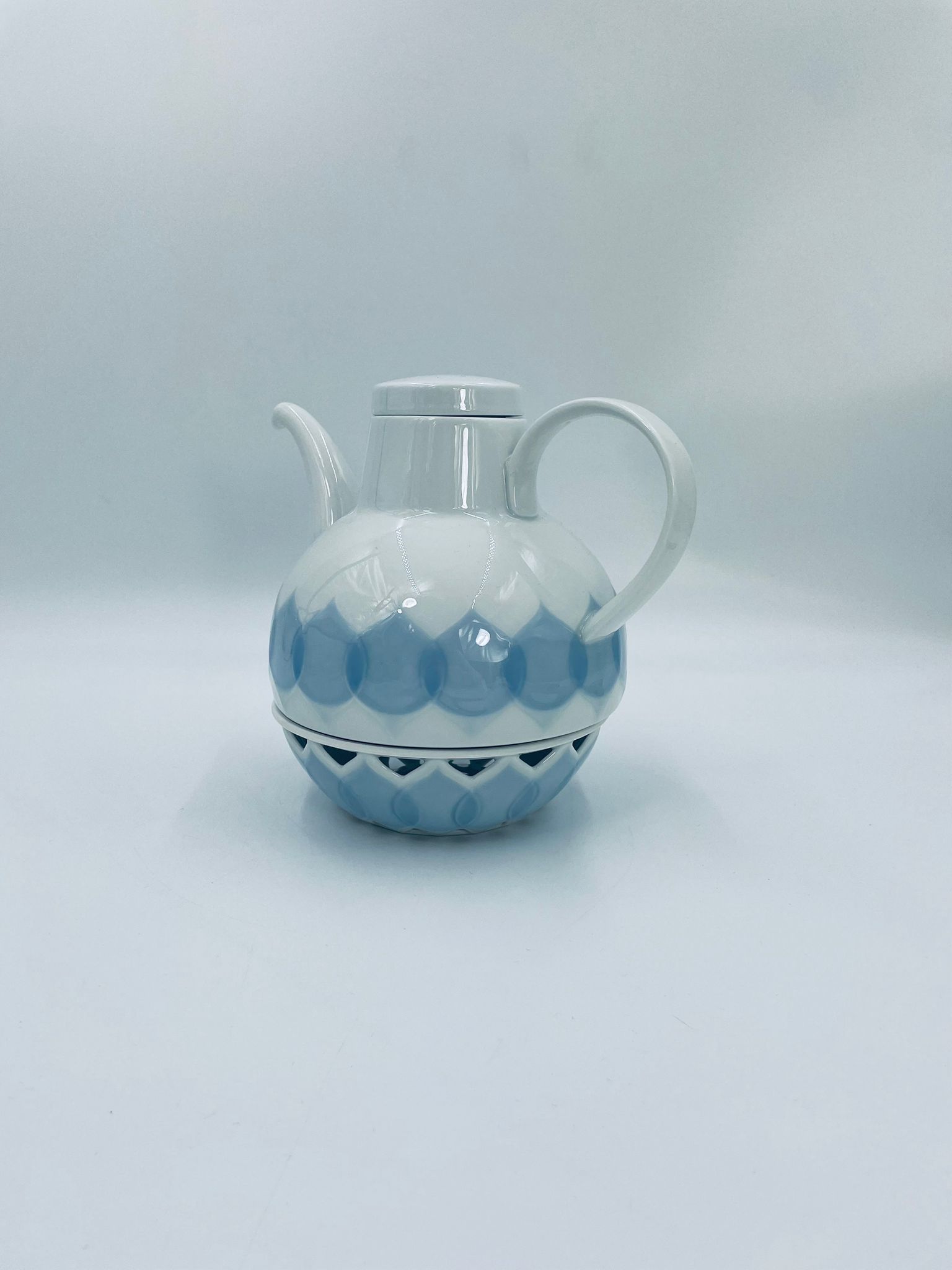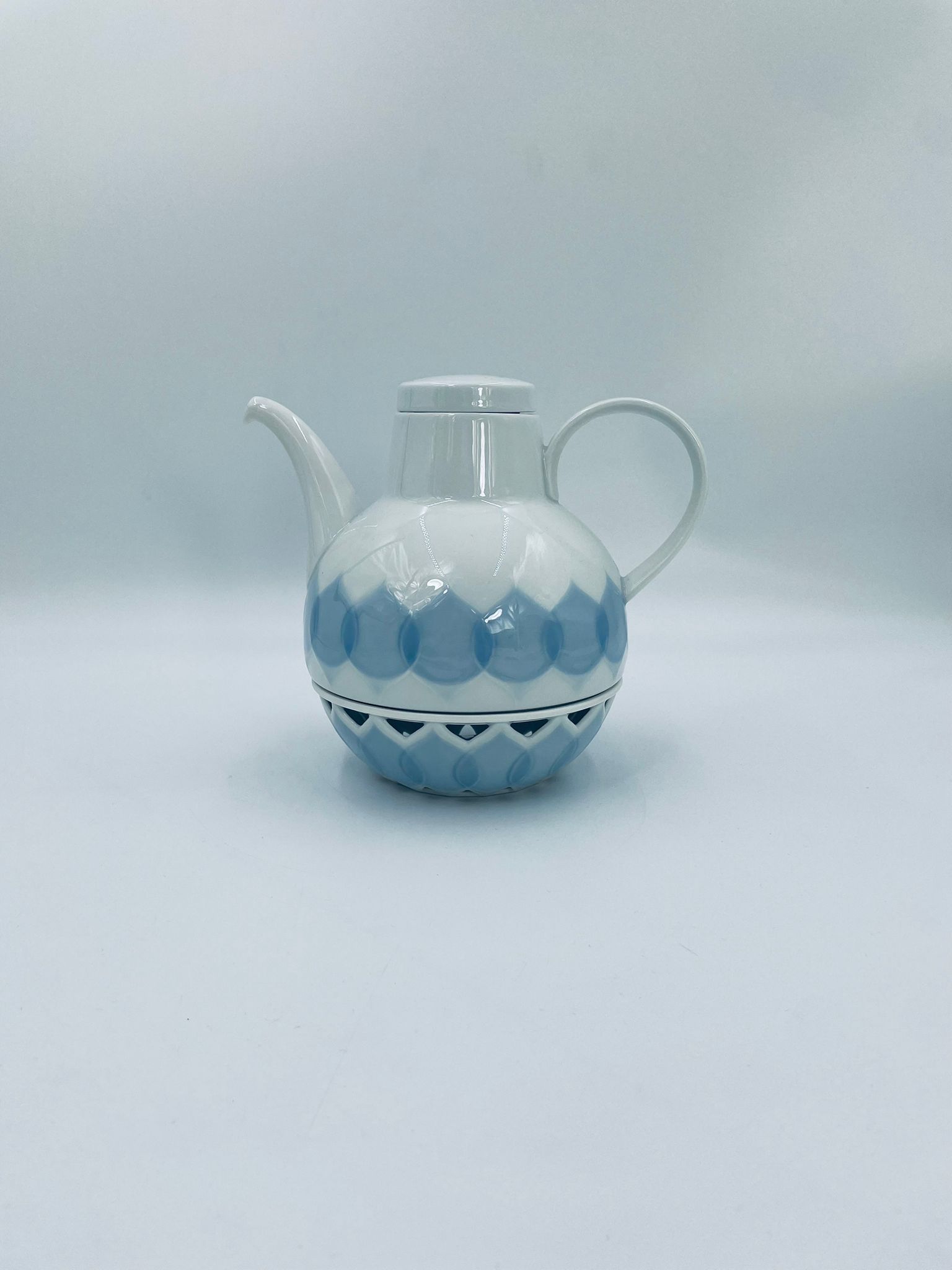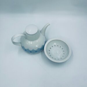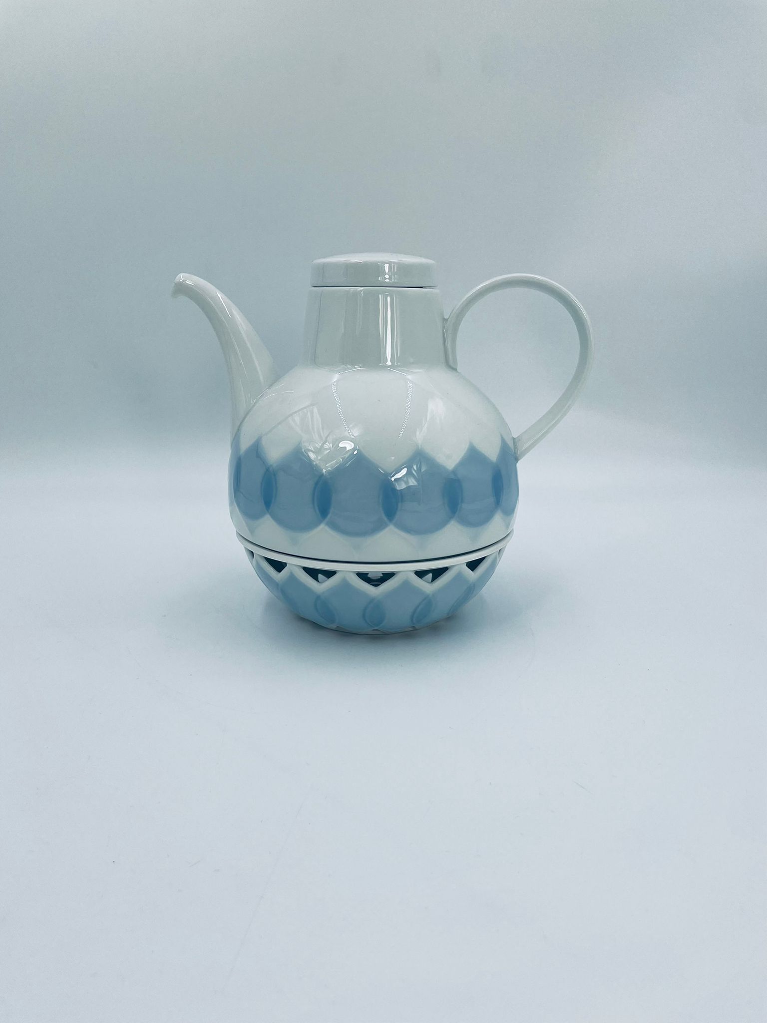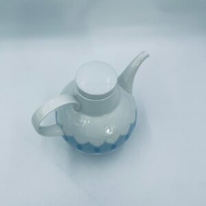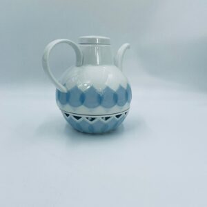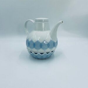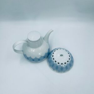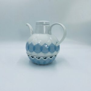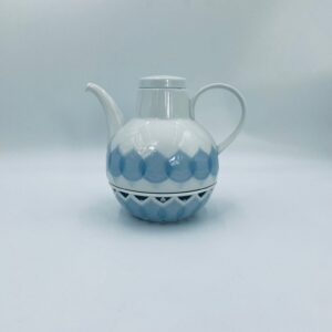 Imbryk z podgrzewaczem renomowanej wytwórni Rosenthal Studio Line z serii Lotus Blau, zaprojektowany przez duńskiego artystę Bjorna Wiinblada w 1964r, wykonany z najwyższej jakości białej porcelany. Imbryk z podgrzewaczem ozdobiony wzorem „Blau”, charakteryzuje się delikatnym, geometrycznym motywem przypominający liście lotosu w niebieskim odcieniu oraz ażurowym wzorem na podgrzewaczu.
