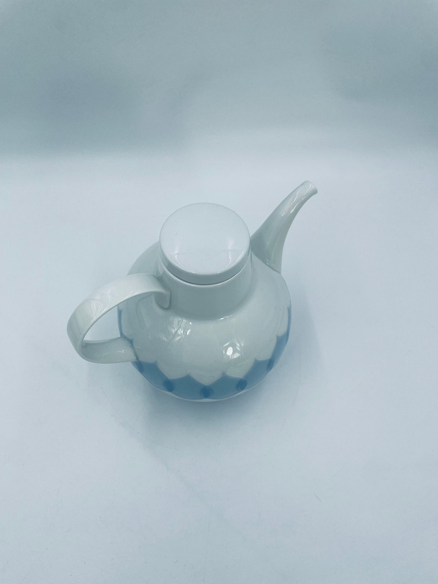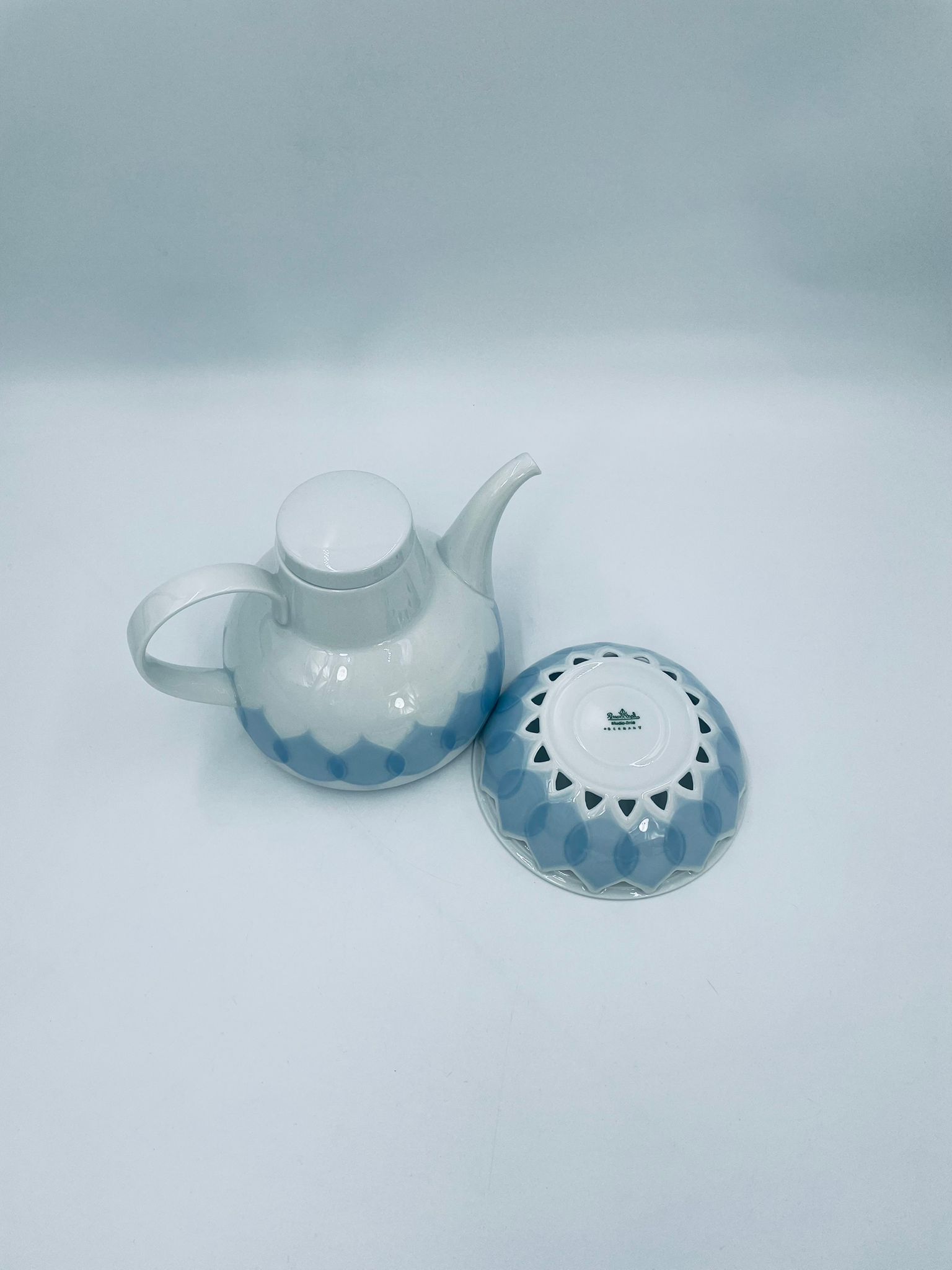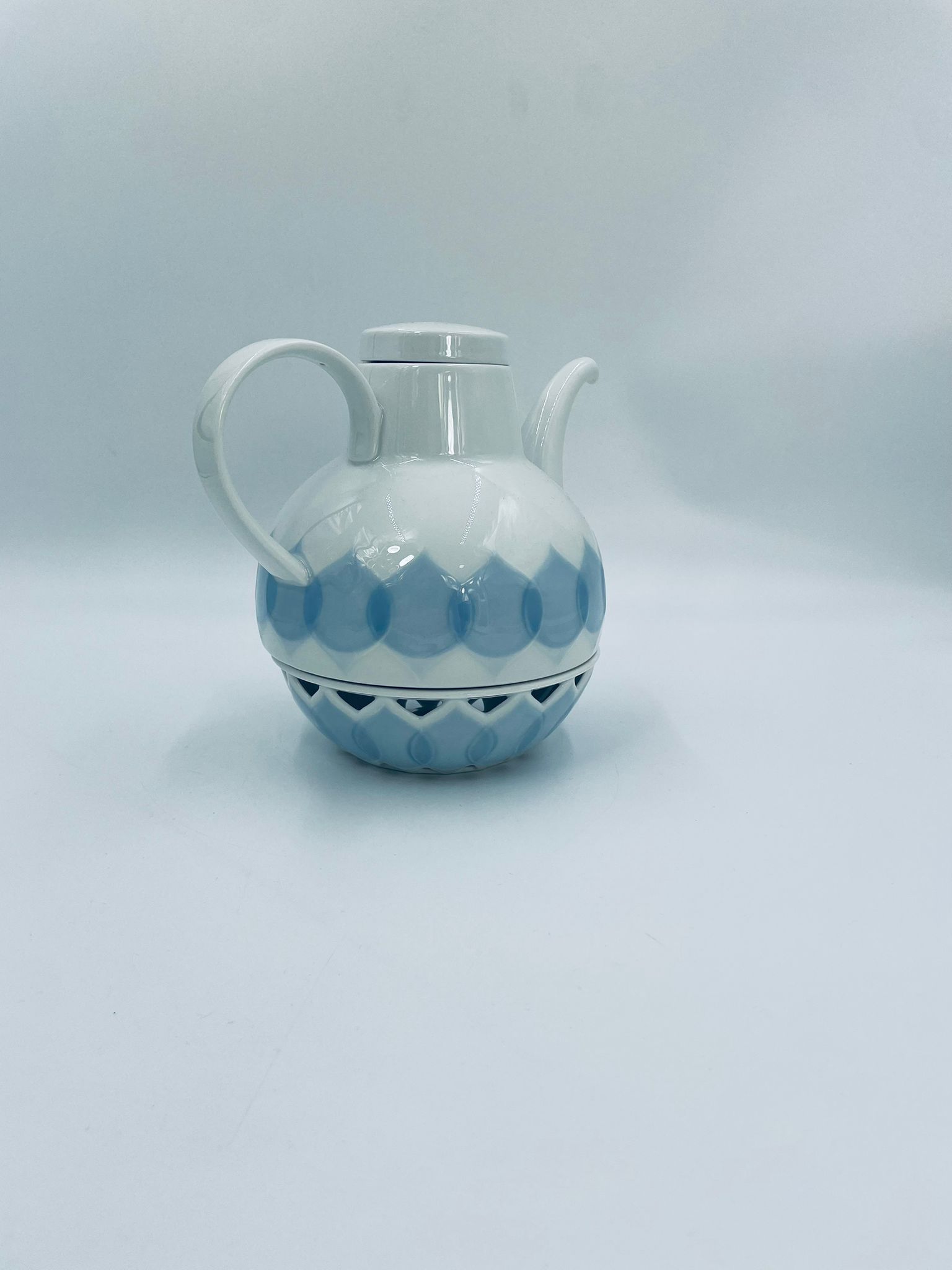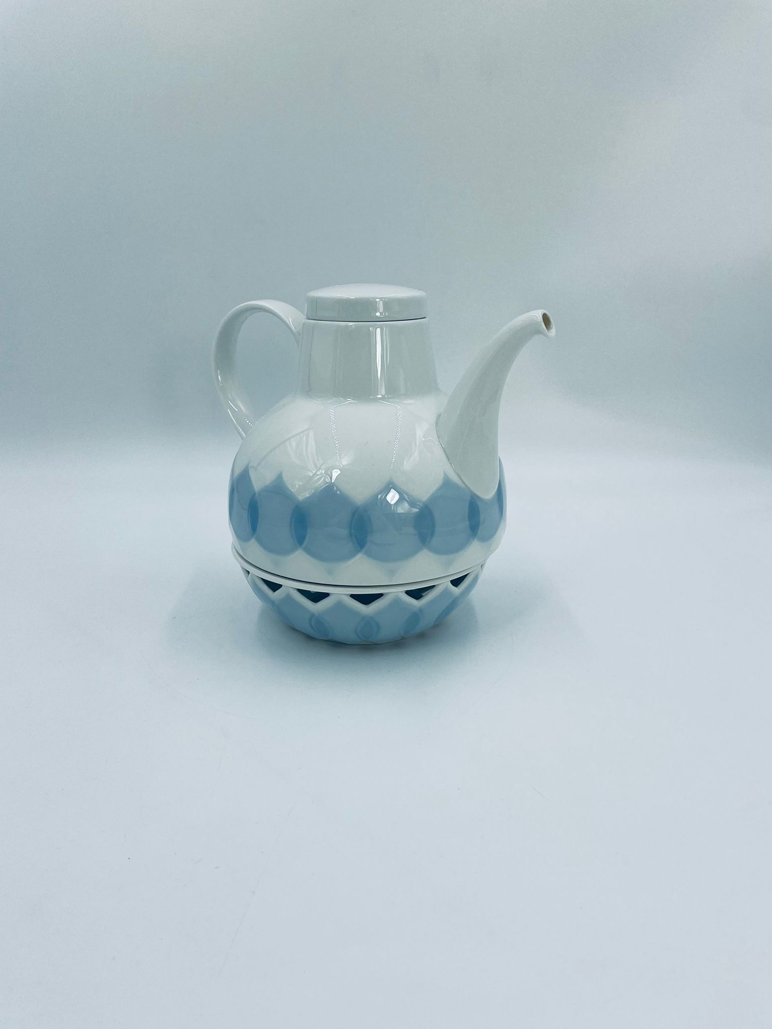 Imbryk z podgrzewaczem renomowanej wytwórni Rosenthal Studio Line z serii Lotus Blau, zaprojektowany przez duńskiego artystę Bjorna Wiinblada w 1964r, wykonany z najwyższej jakości białej porcelany. Imbryk z podgrzewaczem ozdobiony wzorem „Blau”, charakteryzuje się delikatnym, geometrycznym motywem przypominający liście lotosu w niebieskim odcieniu oraz ażurowym wzorem na podgrzewaczu.