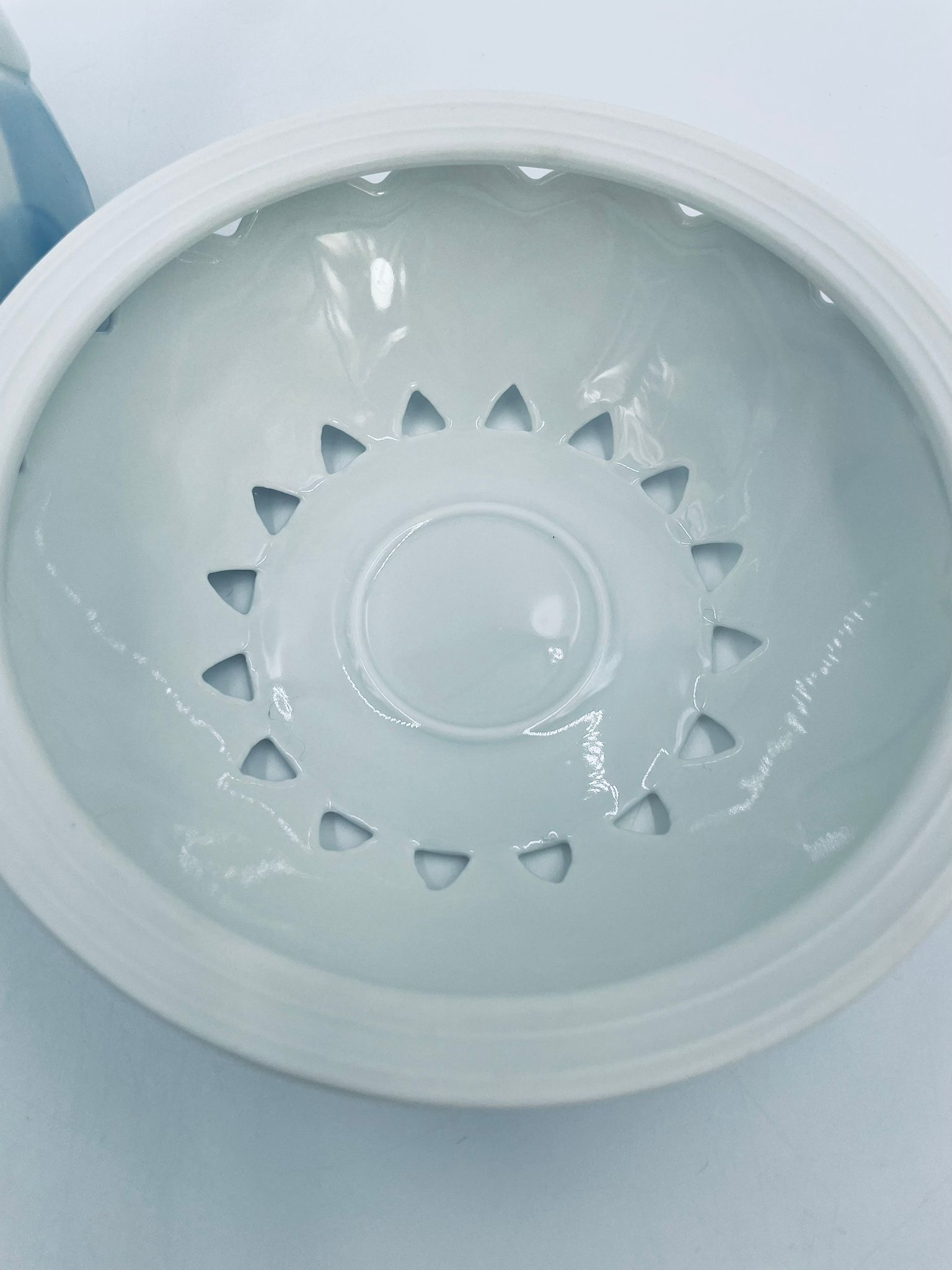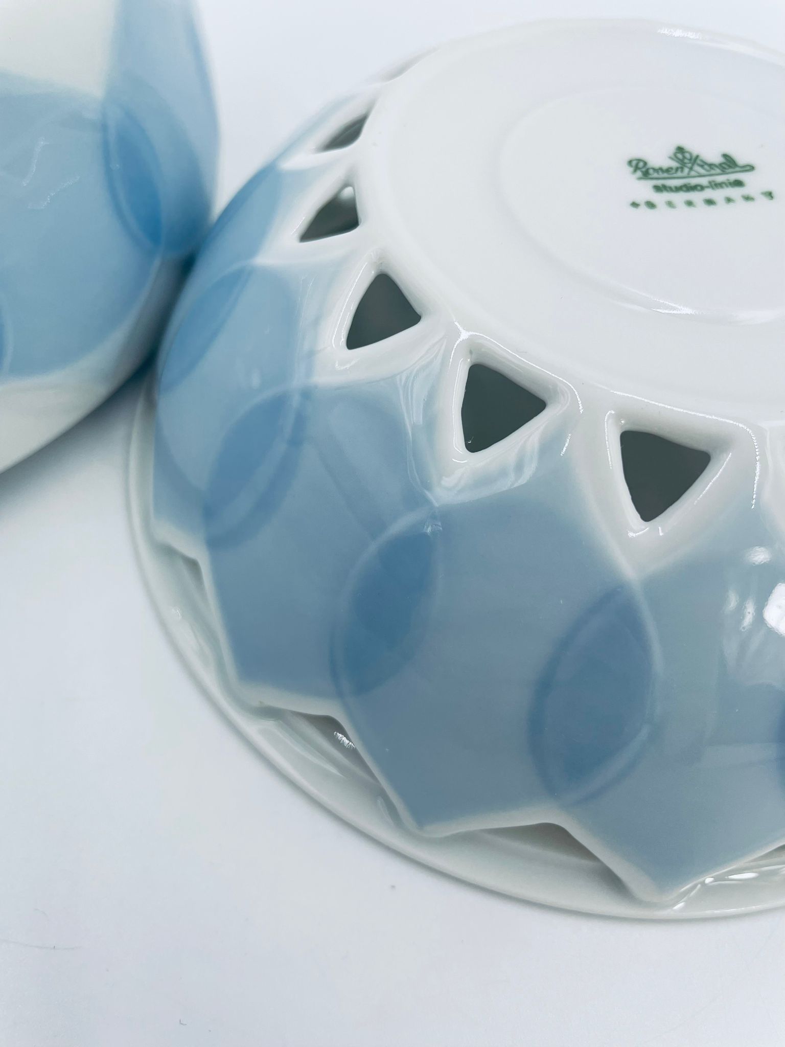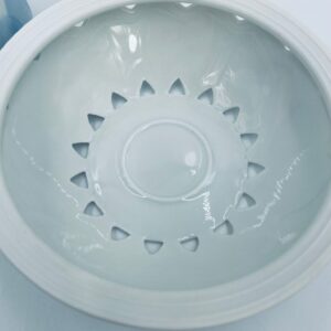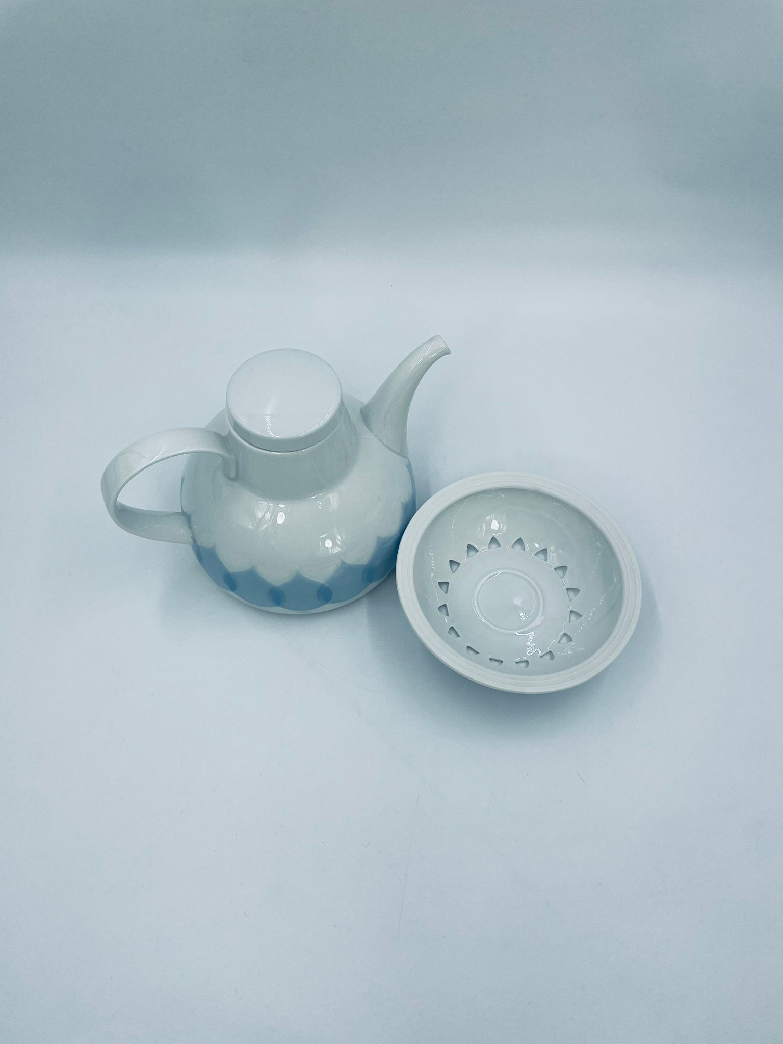 Imbryk z podgrzewaczem renomowanej wytwórni Rosenthal Studio Line z serii Lotus Blau, zaprojektowany przez duńskiego artystę Bjorna Wiinblada w 1964r, wykonany z najwyższej jakości białej porcelany. Imbryk z podgrzewaczem ozdobiony wzorem „Blau”, charakteryzuje się delikatnym, geometrycznym motywem przypominający liście lotosu w niebieskim odcieniu oraz ażurowym wzorem na podgrzewaczu.