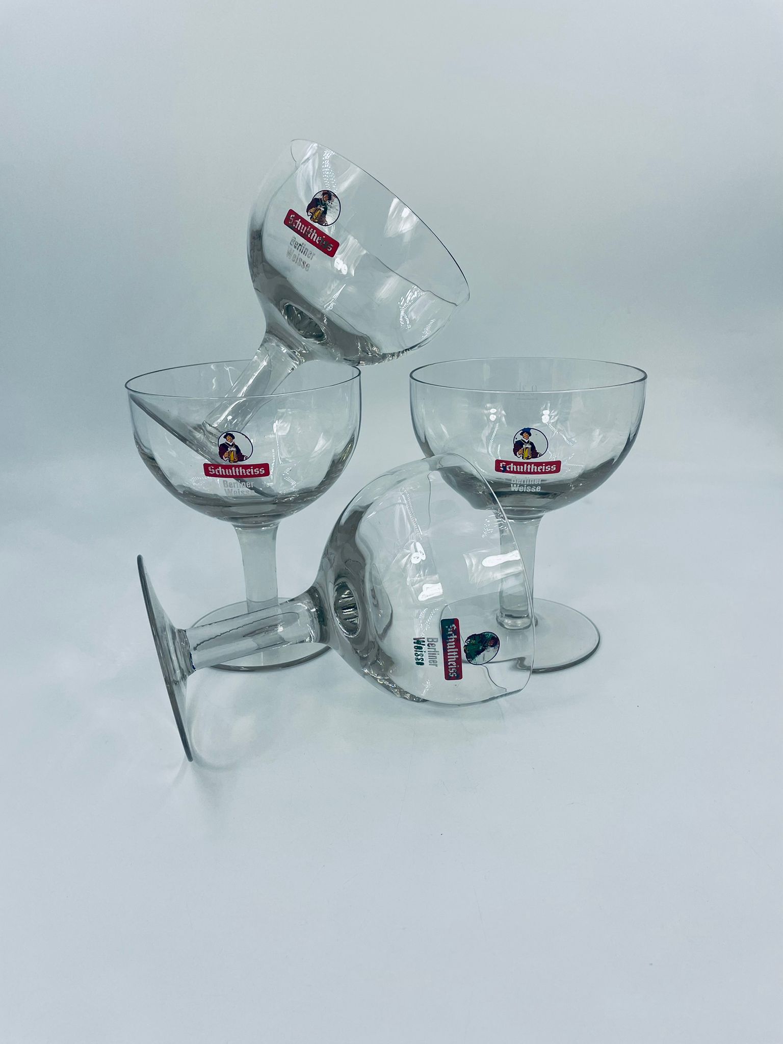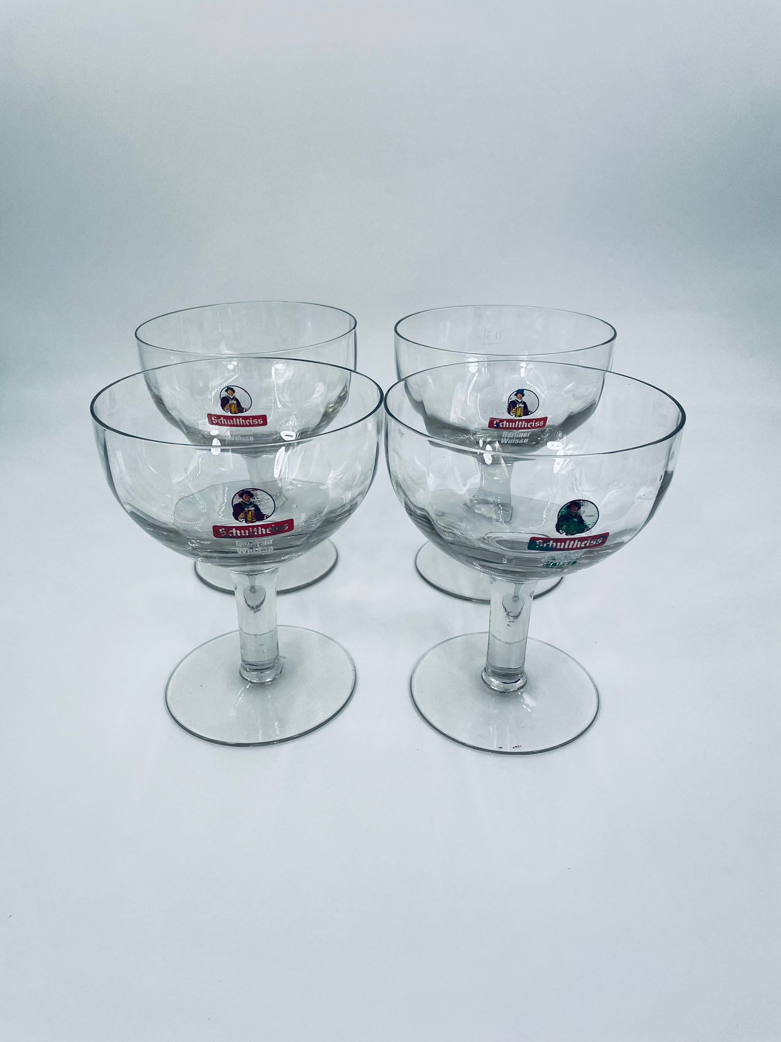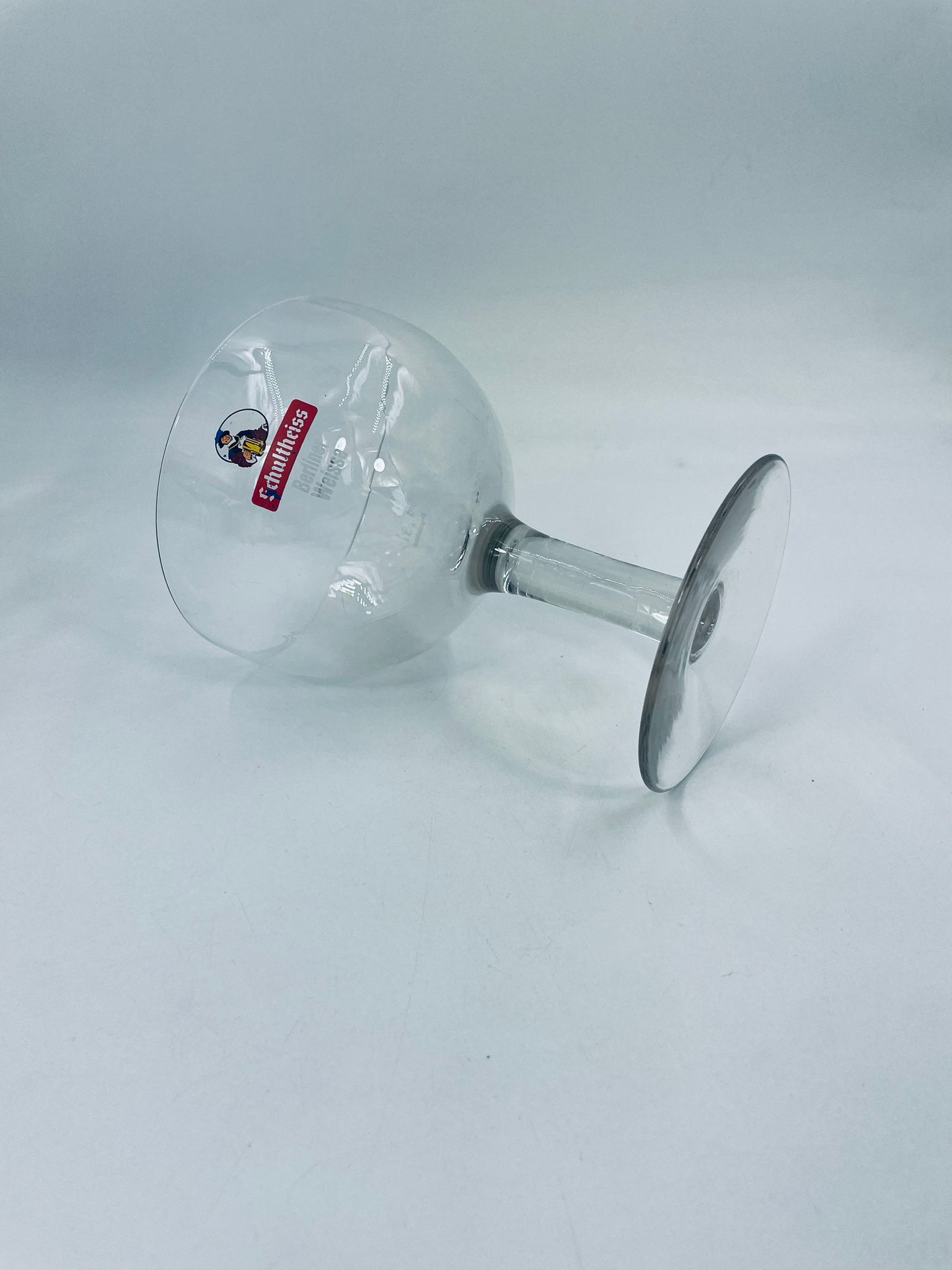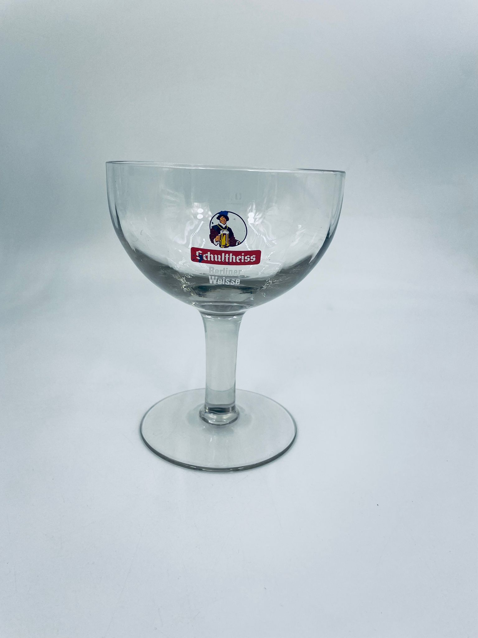 Niemiecki kielich do piwa Schultheiss Berliner Weisse. Kielich na wysokiej nóżce, typu puchar, ze szkła przezroczystego.