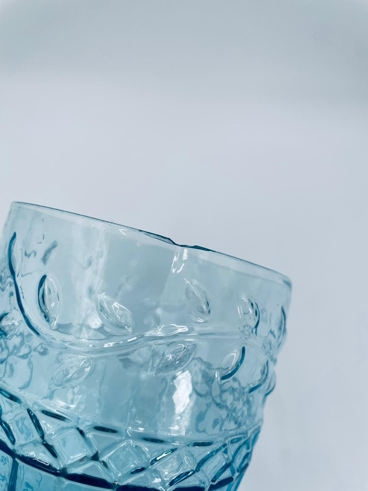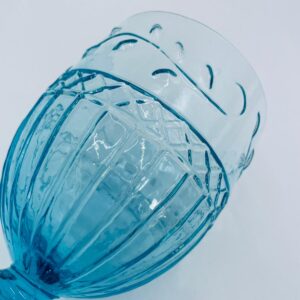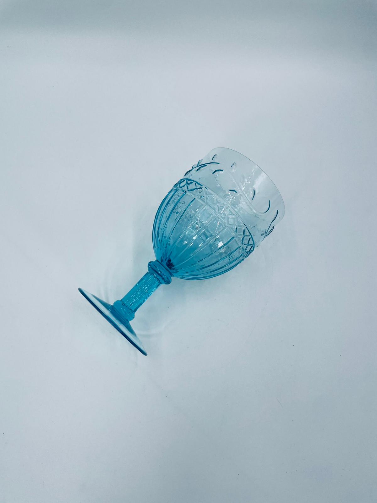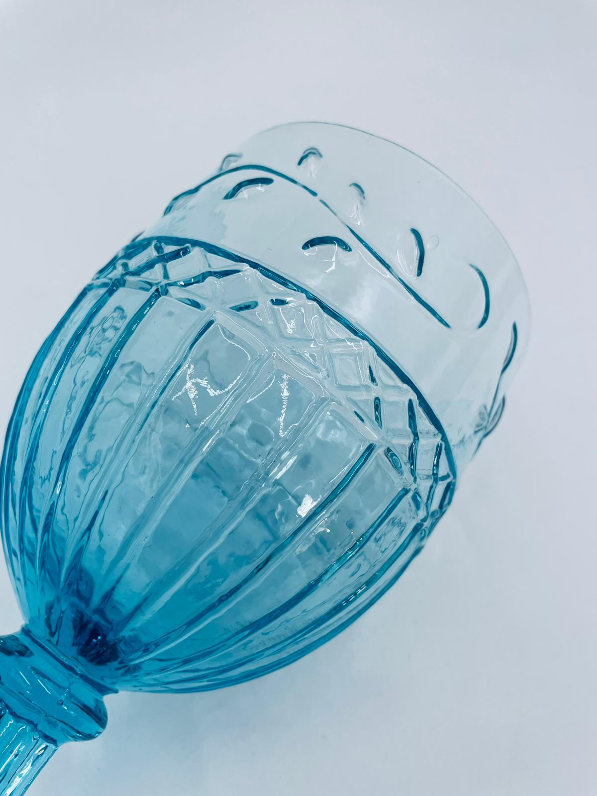 Kielich do wody, pucharek, w stylu Vintage, wykonany z wysokiej jakości szkła. Kielich barwiony w masie na jasnoniebieski kolor, ozdobiony tłoczonym wzorem geometrycznym i roślinnym na czaszy, posiada ozdobną nóżkę oraz stabilną podstawę. Jeden kielich posiada uszczerbek na górnym rancie.