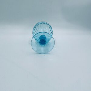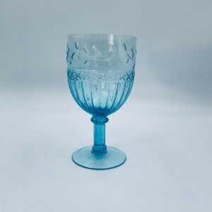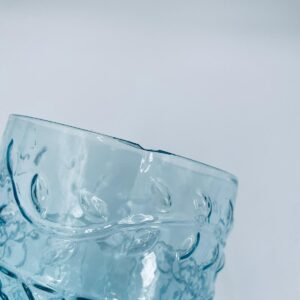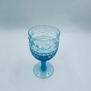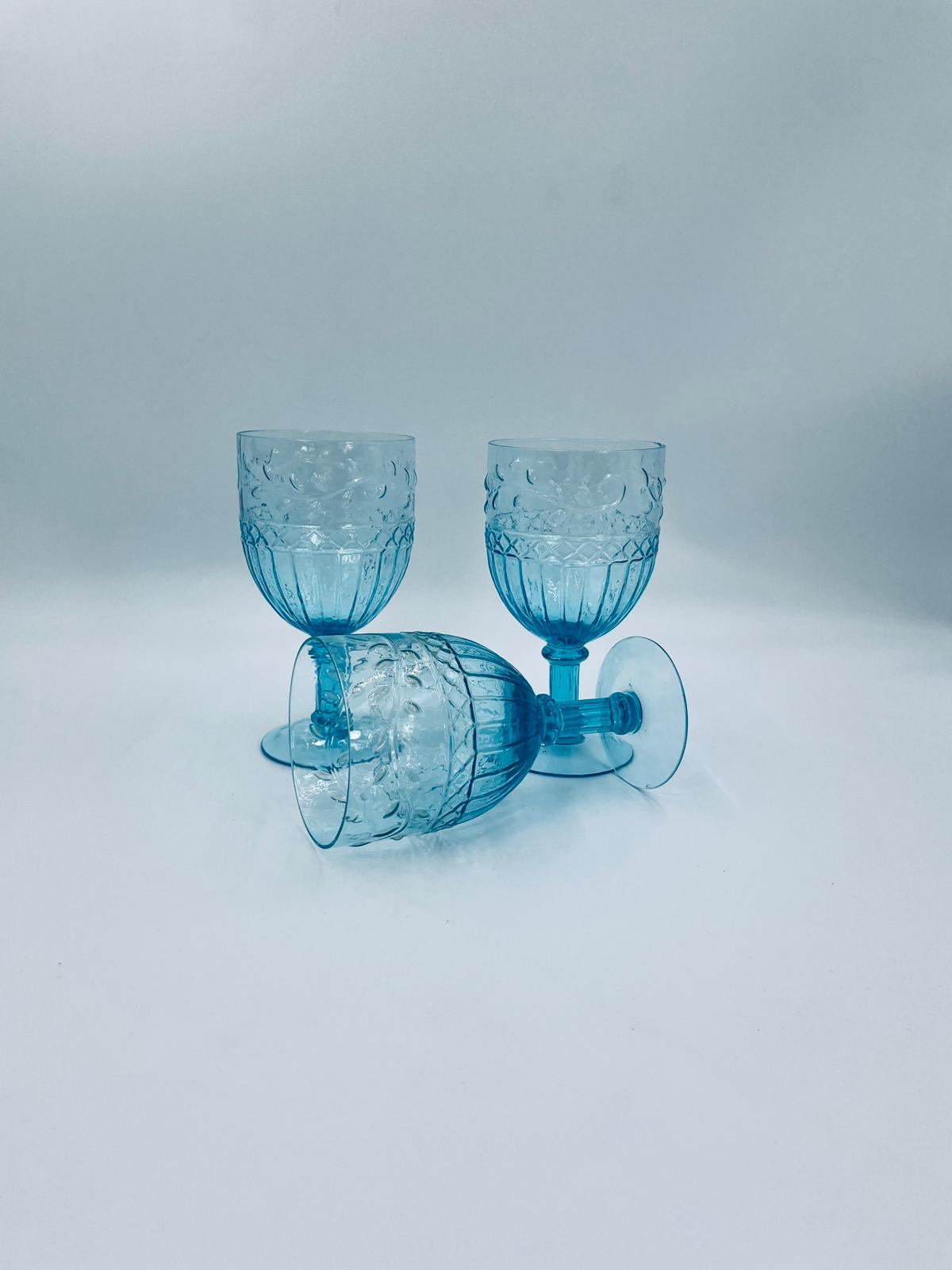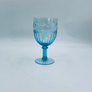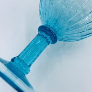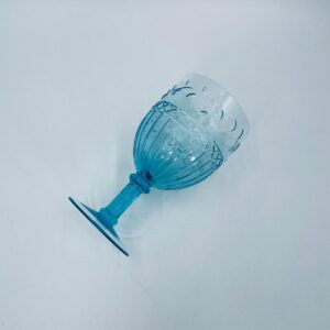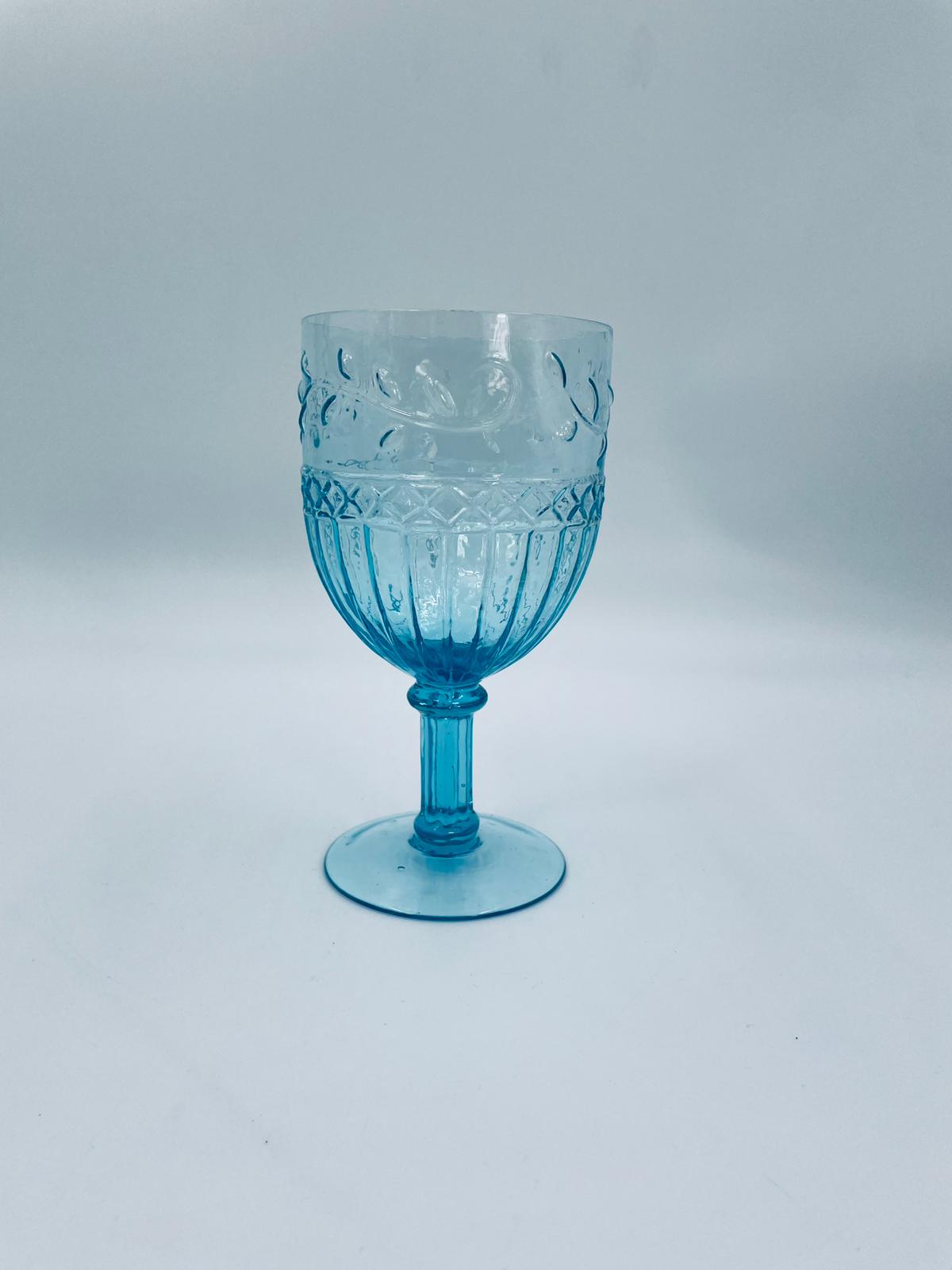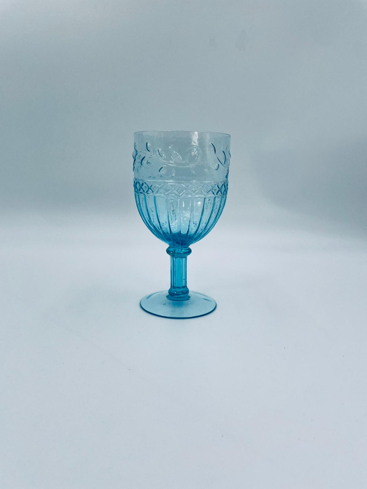 Kielich do wody, pucharek, w stylu Vintage, wykonany z wysokiej jakości szkła. Kielich barwiony w masie na jasnoniebieski kolor, ozdobiony tłoczonym wzorem geometrycznym i roślinnym na czaszy, posiada ozdobną nóżkę oraz stabilną podstawę. Jeden kielich posiada uszczerbek na górnym rancie.