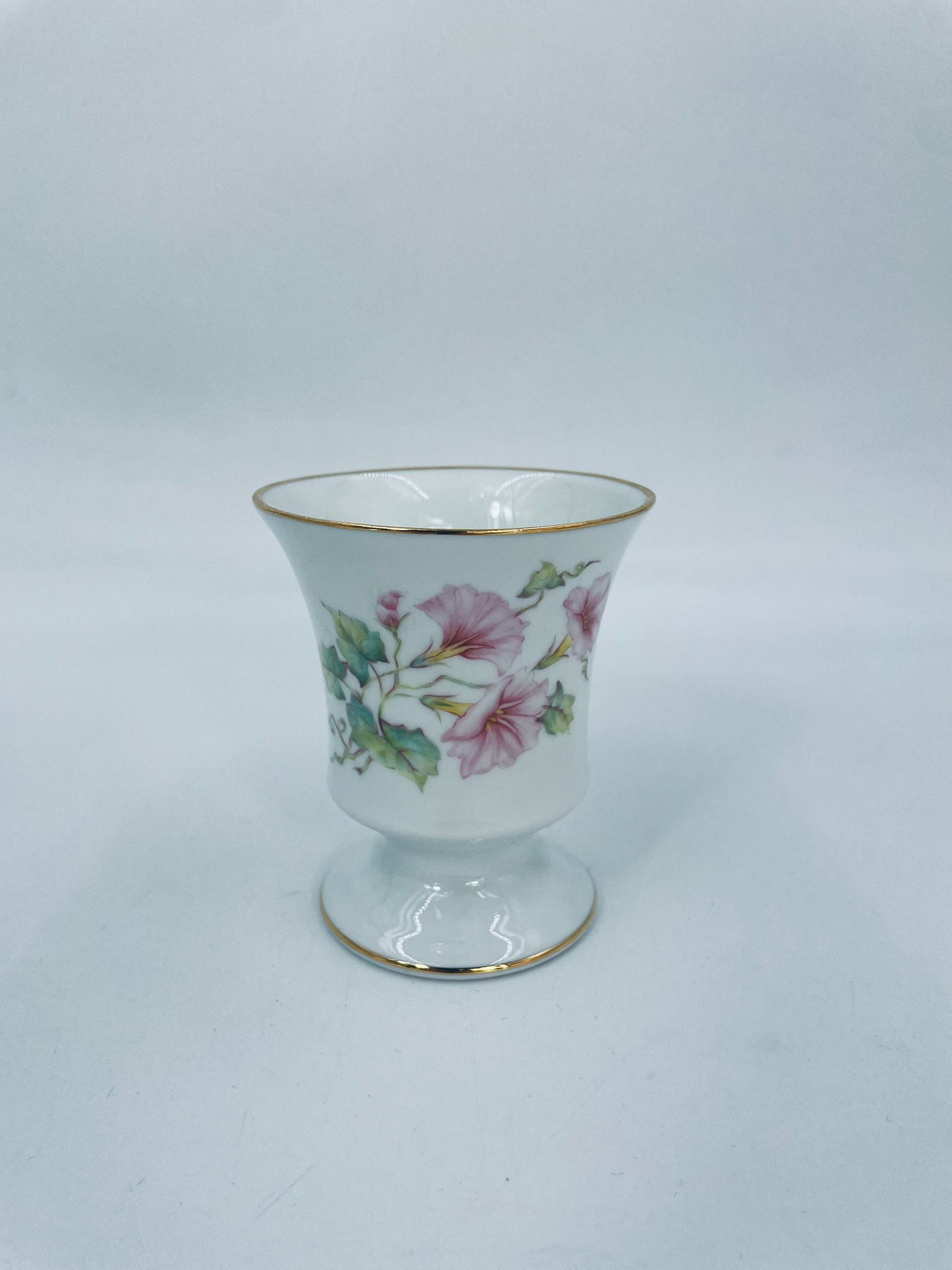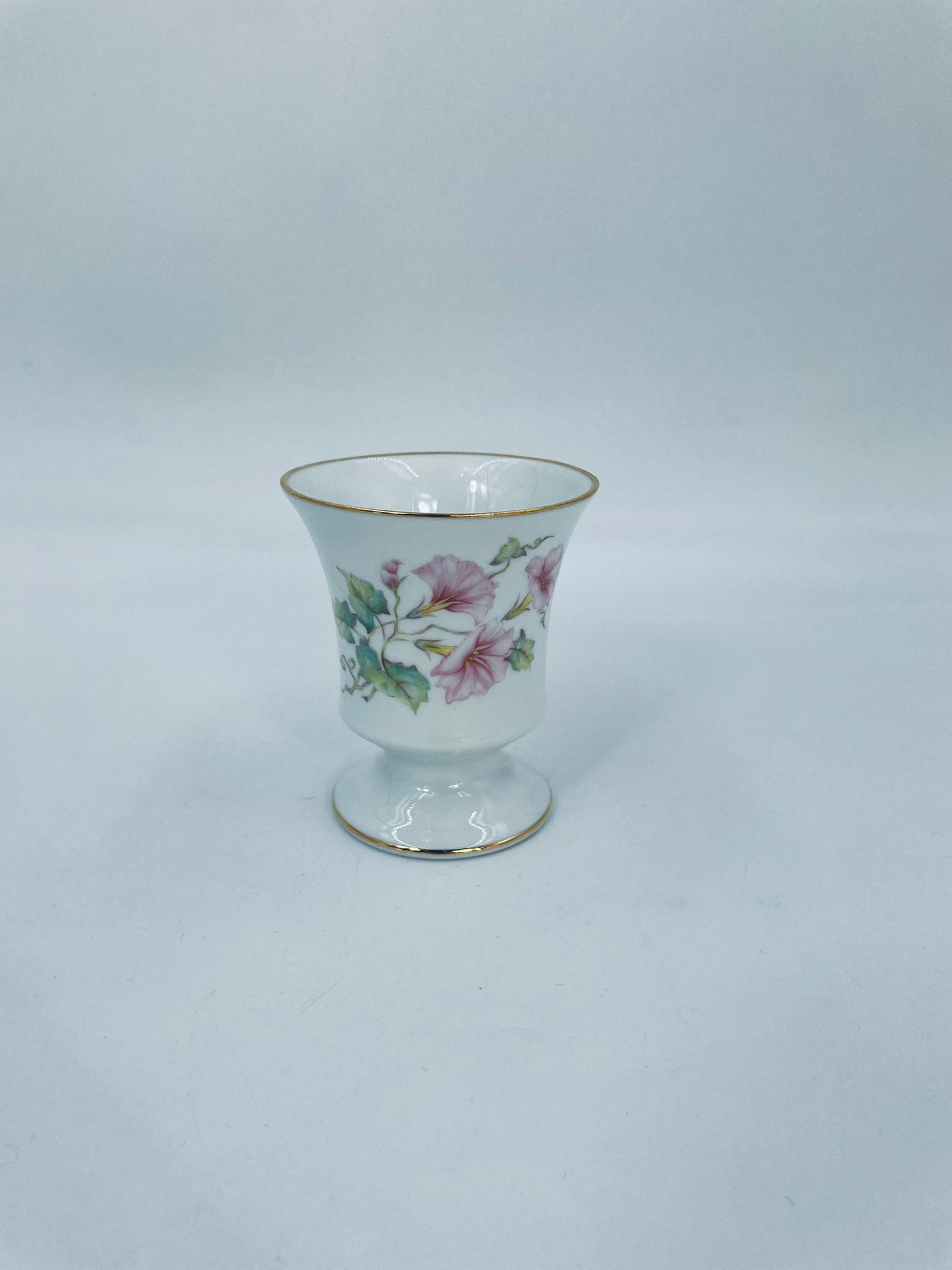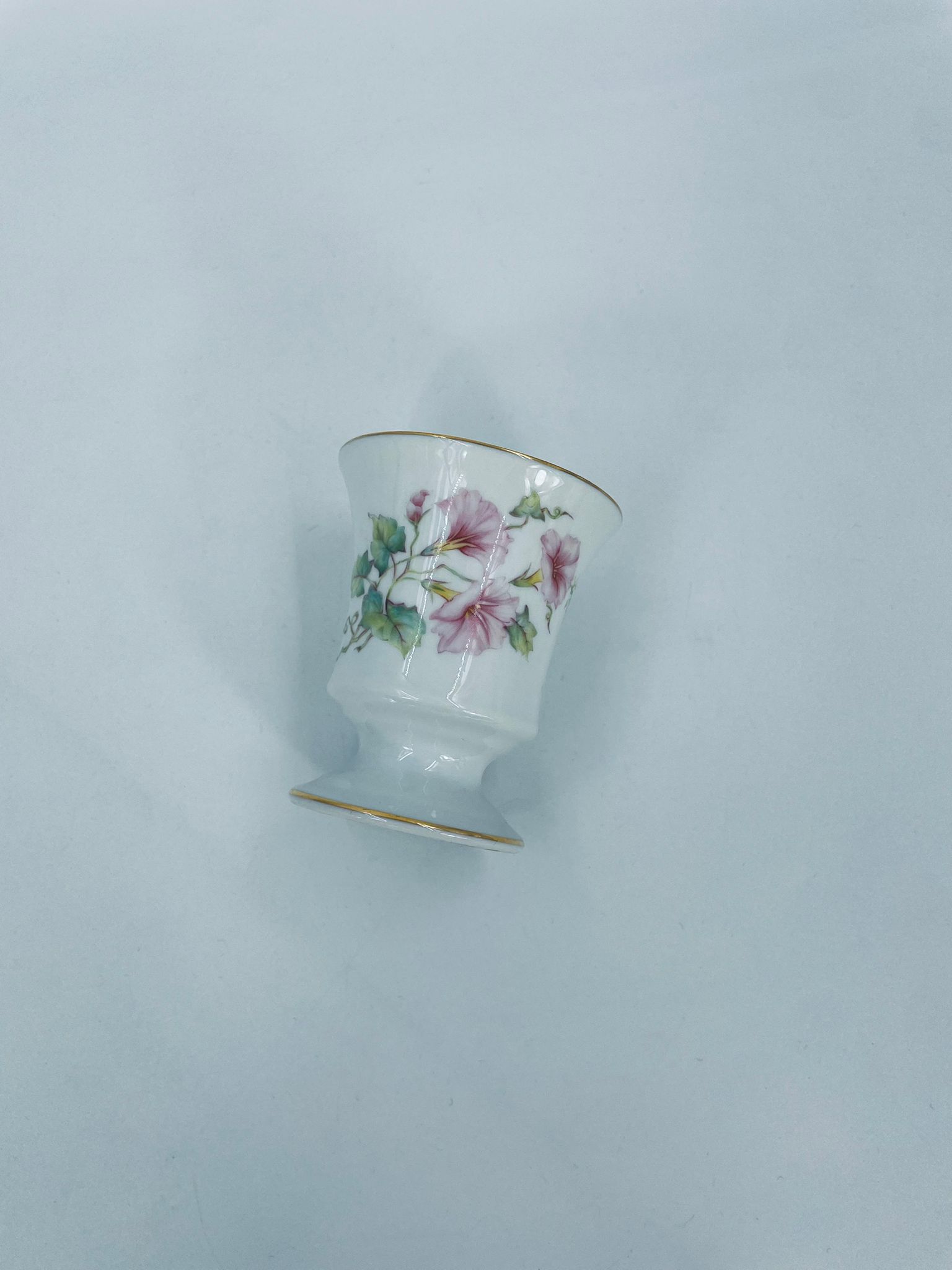 Kielich/ kubek wytwórni Limoges France, wykonany z wysokiej jakości białej porcelany. Kubek ozdobiony delikatnym motywem kwiatków i liści z pozłacanymi krawędziami.