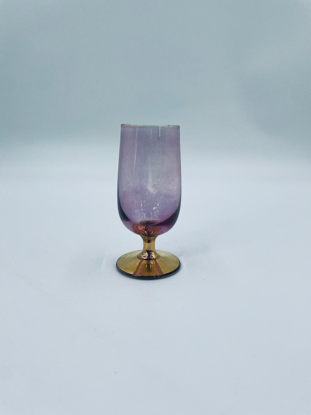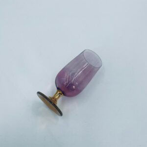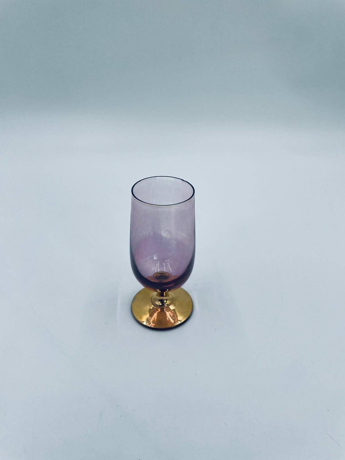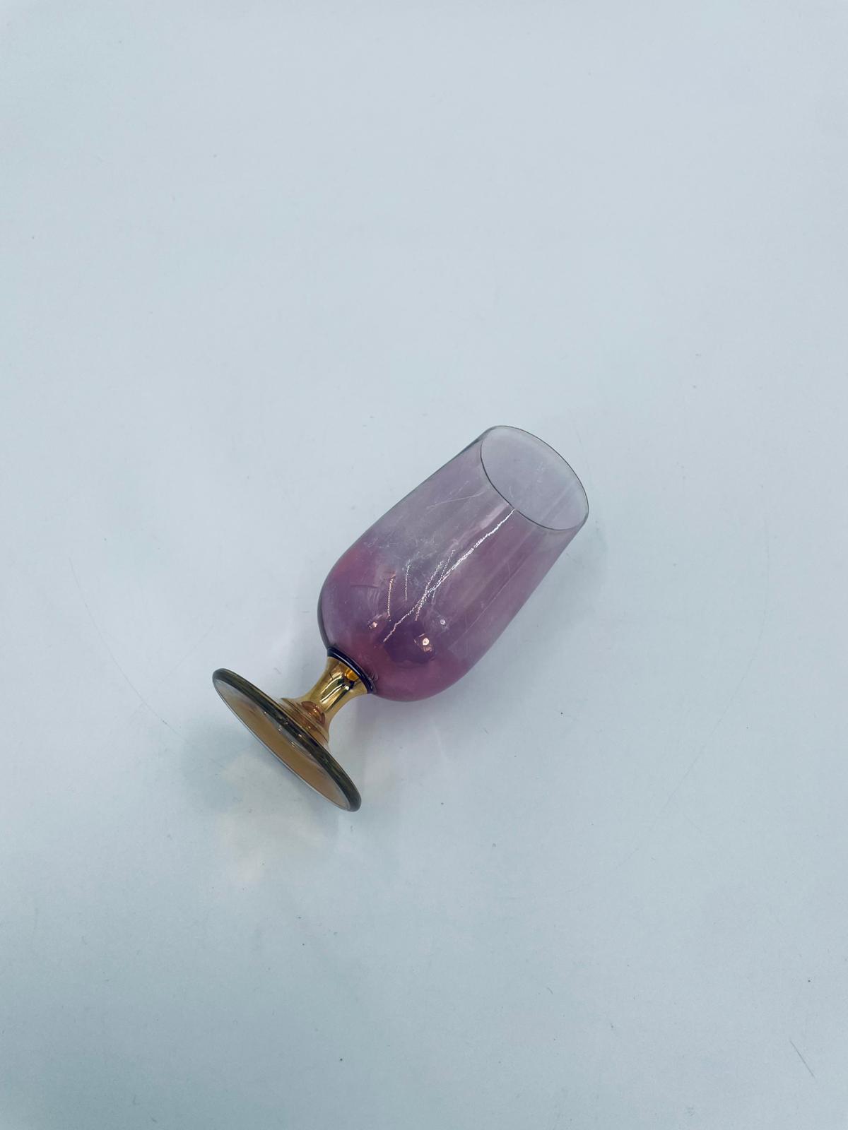 Kieliszek do nalewki w stylu Vintage, wykonany z wysokiej jakości szkła kryształowego. Kieliszek barwiony na kolor liliowy ze złota nóżka i podstawa. Posiada przetarcie i mały uszczerbek na górnym rancie.