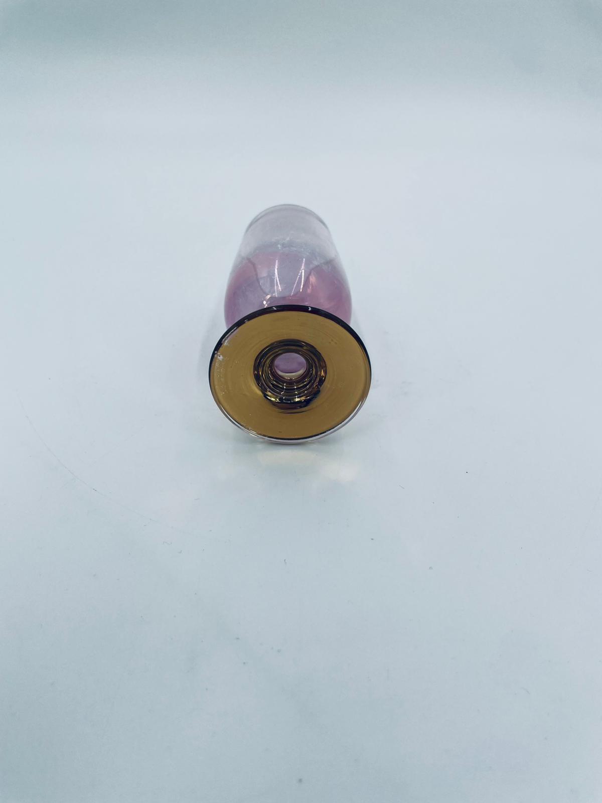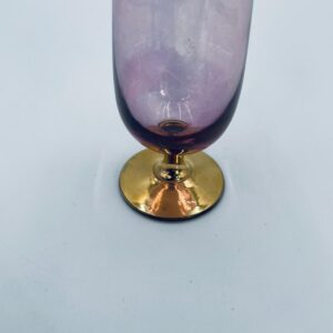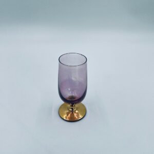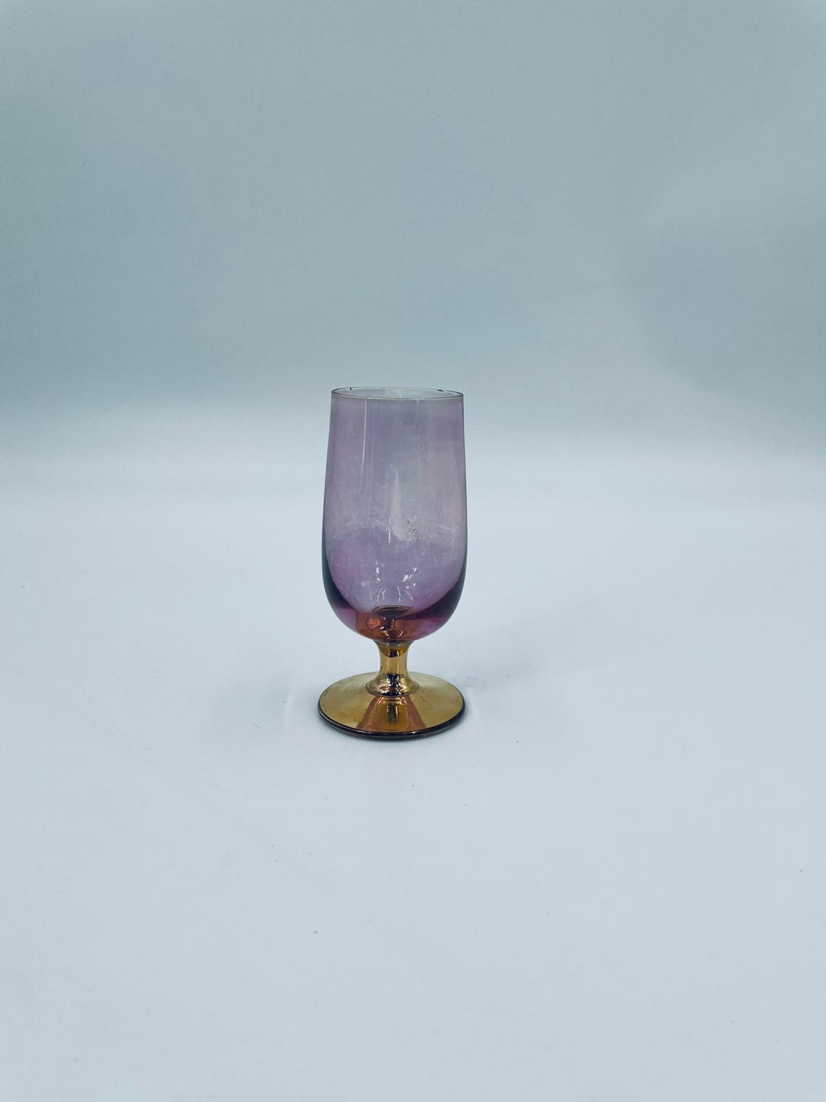 Kieliszek do nalewki w stylu Vintage, wykonany z wysokiej jakości szkła kryształowego. Kieliszek barwiony na kolor liliowy ze złota nóżka i podstawa. Posiada przetarcie i mały uszczerbek na górnym rancie.