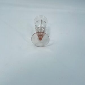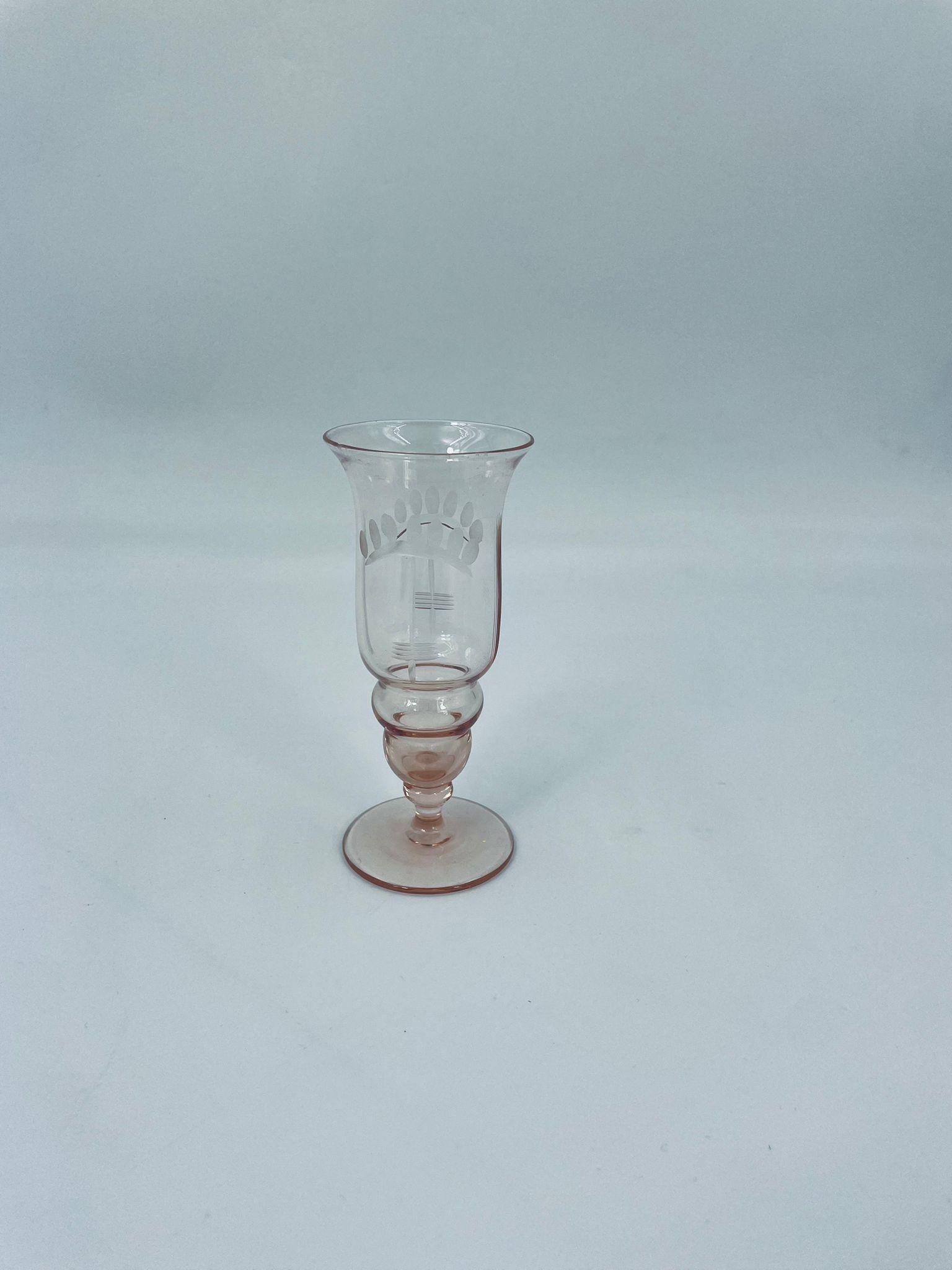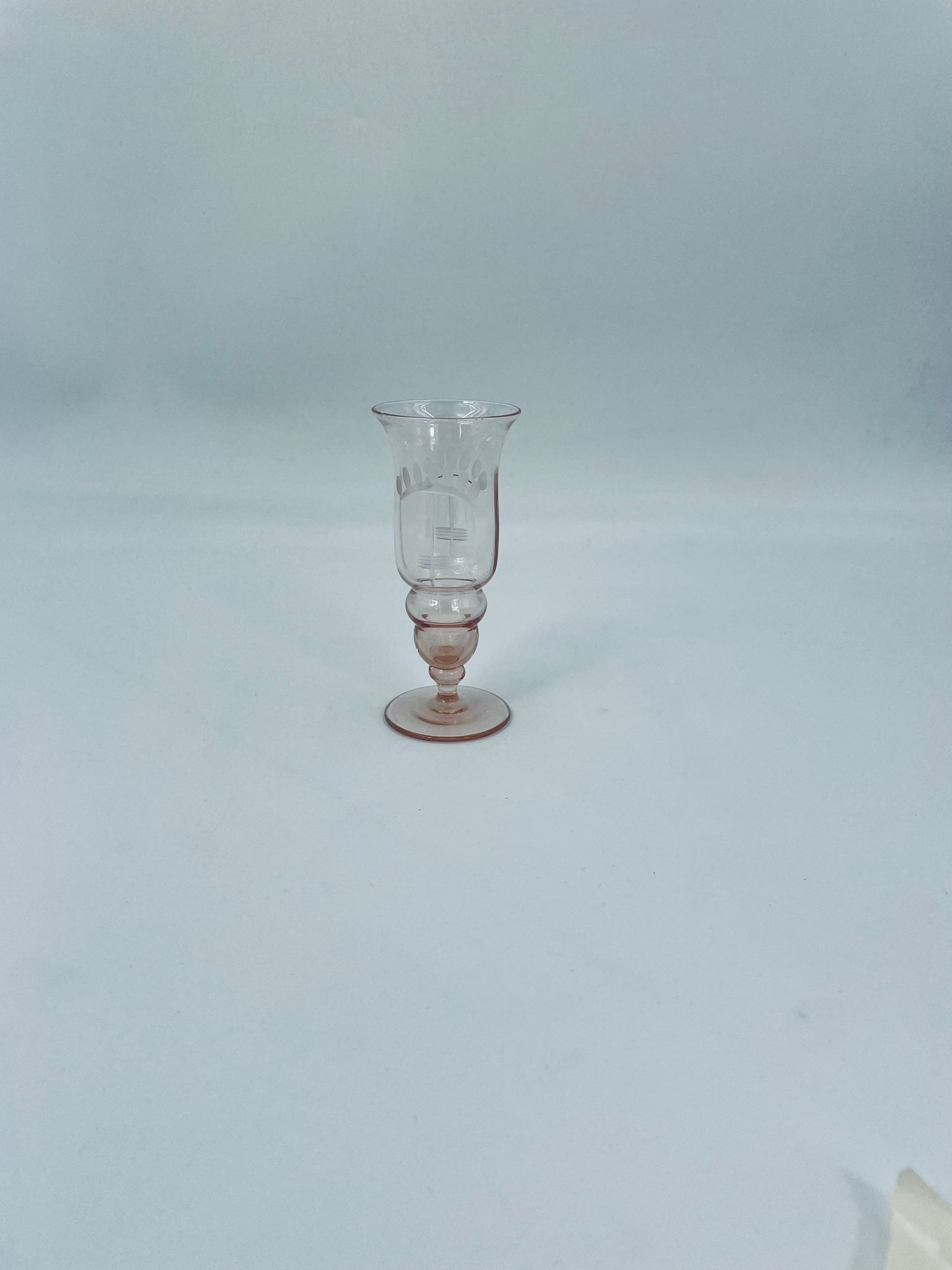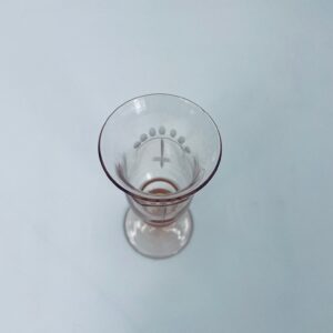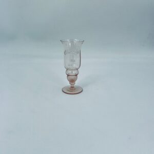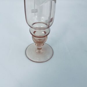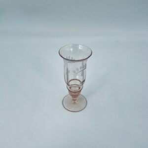 Kieliszek do nalewki w stylu Vintage, wykonany ze szkła ręcznie dmuchanego. Charakteryzuje się kolorem łososiowym, ozdobnym wzorem oraz ozdobna nóżka.