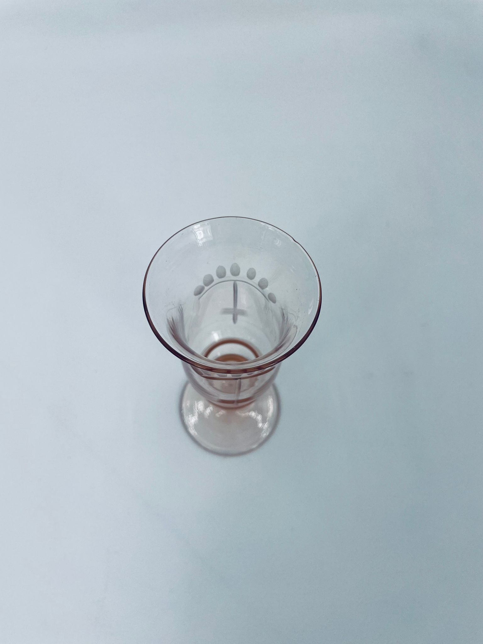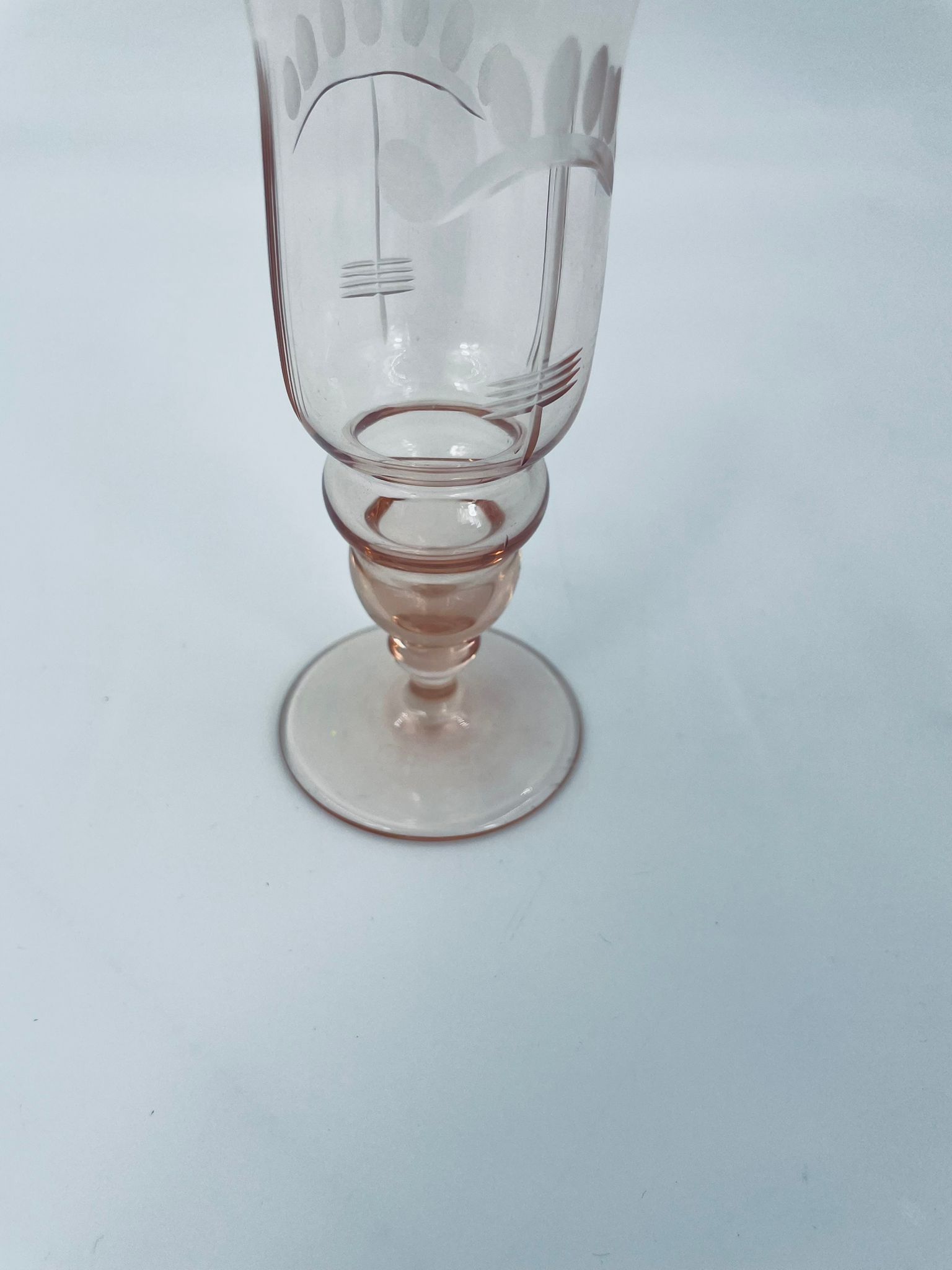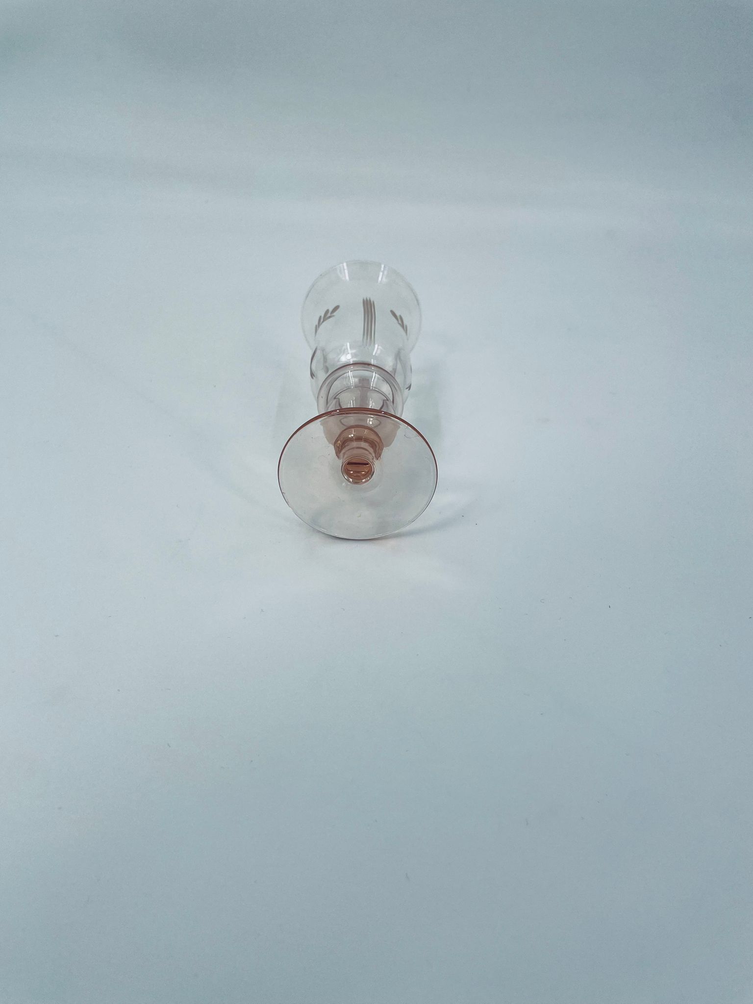 Kieliszek do nalewki w stylu Vintage, wykonany ze szkła ręcznie dmuchanego. Charakteryzuje się kolorem łososiowym, ozdobnym wzorem oraz ozdobna nóżka.