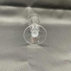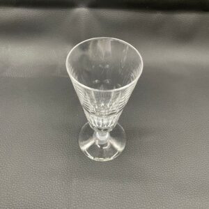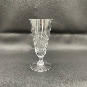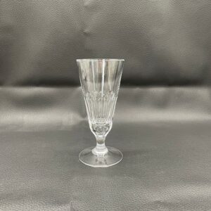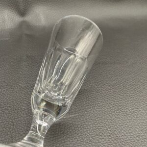 Kieliszek do szampana, koktajli w stylu Vintage, wykonany z wysokie jakości szkła kryształowego. Kielich przezroczysty, charakteryzuje się ozdobnymi fasetami na czarce, krótka nóżka oraz stabilna podstawa. Posiada zarysowania.
