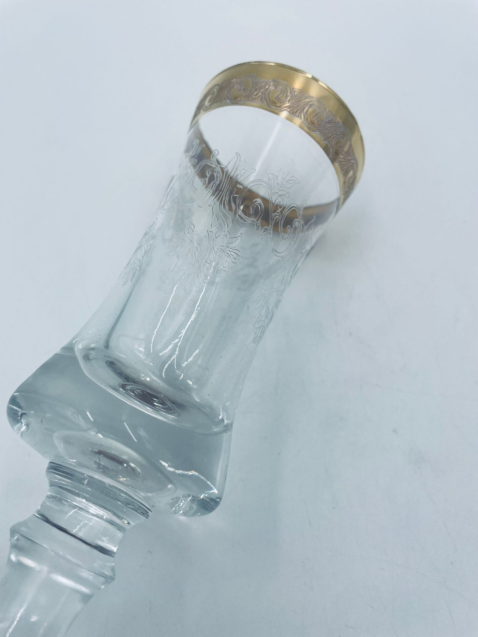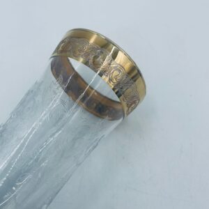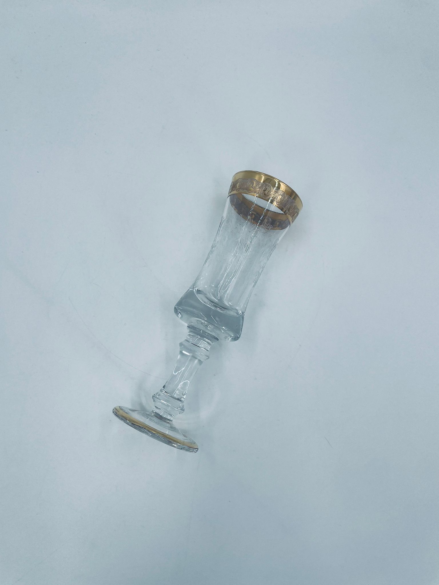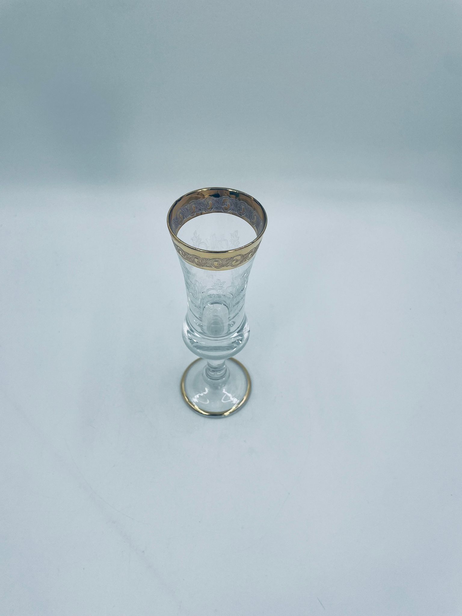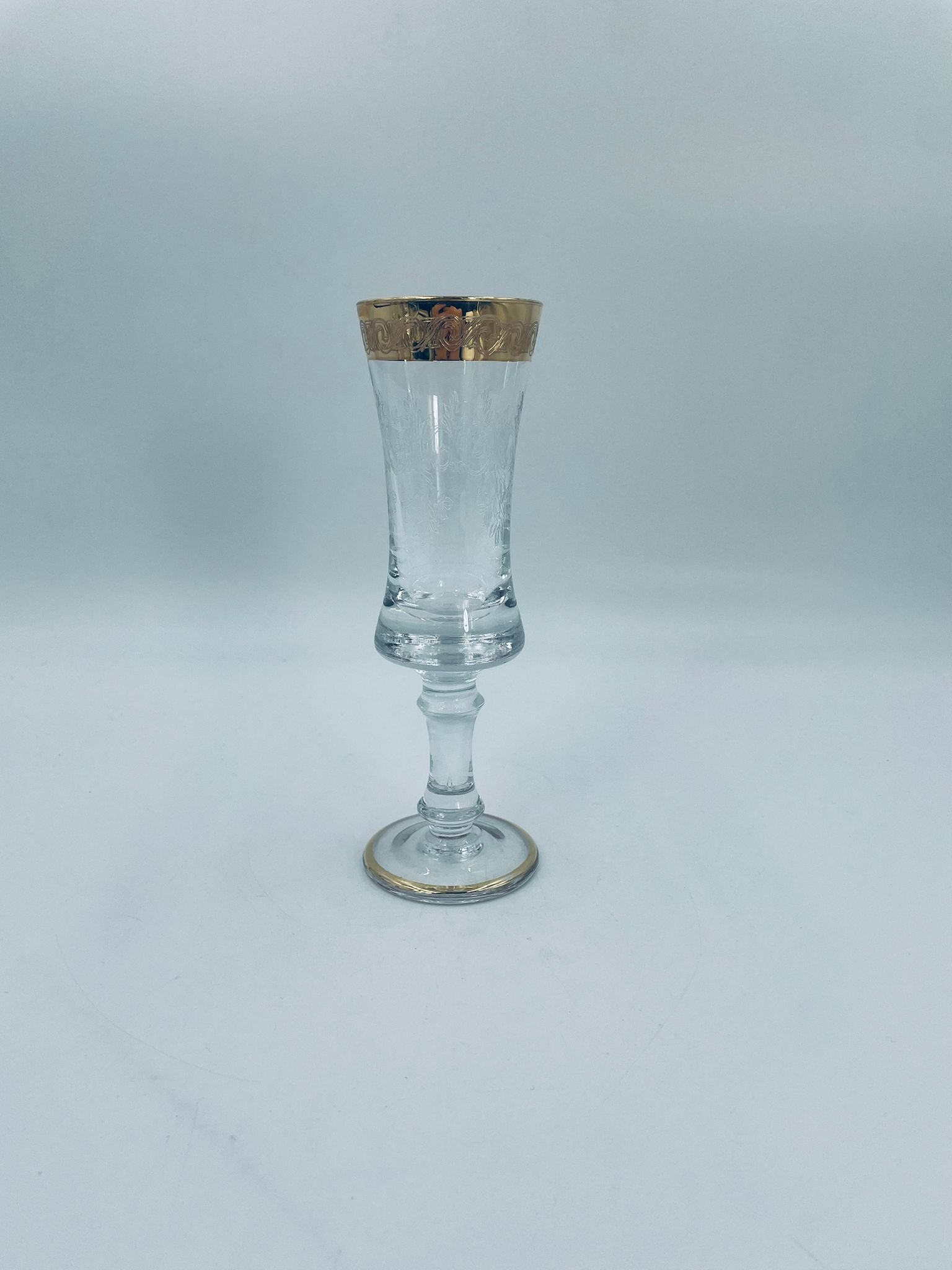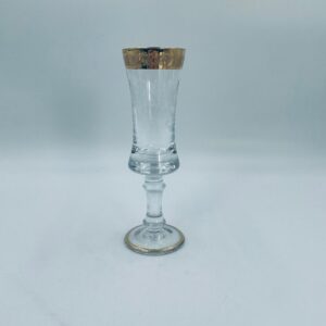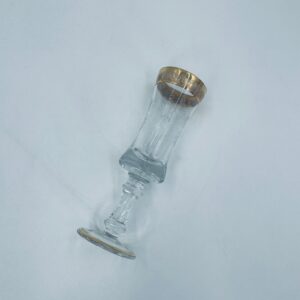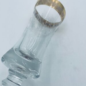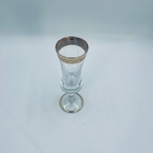 Kieliszek do szampana Włoskiego pochodzenia Murano z kolekcji Murano „Medici” , wykonany z wysokiej jakości szkła kryształowego. Kieliszek charakteryzuje się ozdobna czarą z grawerowanym roślinnym oranamentem wykonanym techniką pantografi i szeroką, błyszczącą złotką obwódką z 24karatowym złotem, posiada ozdobną, smukłą nóżkę oraz stabilną podstawę wykończona złoceniem. Posiada małe przetarcie na złoceniu.