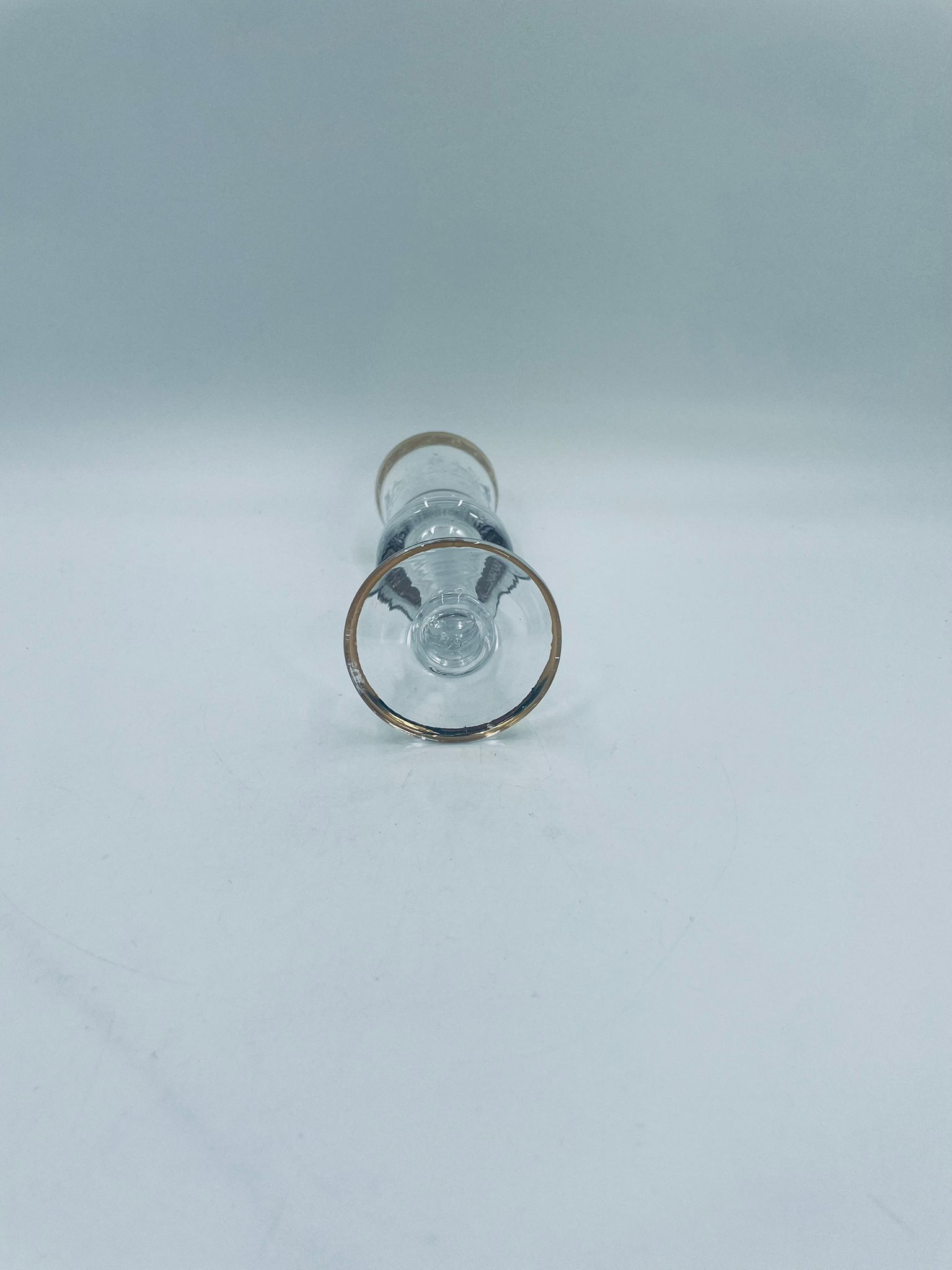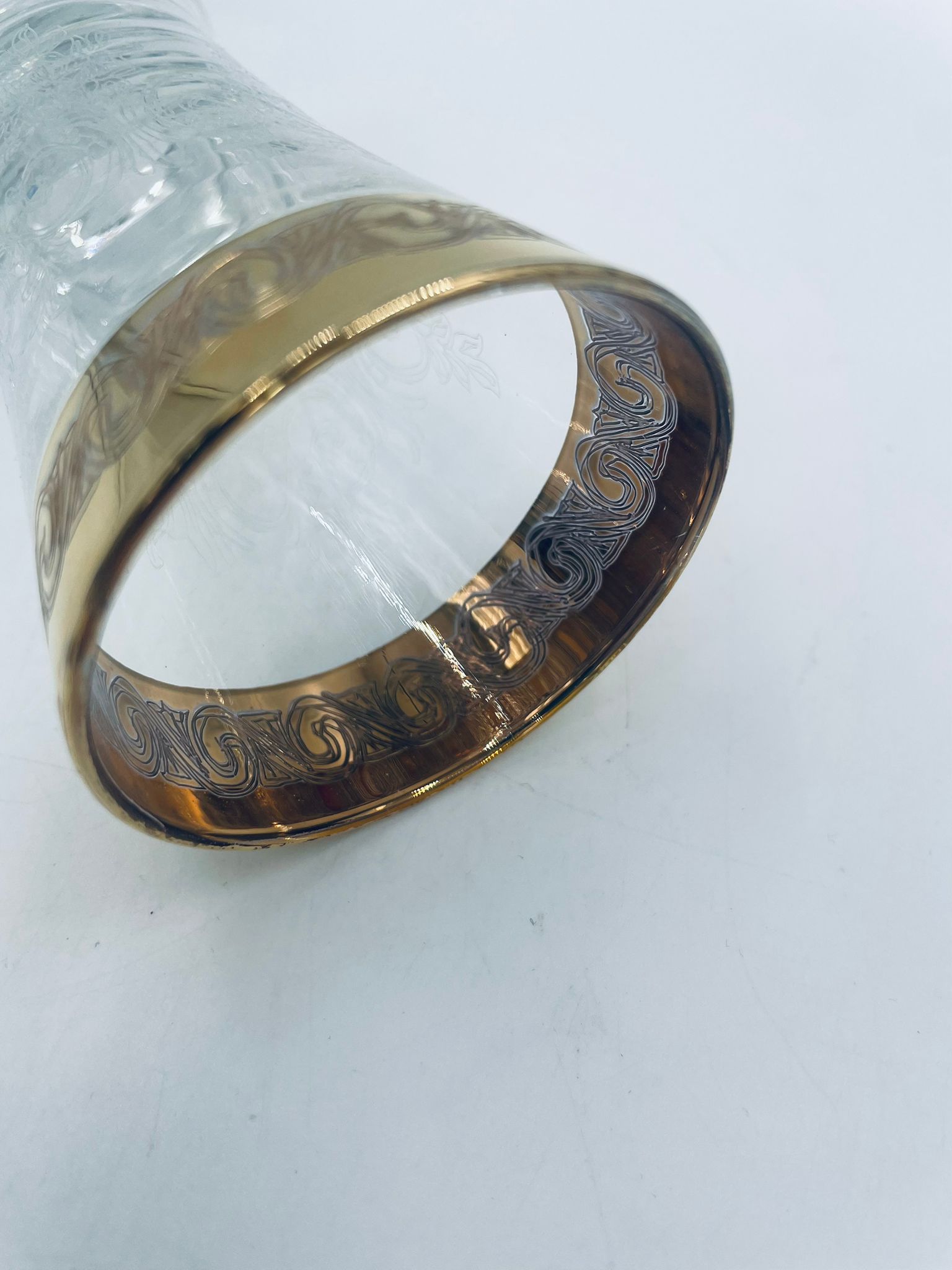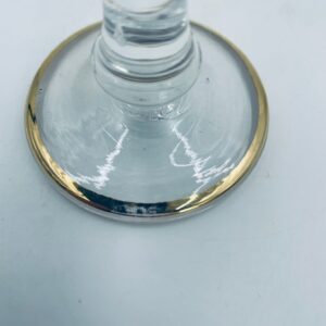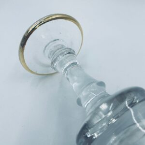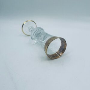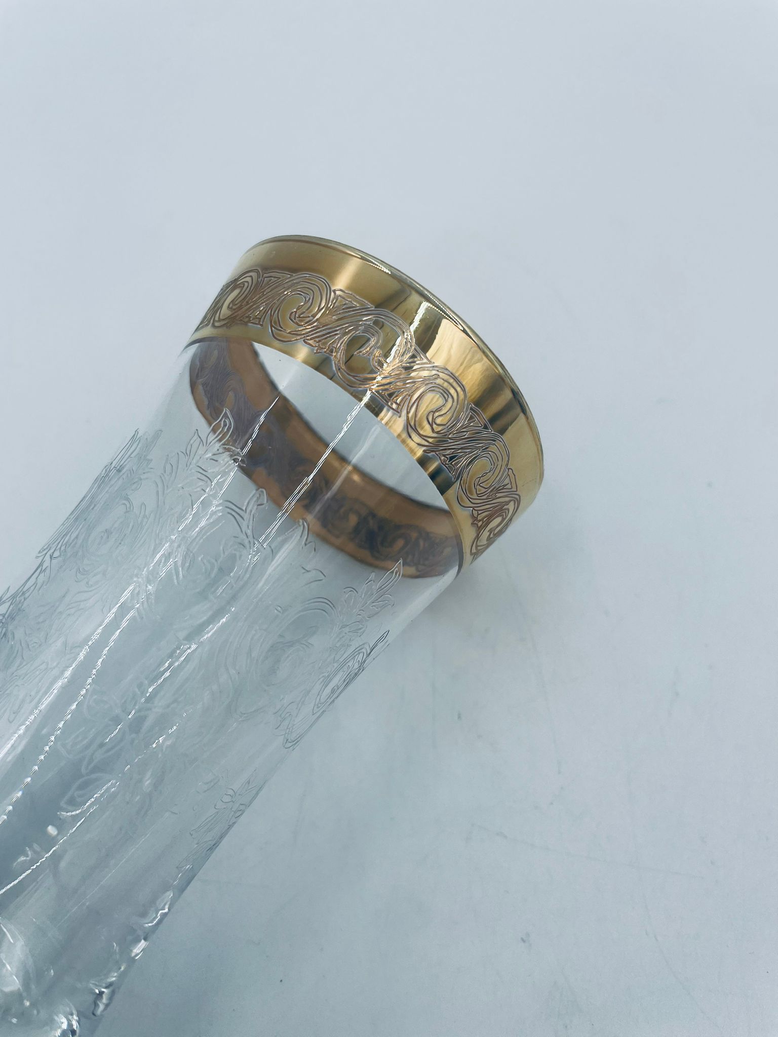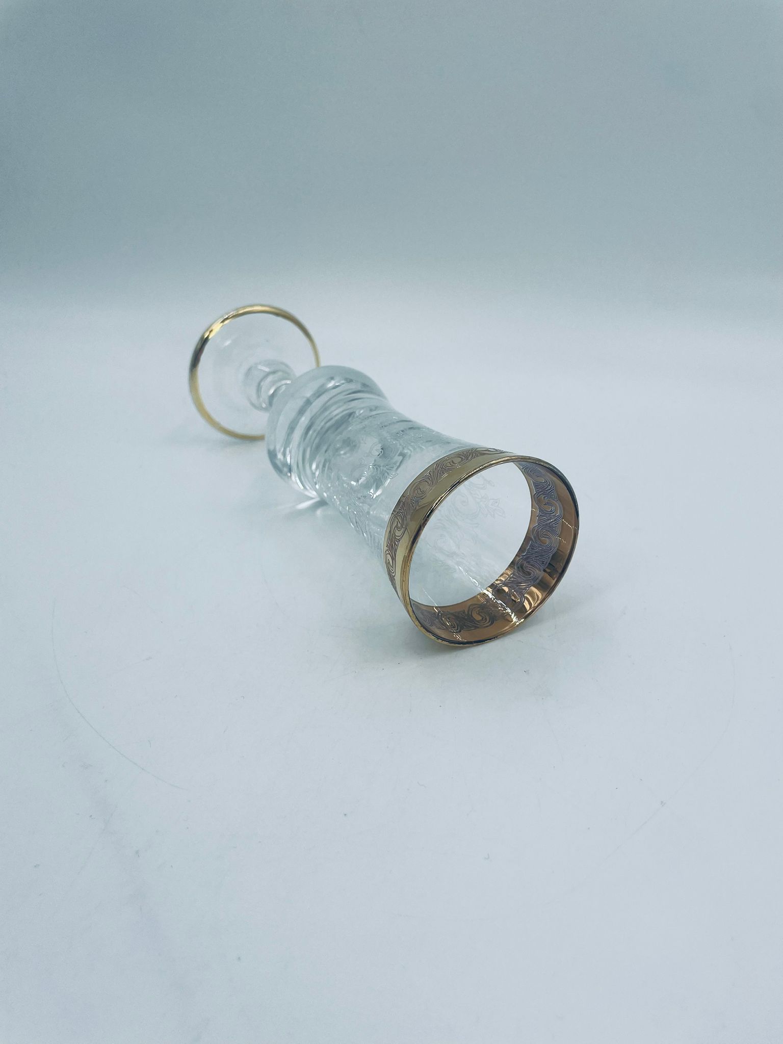 Kieliszek do szampana Włoskiego pochodzenia Murano z kolekcji Murano „Medici” , wykonany z wysokiej jakości szkła kryształowego. Kieliszek charakteryzuje się ozdobna czarą z grawerowanym roślinnym oranamentem wykonanym techniką pantografi i szeroką, błyszczącą złotką obwódką z 24karatowym złotem, posiada ozdobną, smukłą nóżkę oraz stabilną podstawę wykończona złoceniem. Posiada małe przetarcie na złoceniu.