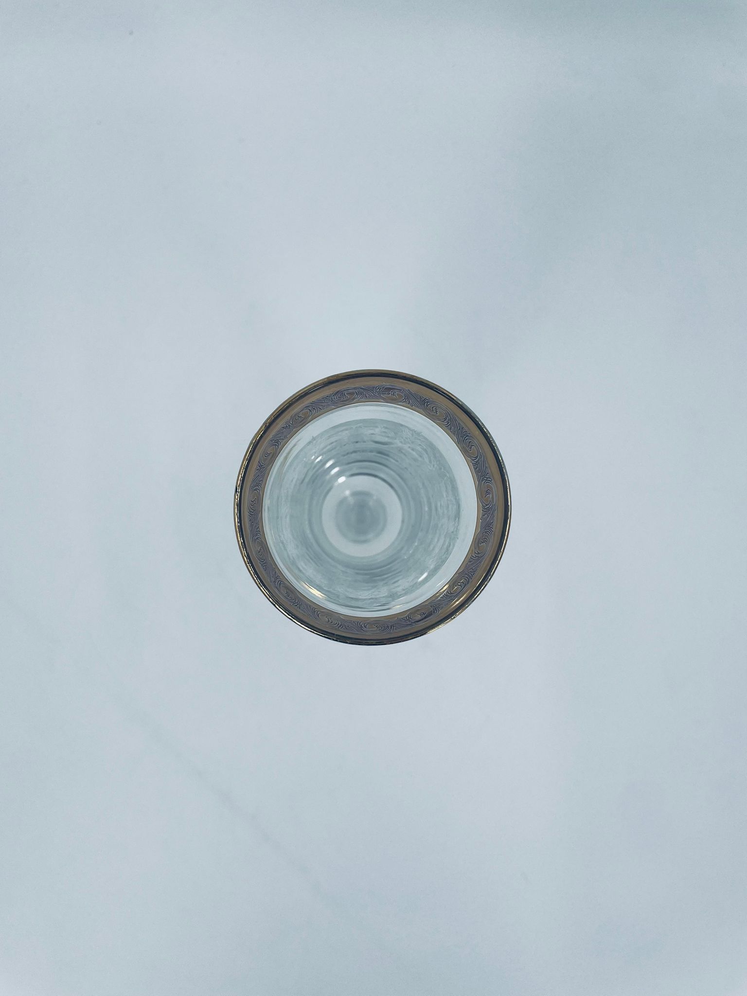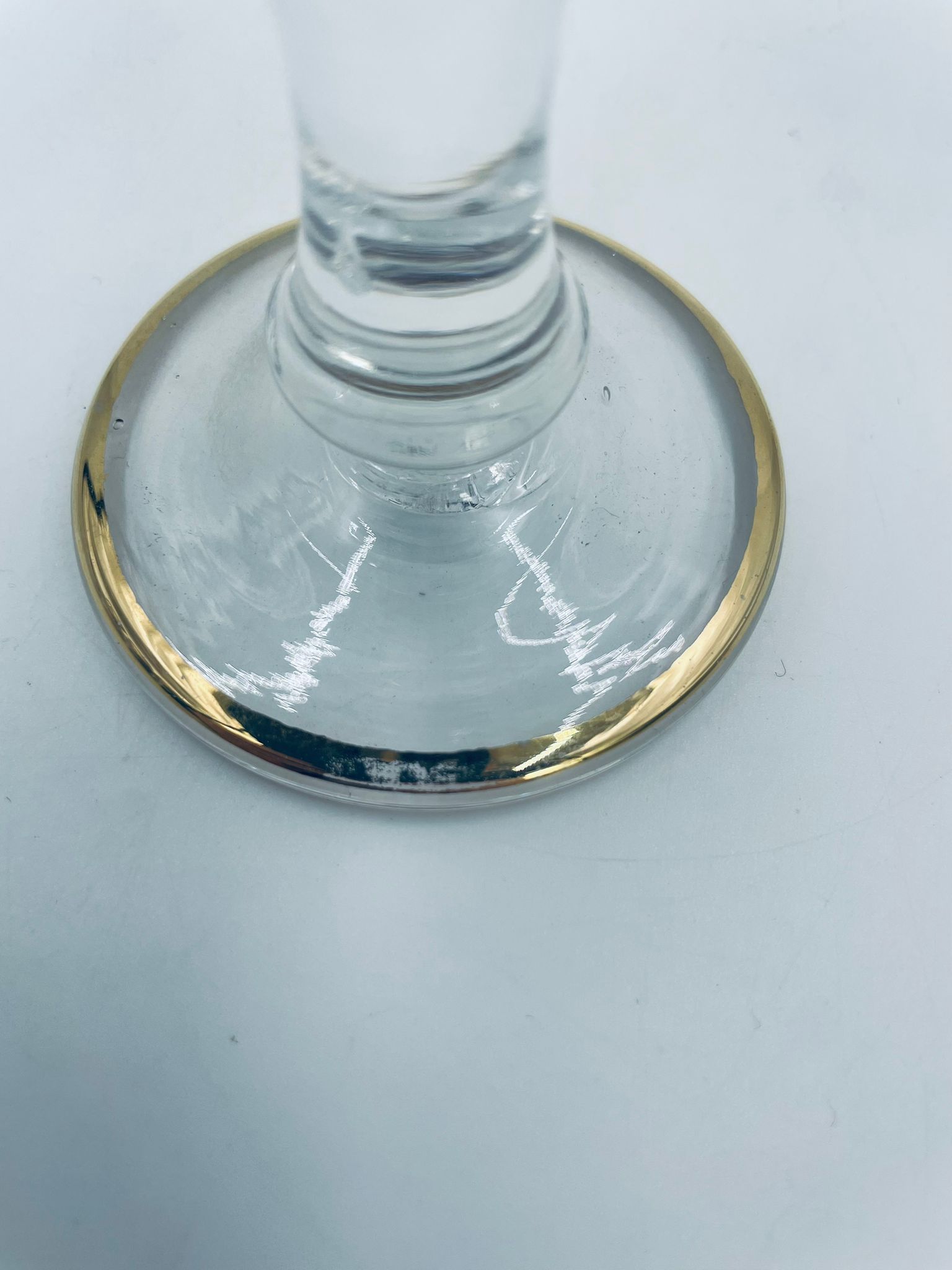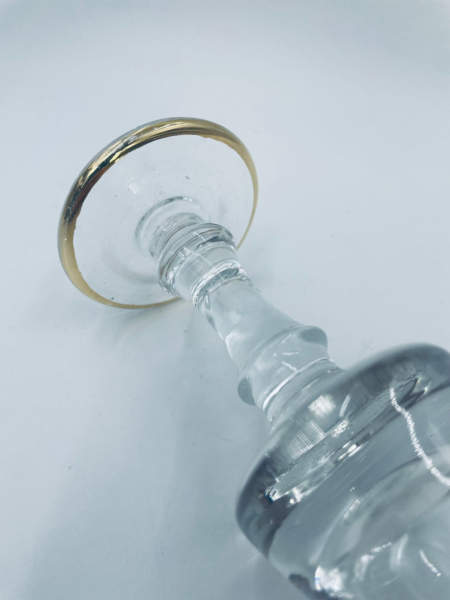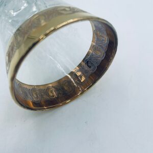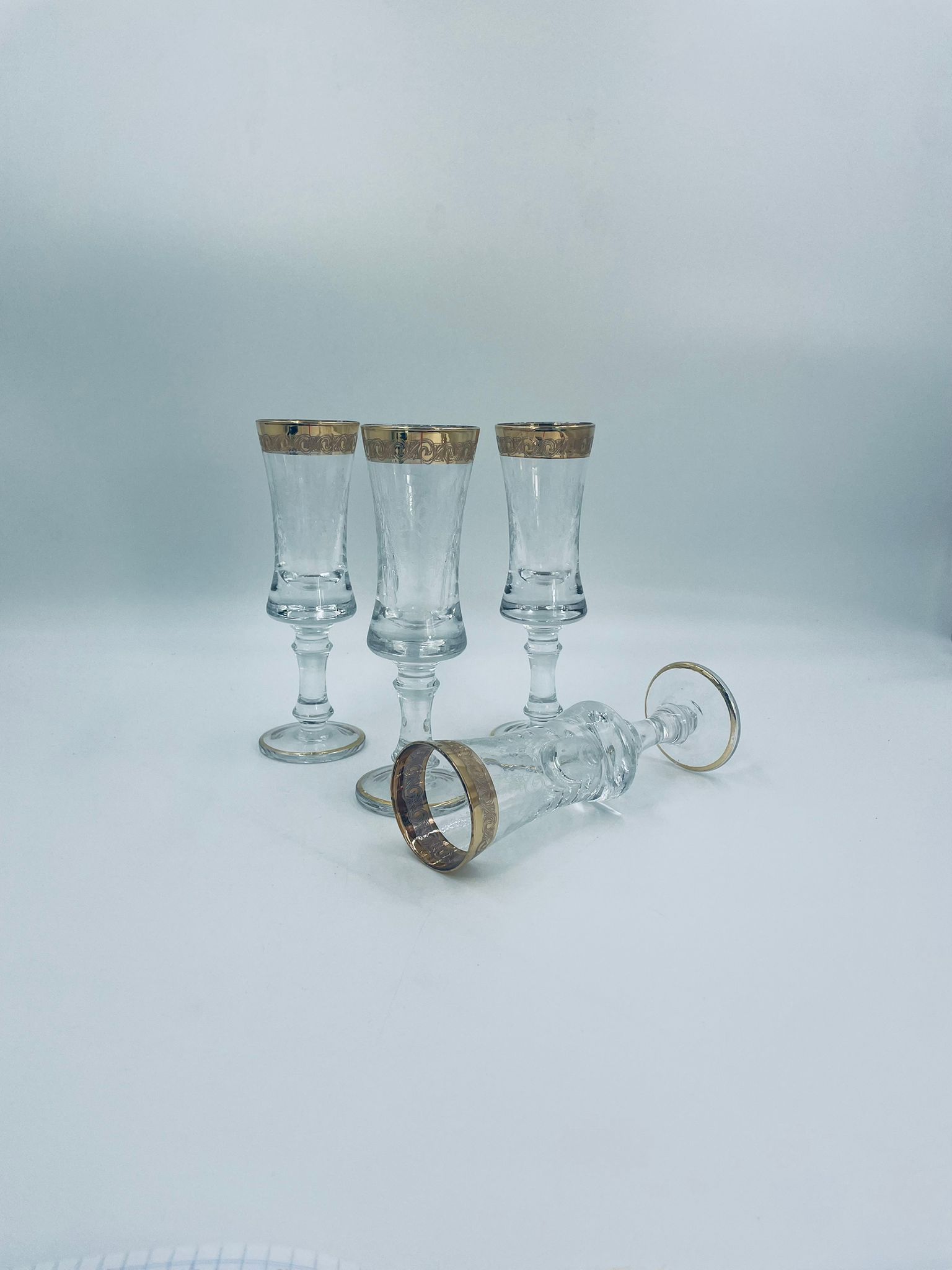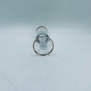 Kieliszek do szampana Włoskiego pochodzenia Murano z kolekcji Murano „Medici” , wykonany z wysokiej jakości szkła kryształowego. Kieliszek charakteryzuje się ozdobna czarą z grawerowanym roślinnym oranamentem wykonanym techniką pantografi i szeroką, błyszczącą złotką obwódką z 24karatowym złotem, posiada ozdobną, smukłą nóżkę oraz stabilną podstawę wykończona złoceniem. Posiada małe przetarcie na złoceniu.