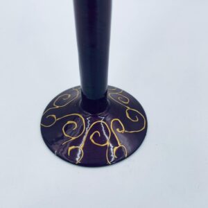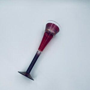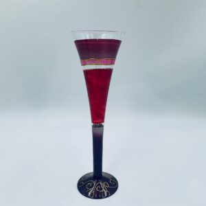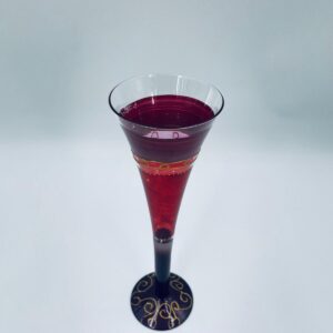 Kieliszek do szampana w stylu Vintage, wykonany z wysokiej jakości szkła. Kieliszek ręcznie malowany na fioletowo-bordowy kolor ze złotymi akcentami. Posiada otarcie na kolorze.