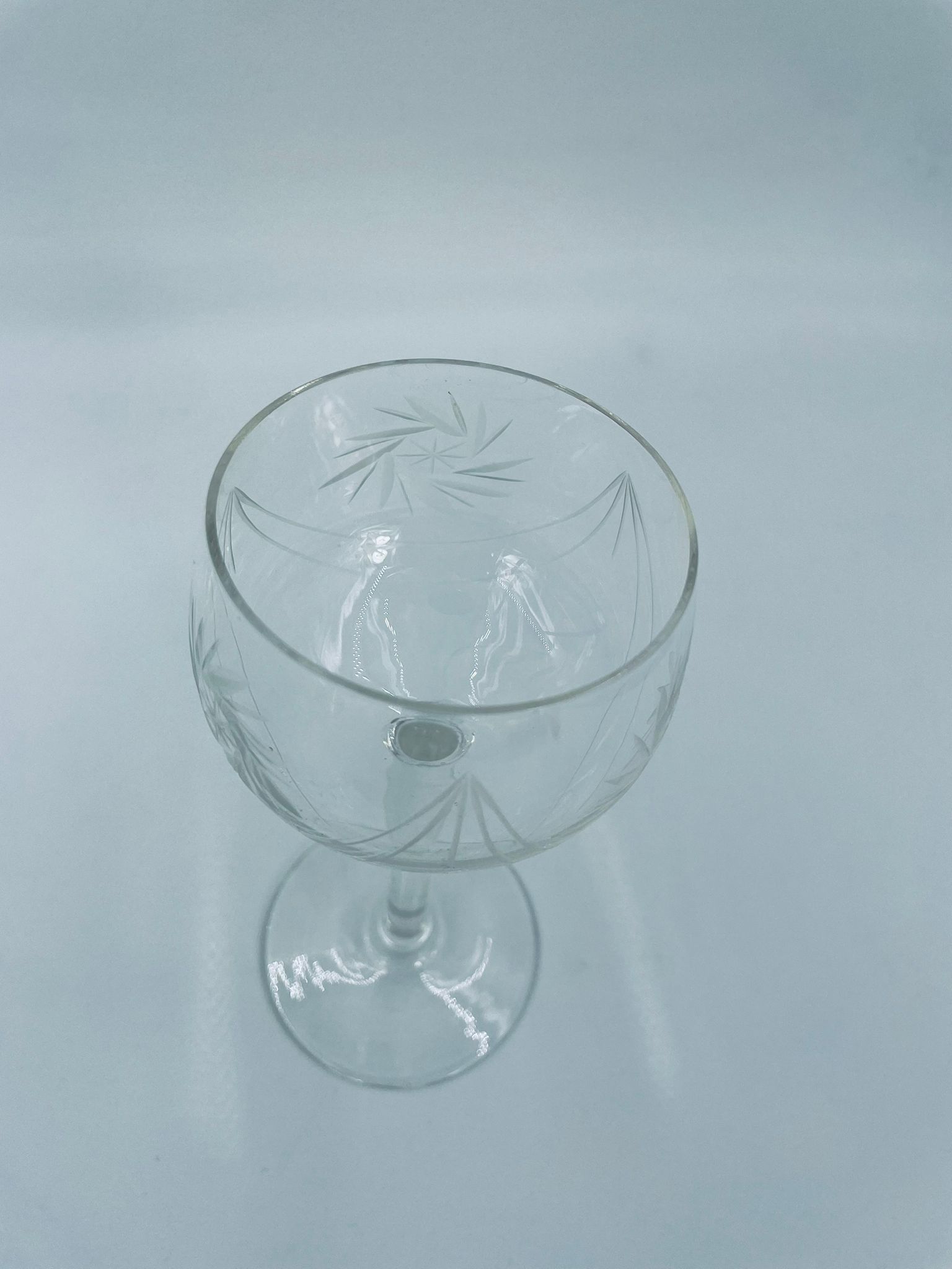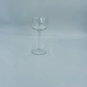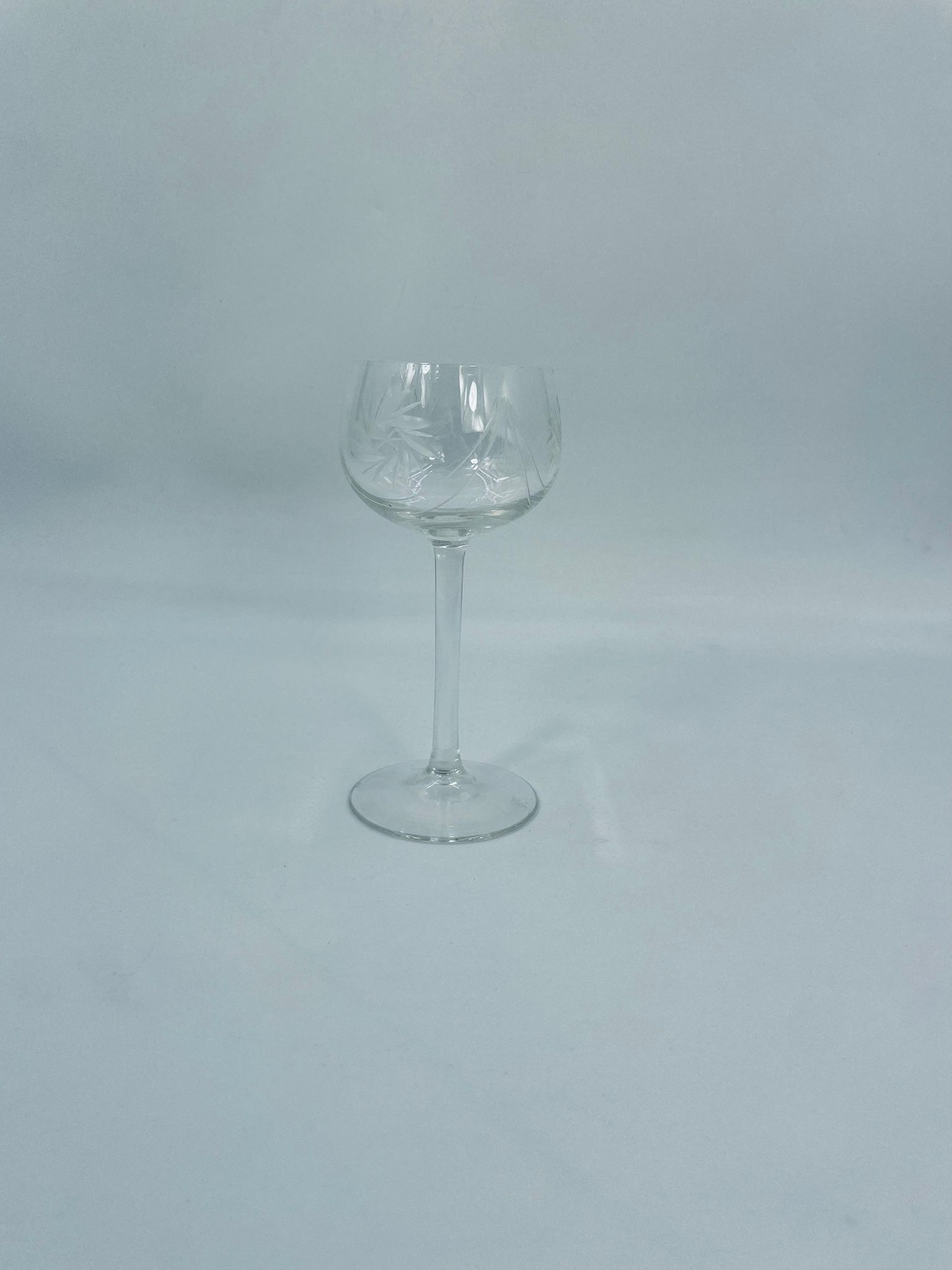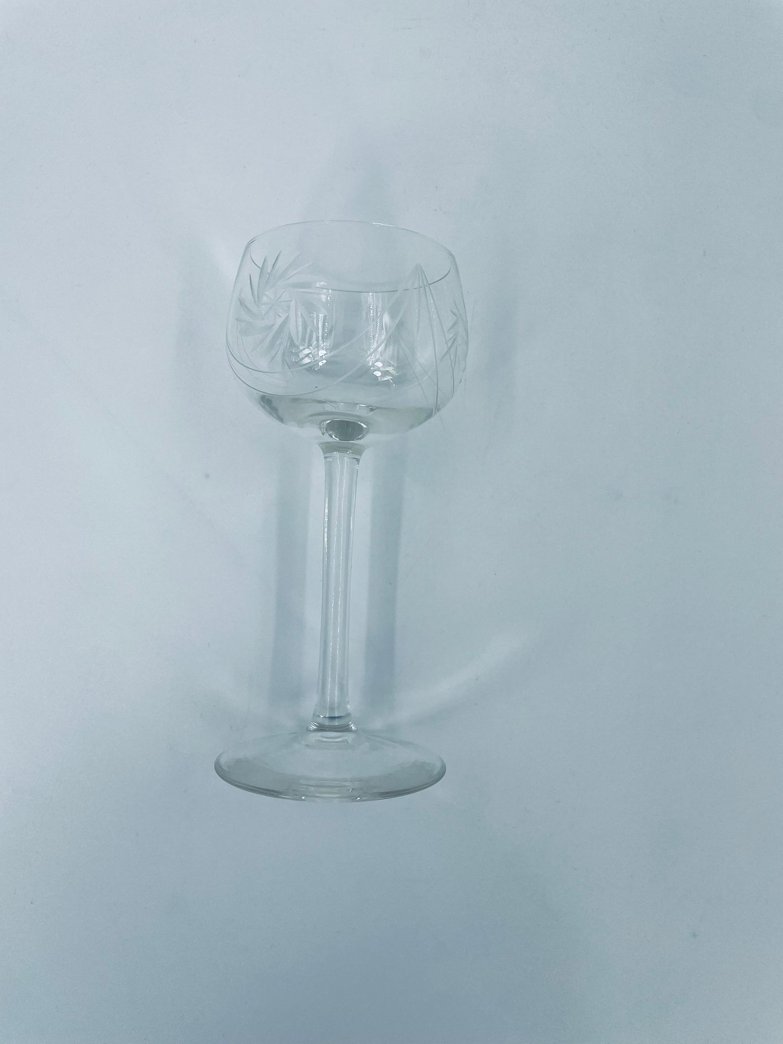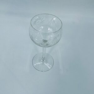 Zabytkowy kieliszek do wina, wykonany z wysokiej jakości szkła kryształowego, przezroczystego. Czara posiada dekoracyjny, szlifowany wzór, nóżka długa ze stabilną podstawą.