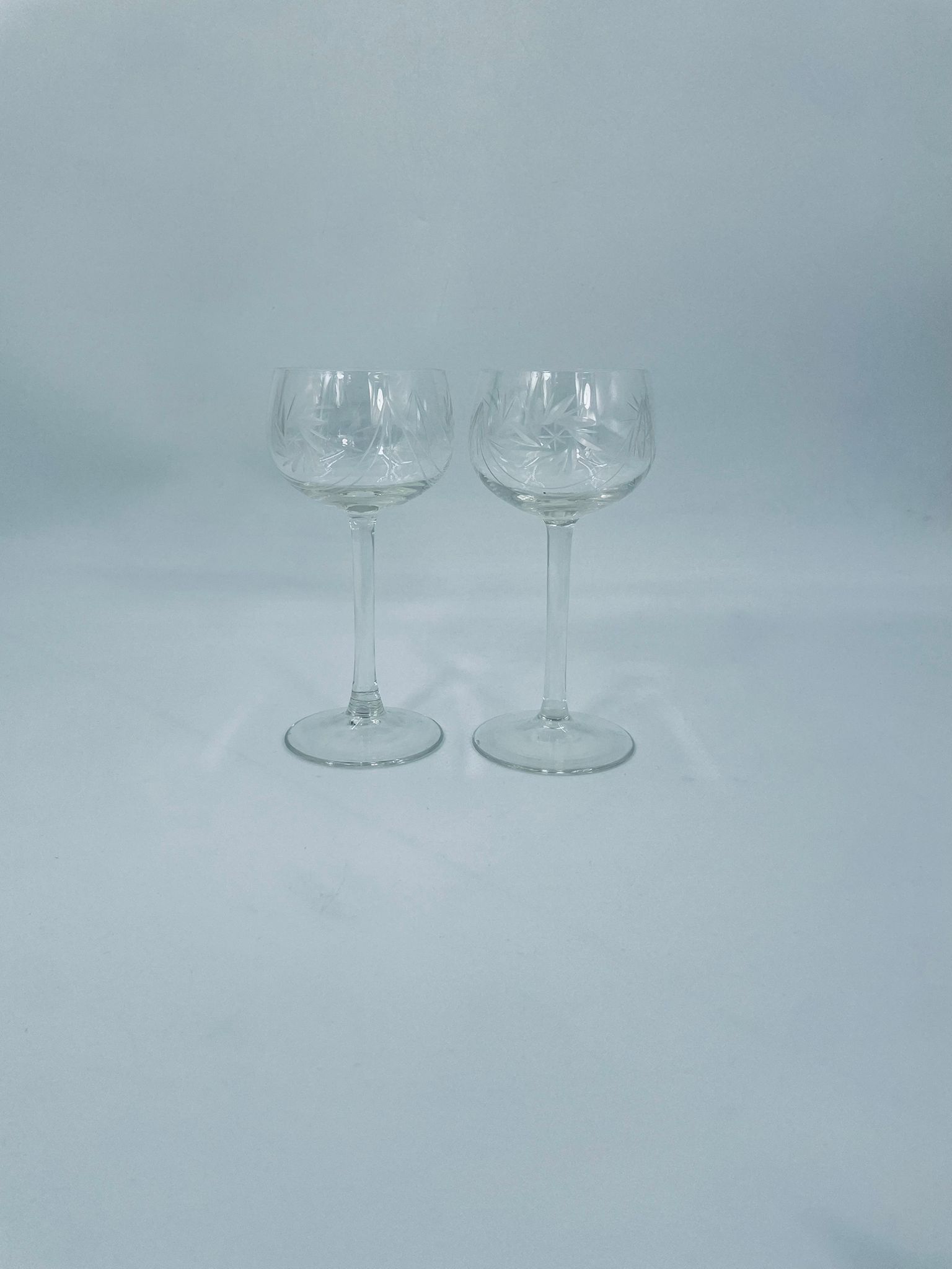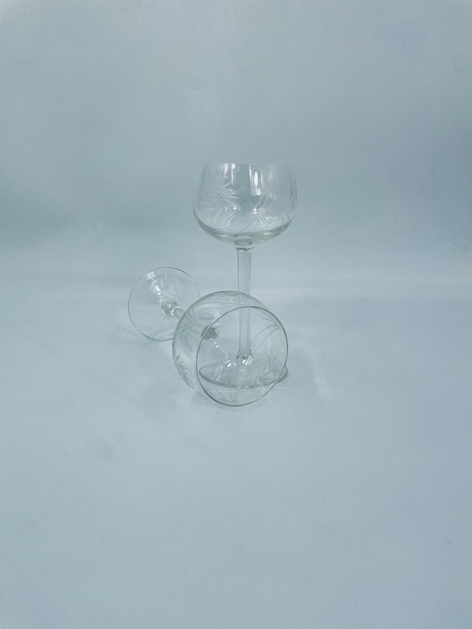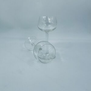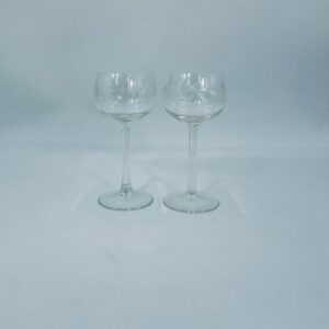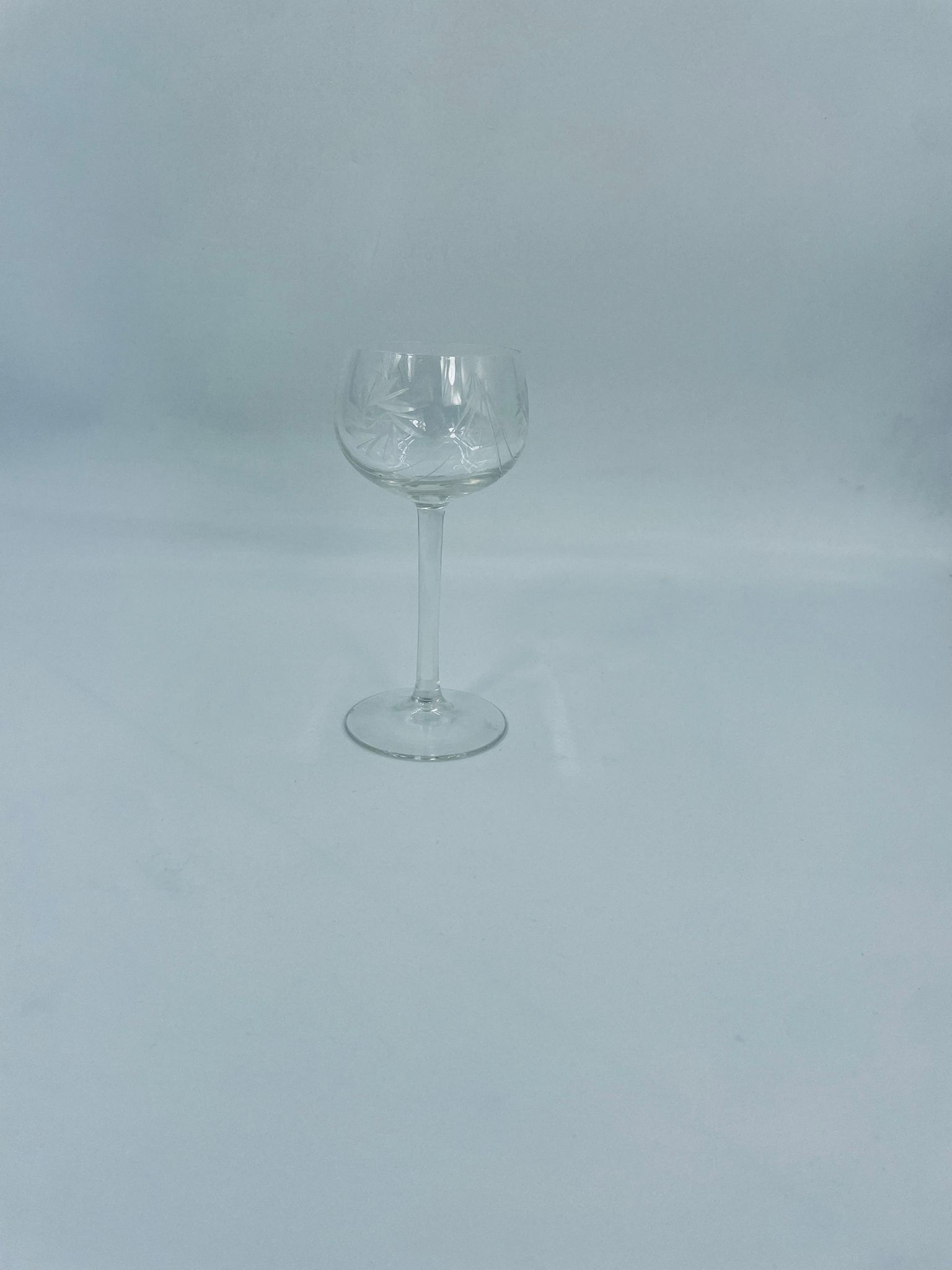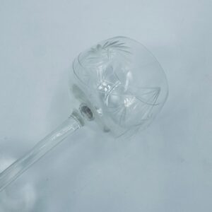 Zabytkowy kieliszek do wina, wykonany z wysokiej jakości szkła kryształowego, przezroczystego. Czara posiada dekoracyjny, szlifowany wzór, nóżka długa ze stabilną podstawą.