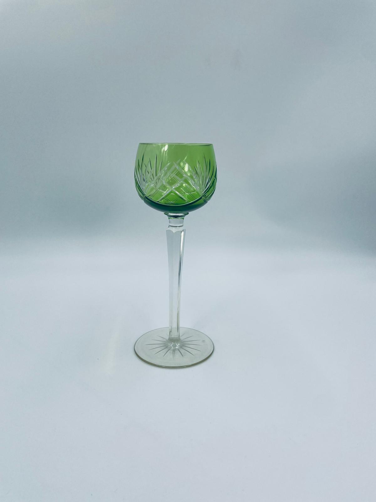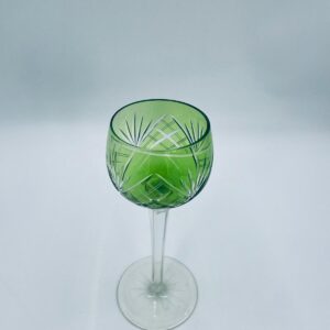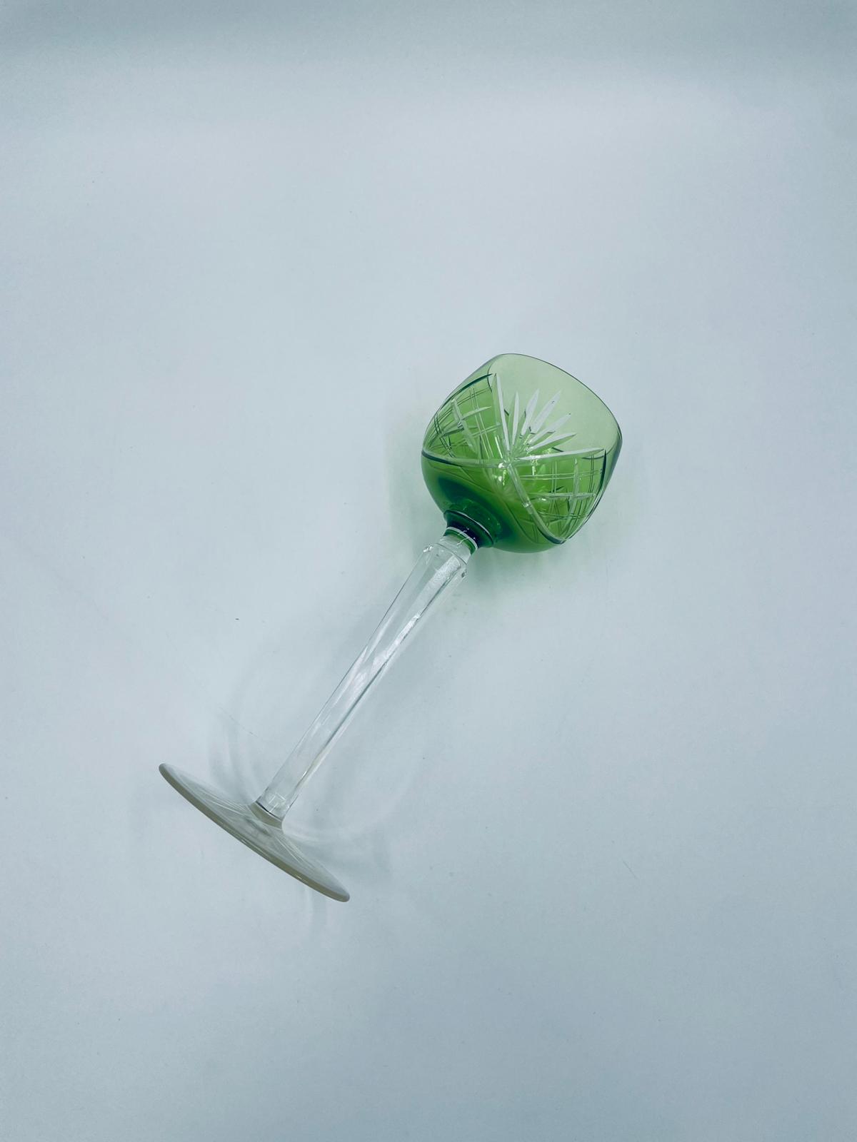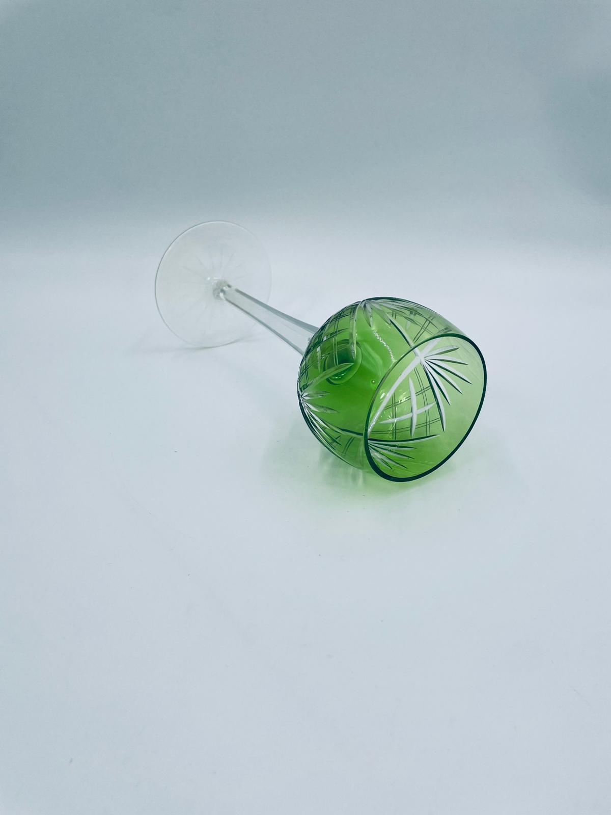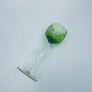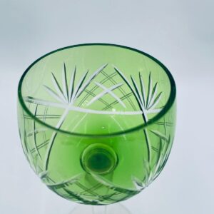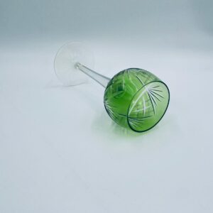 Kieliszek do wina typu Römer, wykonany z wysokiej jakości szkła kryształowego. Kieliszek posiada jasnozieloną dwuwarstwową czarę z ręcznie szlifowanymi, precyzyjnymi wzorami stylizowanymi na liście palmy, smukłą fasetowana nóżkę oraz ozdobną podstawę.