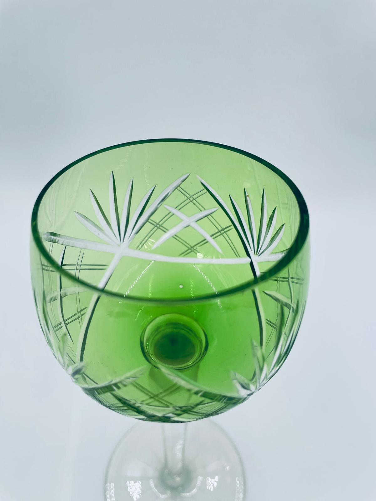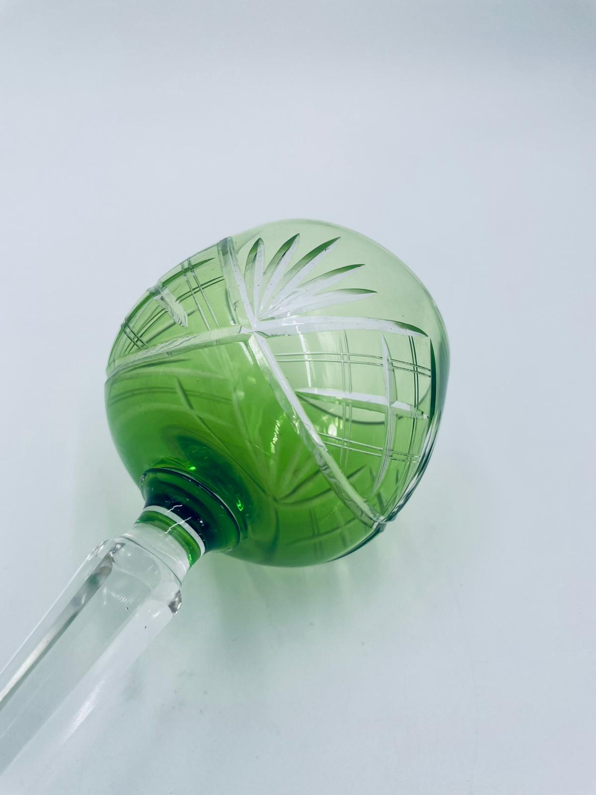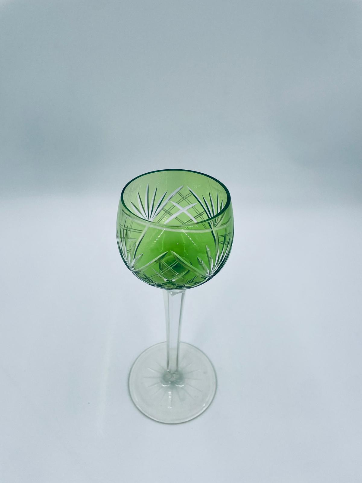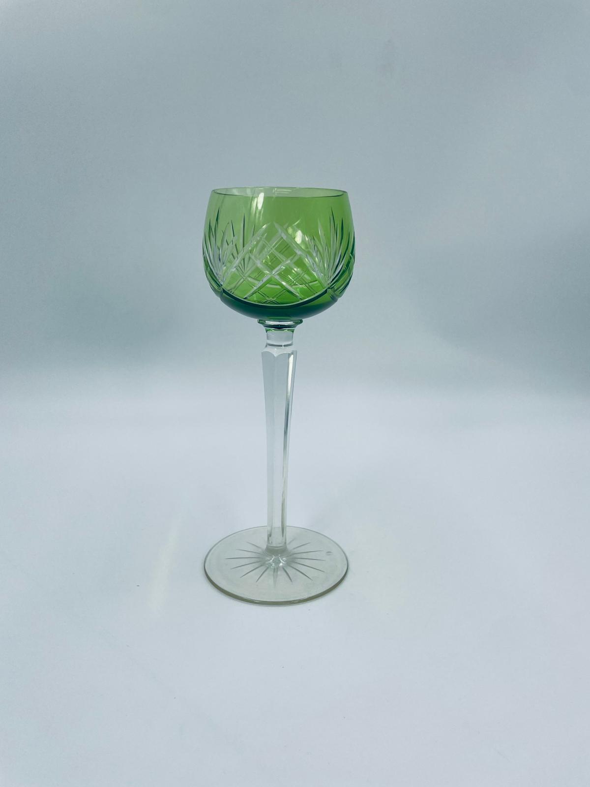 Kieliszek do wina typu Römer, wykonany z wysokiej jakości szkła kryształowego. Kieliszek posiada jasnozieloną dwuwarstwową czarę z ręcznie szlifowanymi, precyzyjnymi wzorami stylizowanymi na liście palmy, smukłą fasetowana nóżkę oraz ozdobną podstawę.