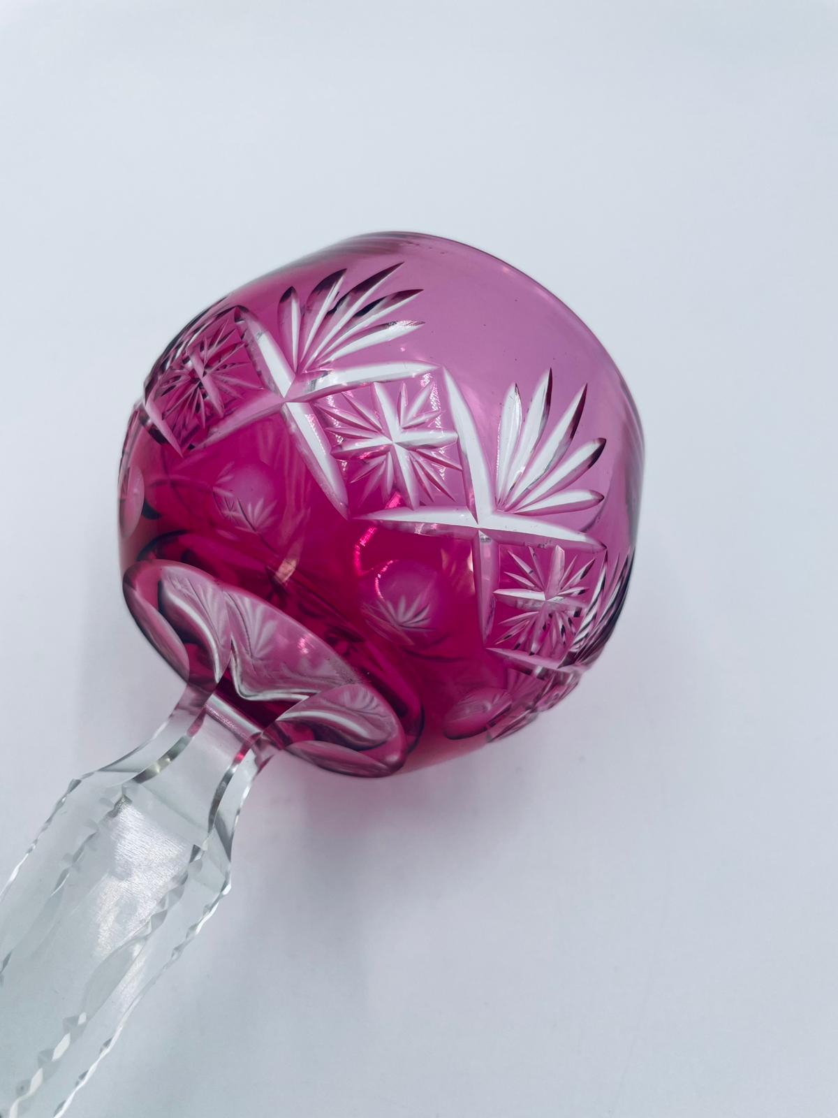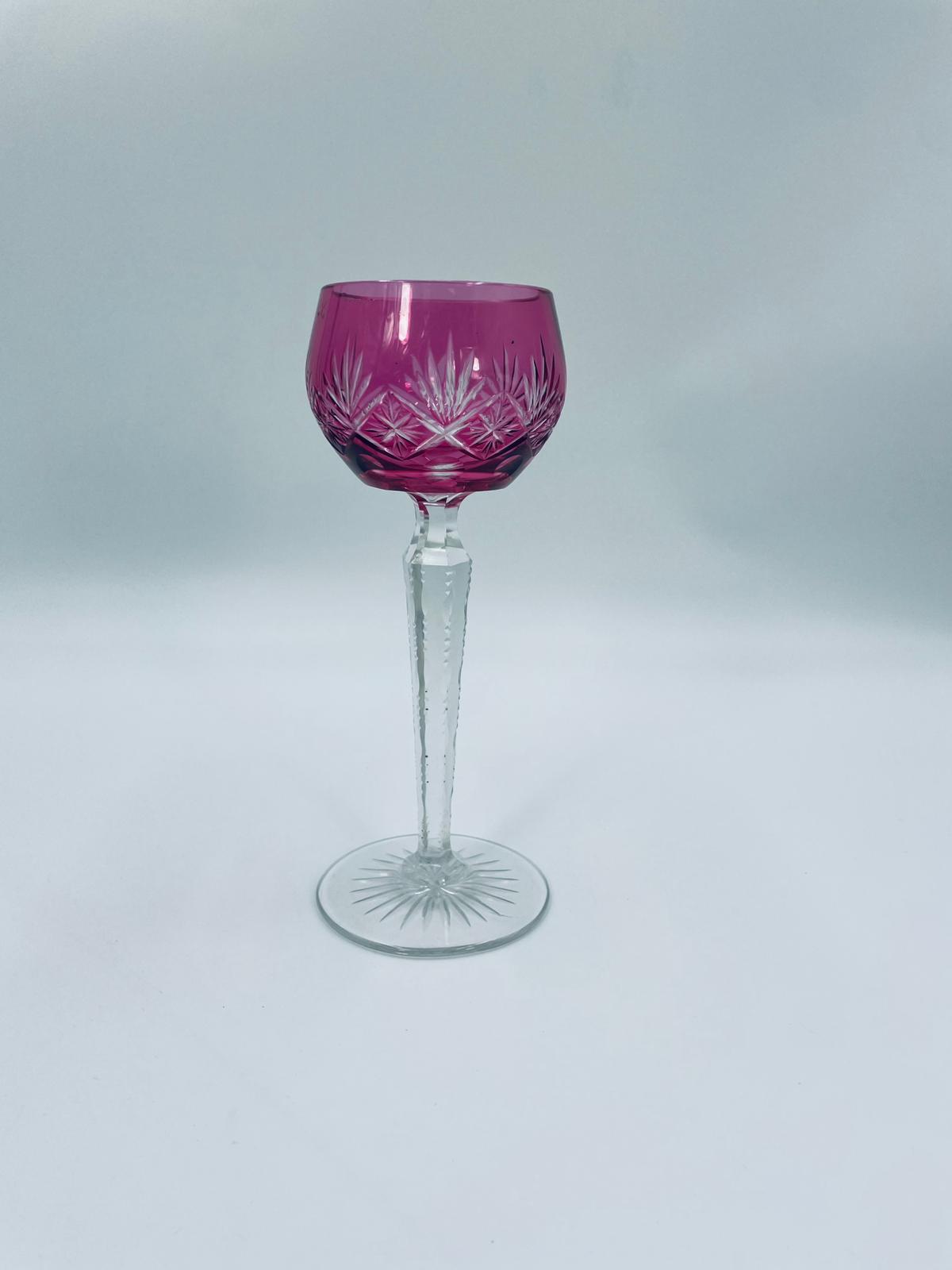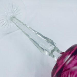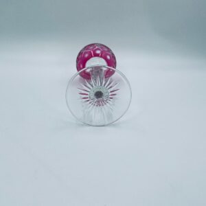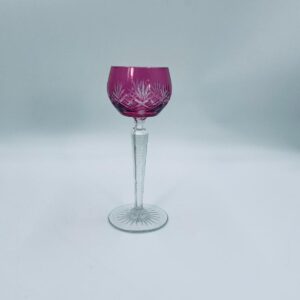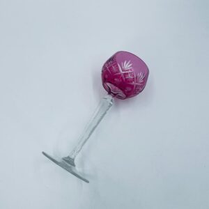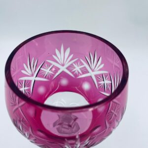 Kieliszek do wina typu Römer w stylu Vintage, wykonany z wysokiej jakości szkła kryształowego. Kieliszek posiada malinową, czarę z ręcznie szlifowanym, ozdobnym wzorem geometrycznym i gwieździstym, smukłą i fasetowana nóżkę oraz stabilna podstawę z precyzyjnym szlifem.