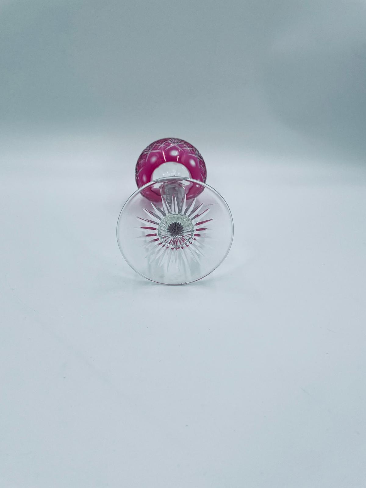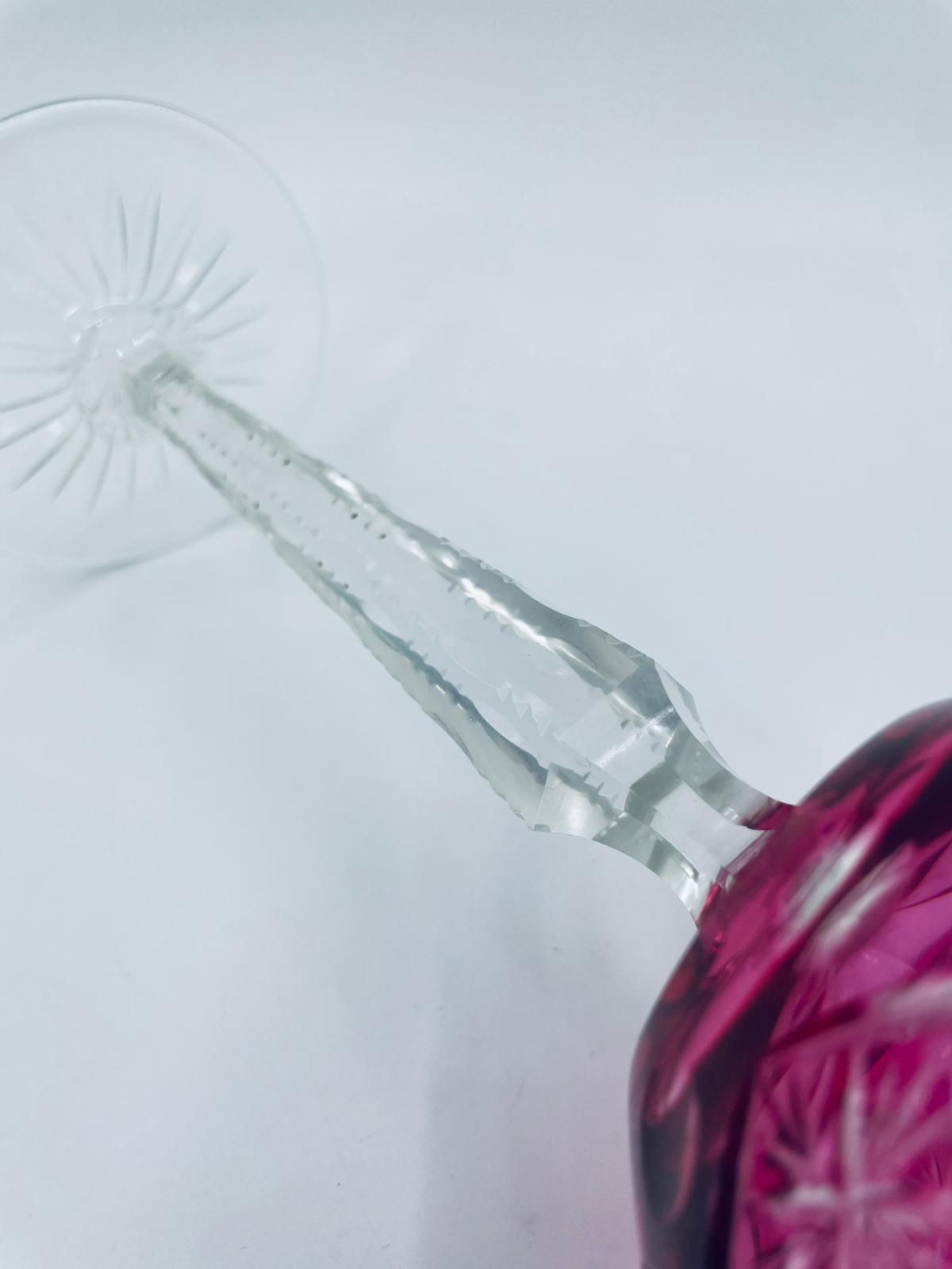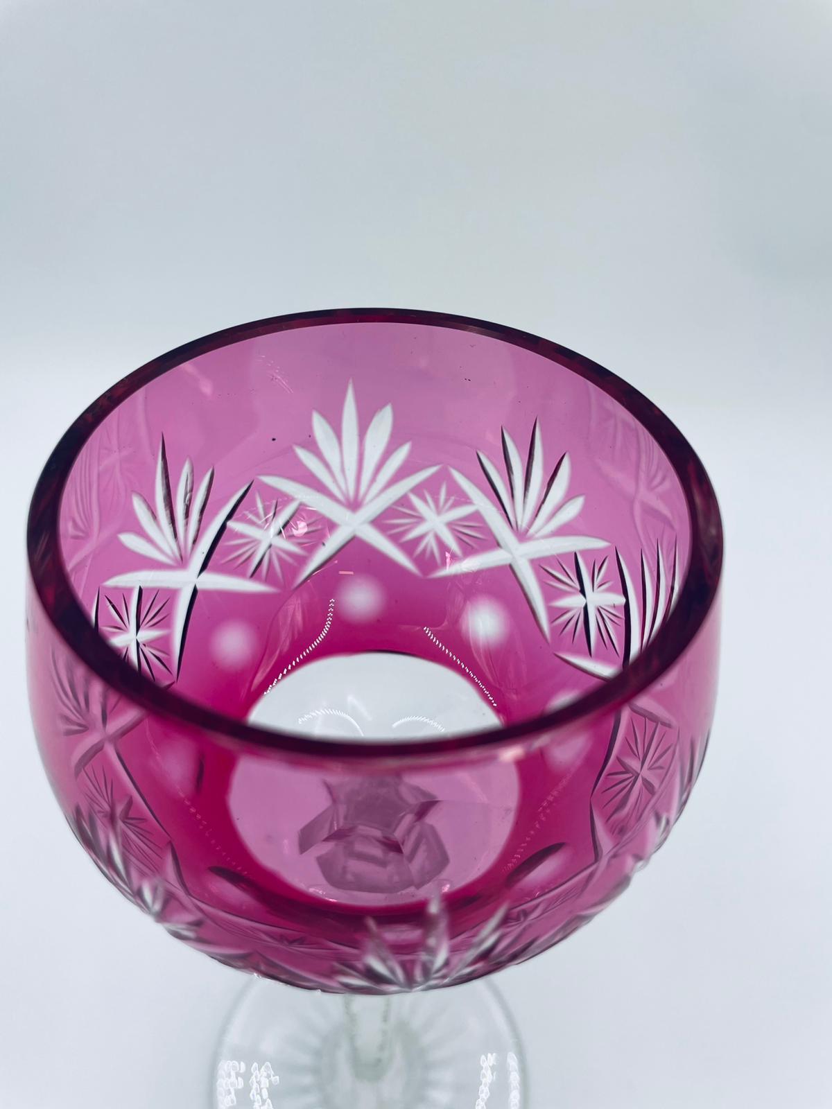 Kieliszek do wina typu Römer w stylu Vintage, wykonany z wysokiej jakości szkła kryształowego. Kieliszek posiada malinową, czarę z ręcznie szlifowanym, ozdobnym wzorem geometrycznym i gwieździstym, smukłą i fasetowana nóżkę oraz stabilna podstawę z precyzyjnym szlifem.