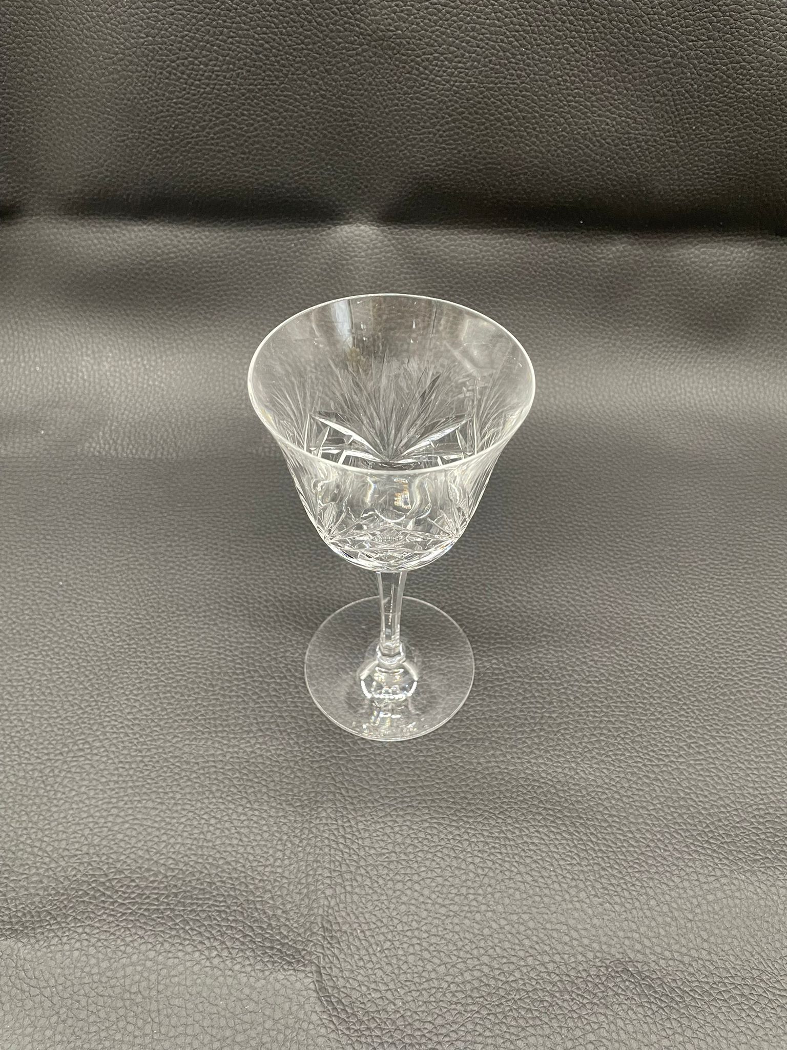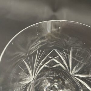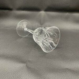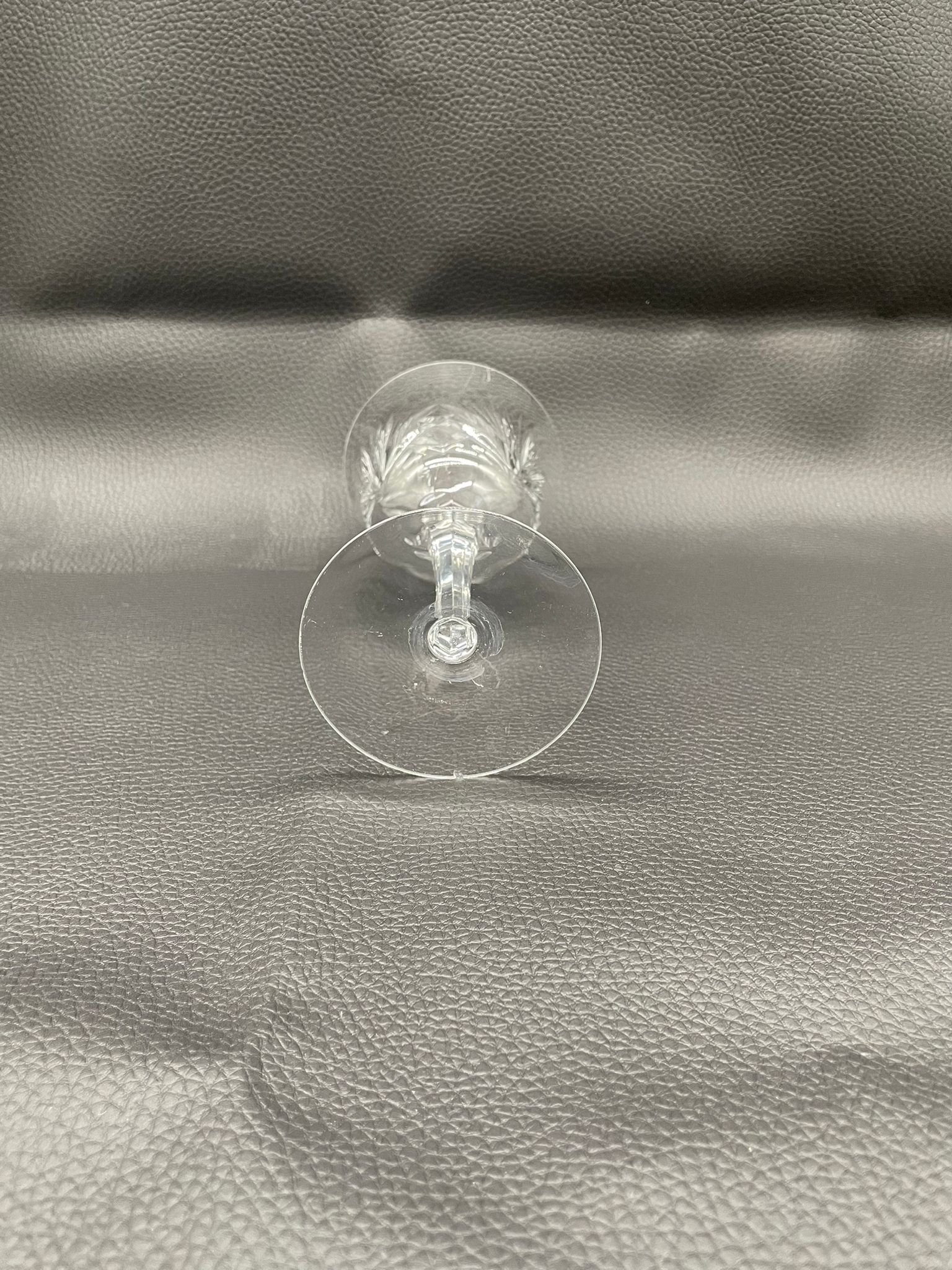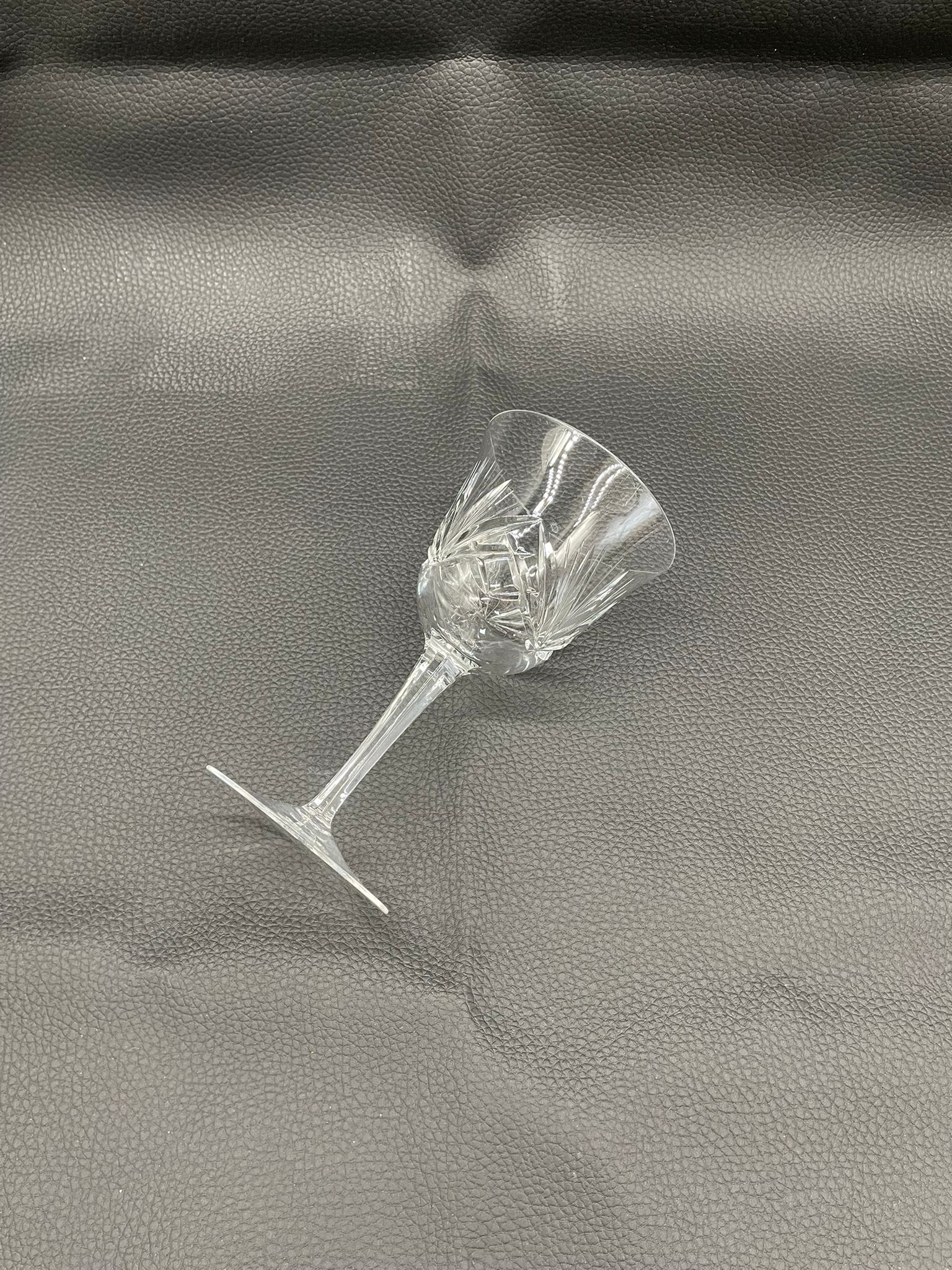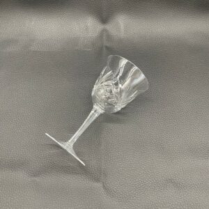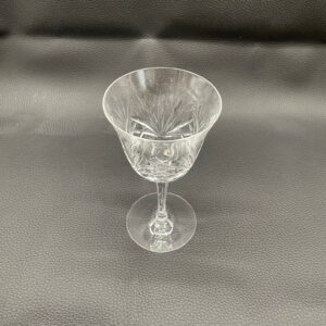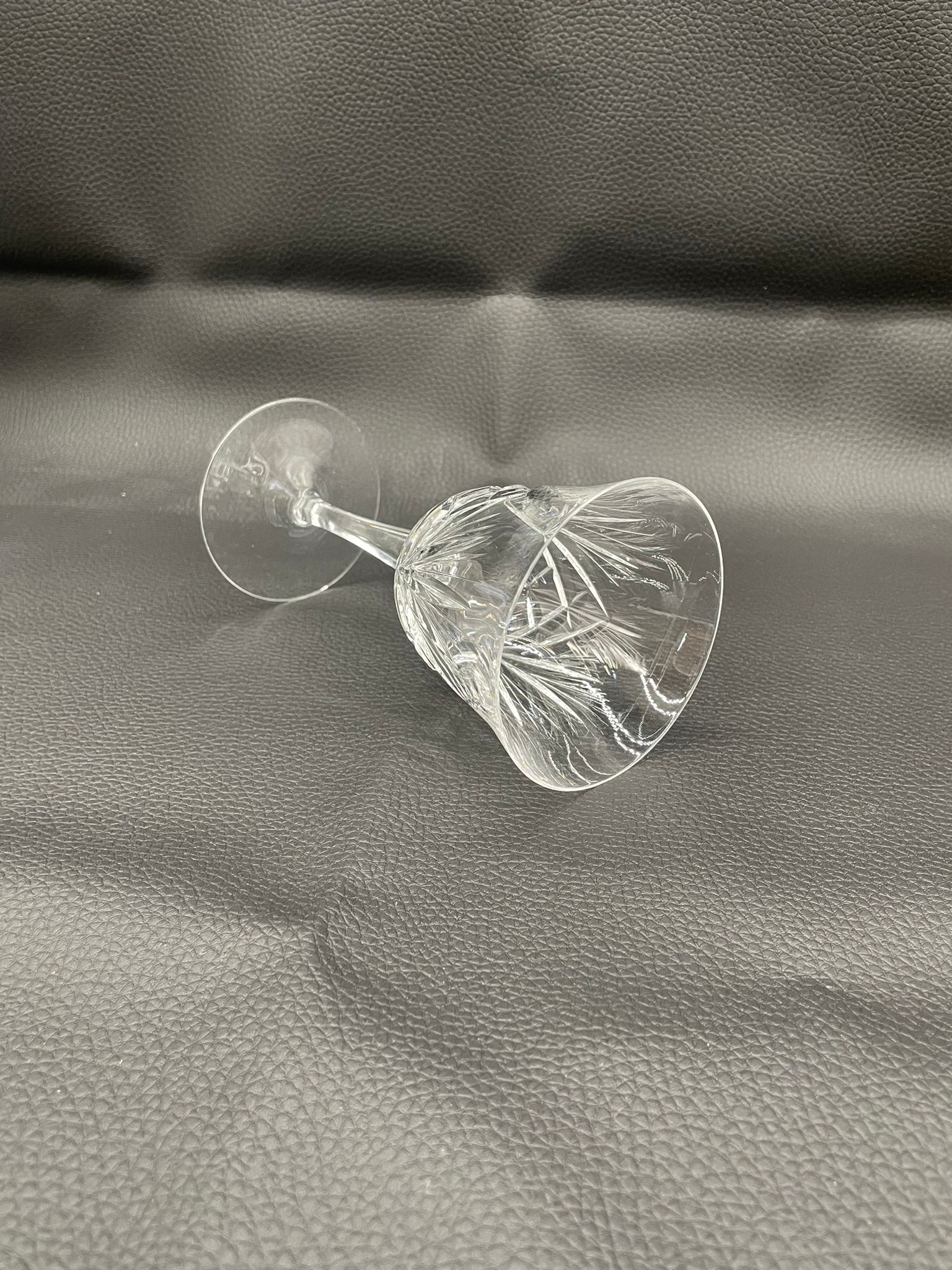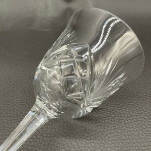 Kieliszek do wina w stylu Vintage, wykonany z wysokiej jakości szkła kryształowego. Kieliszek przezroczysty, charakteryzuje się ręcznie ciętym, bogatym szlifem , smukłą nóżka i stabilną podstawą. Posiada mały uszczerbek na podstawie oraz zarysowanie na czaszy.