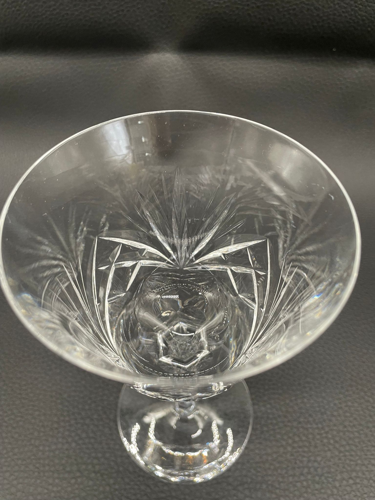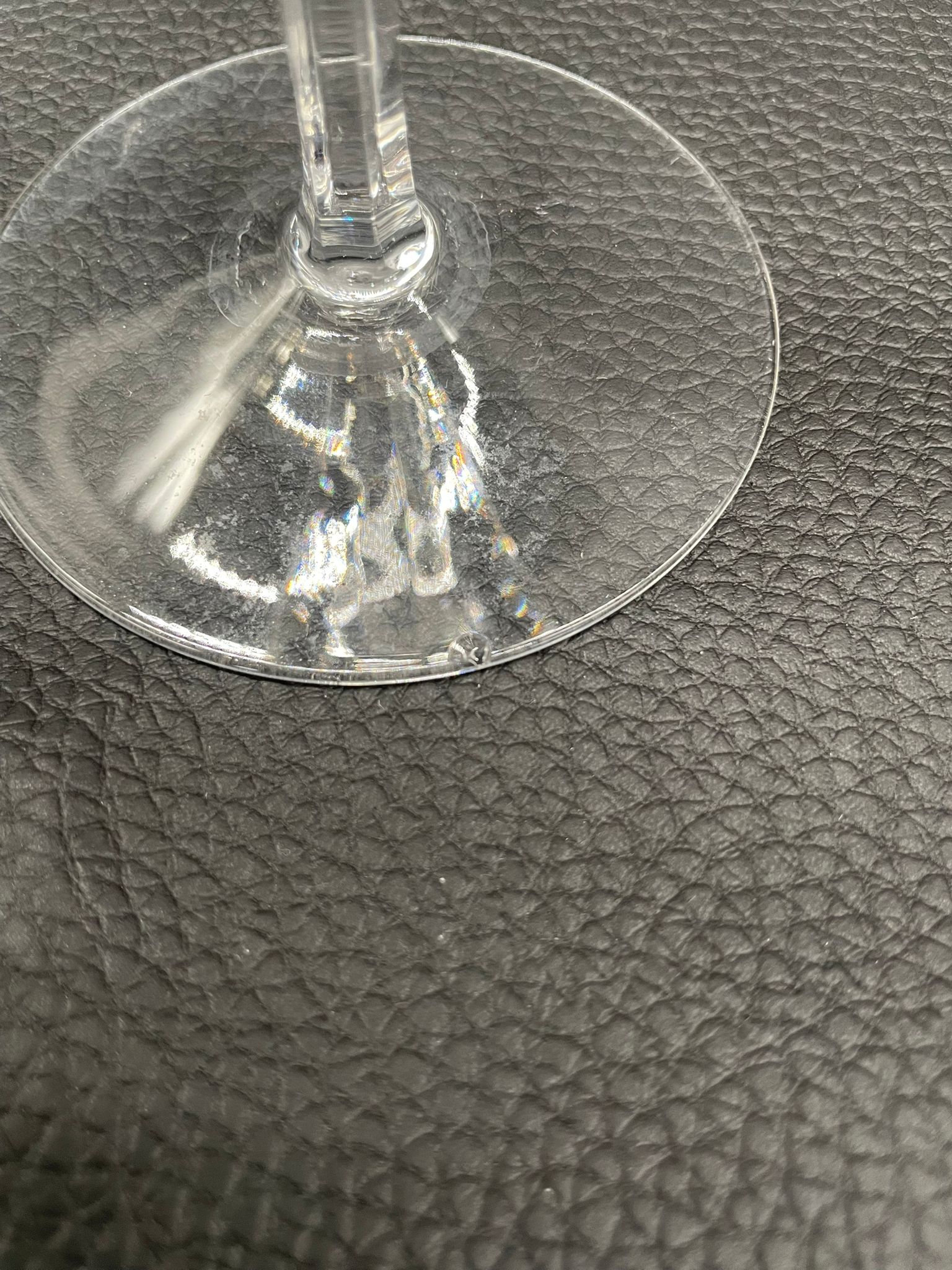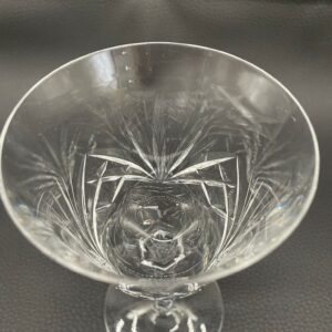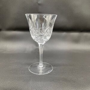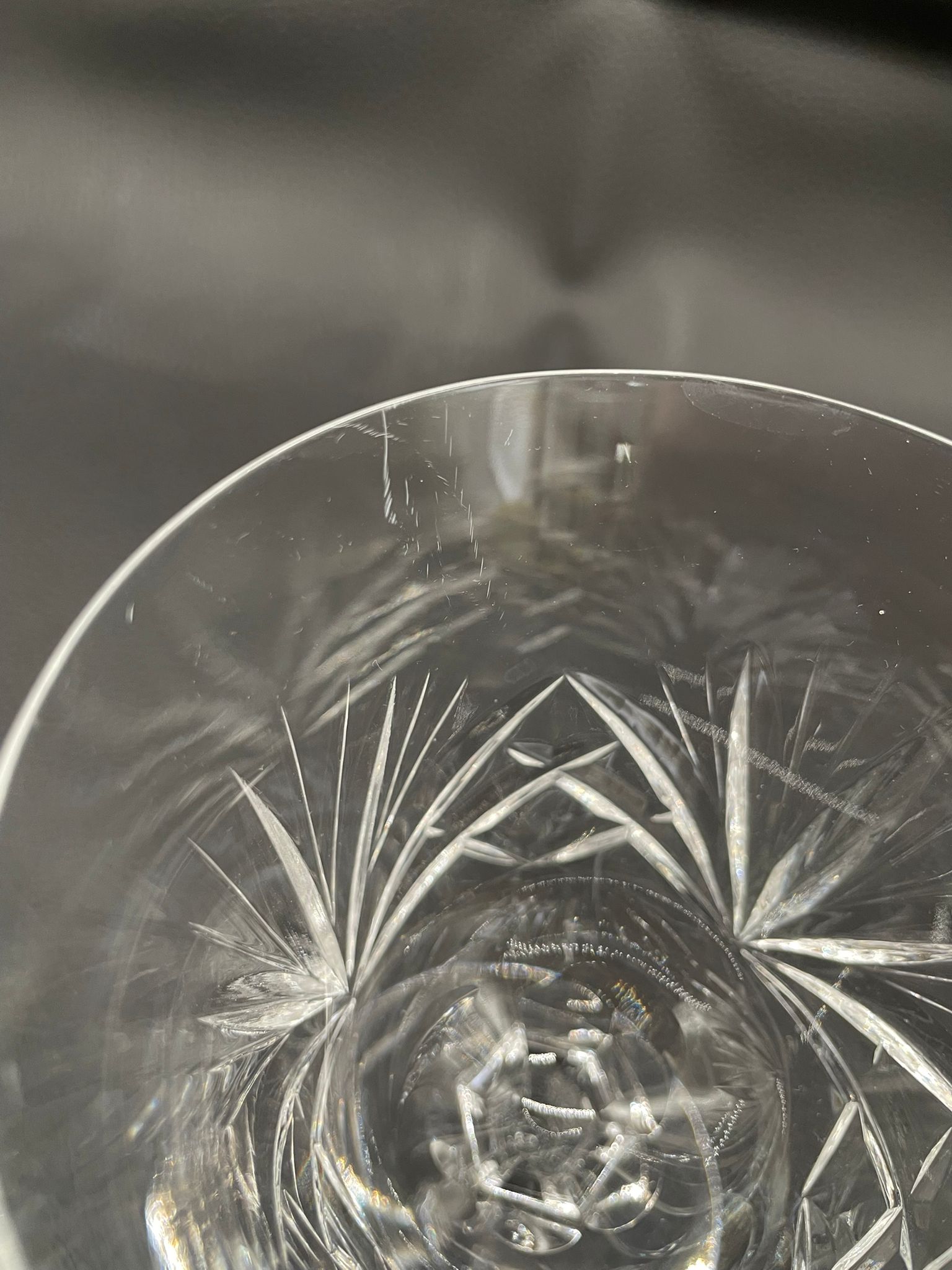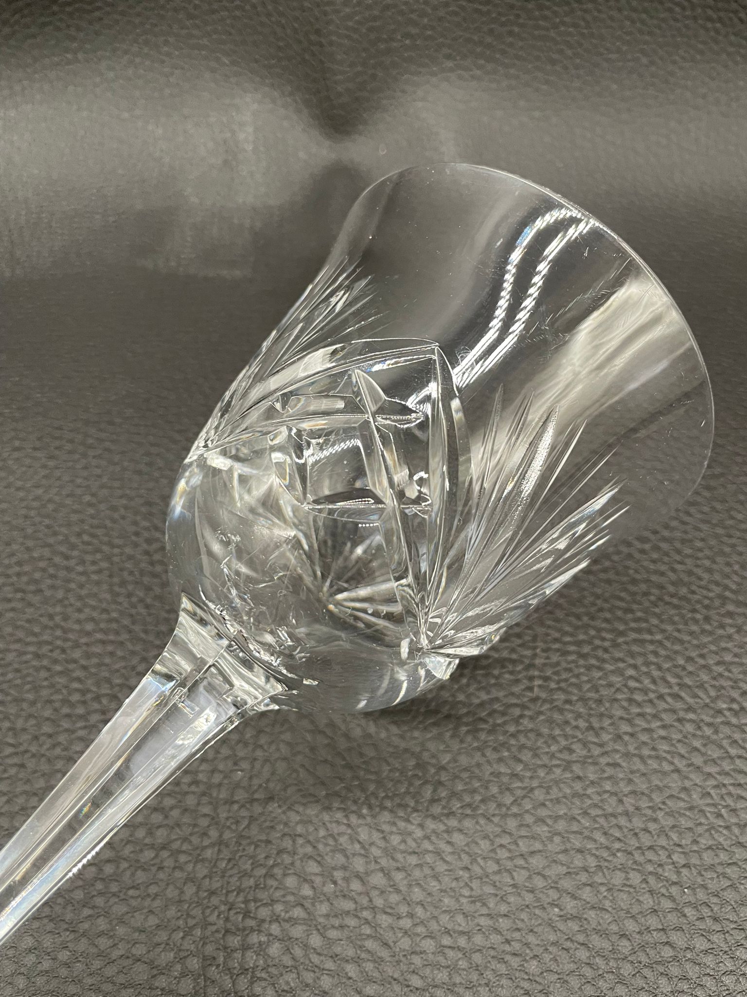 Kieliszek do wina w stylu Vintage, wykonany z wysokiej jakości szkła kryształowego. Kieliszek przezroczysty, charakteryzuje się ręcznie ciętym, bogatym szlifem , smukłą nóżka i stabilną podstawą. Posiada mały uszczerbek na podstawie oraz zarysowanie na czaszy.