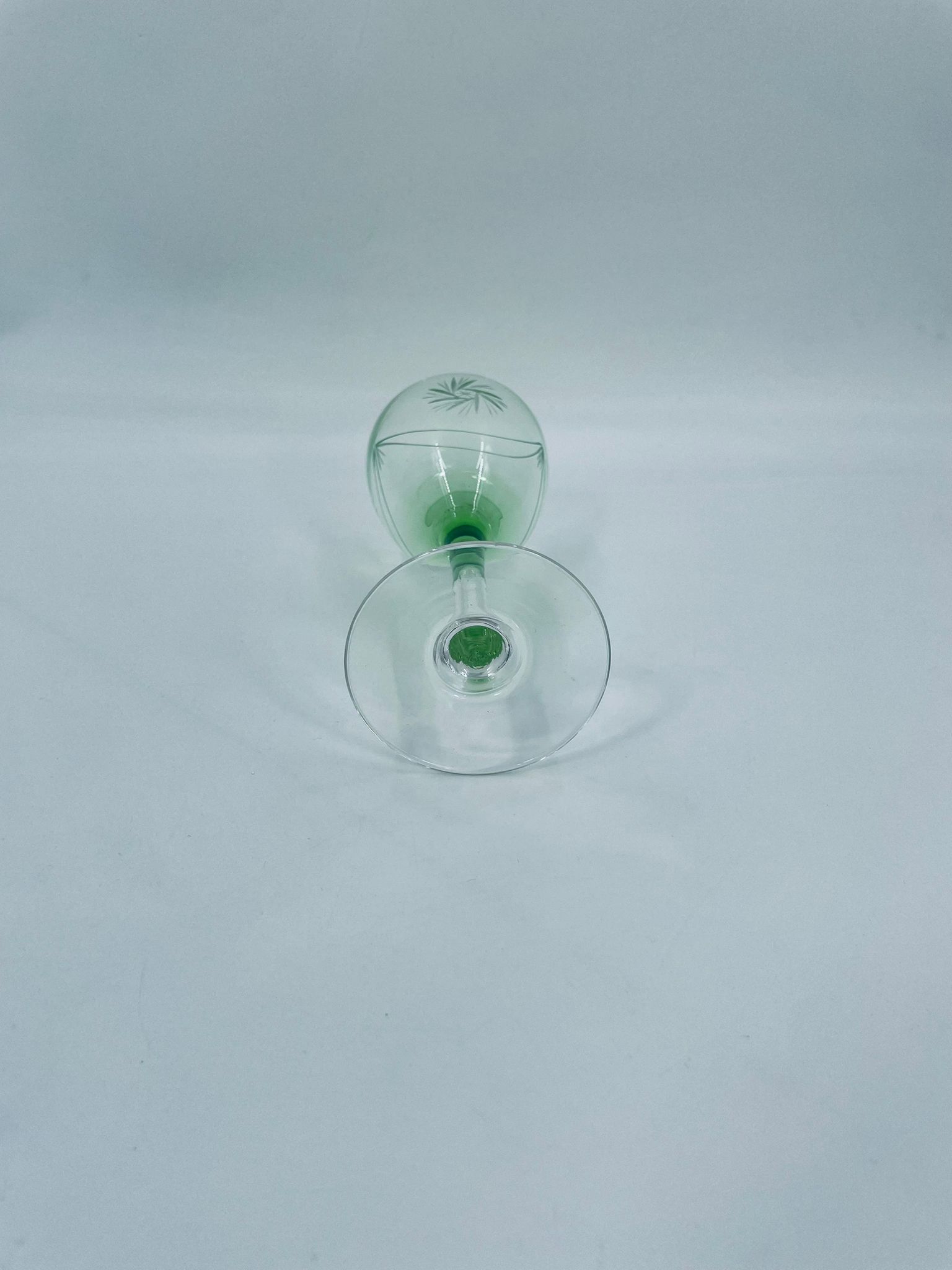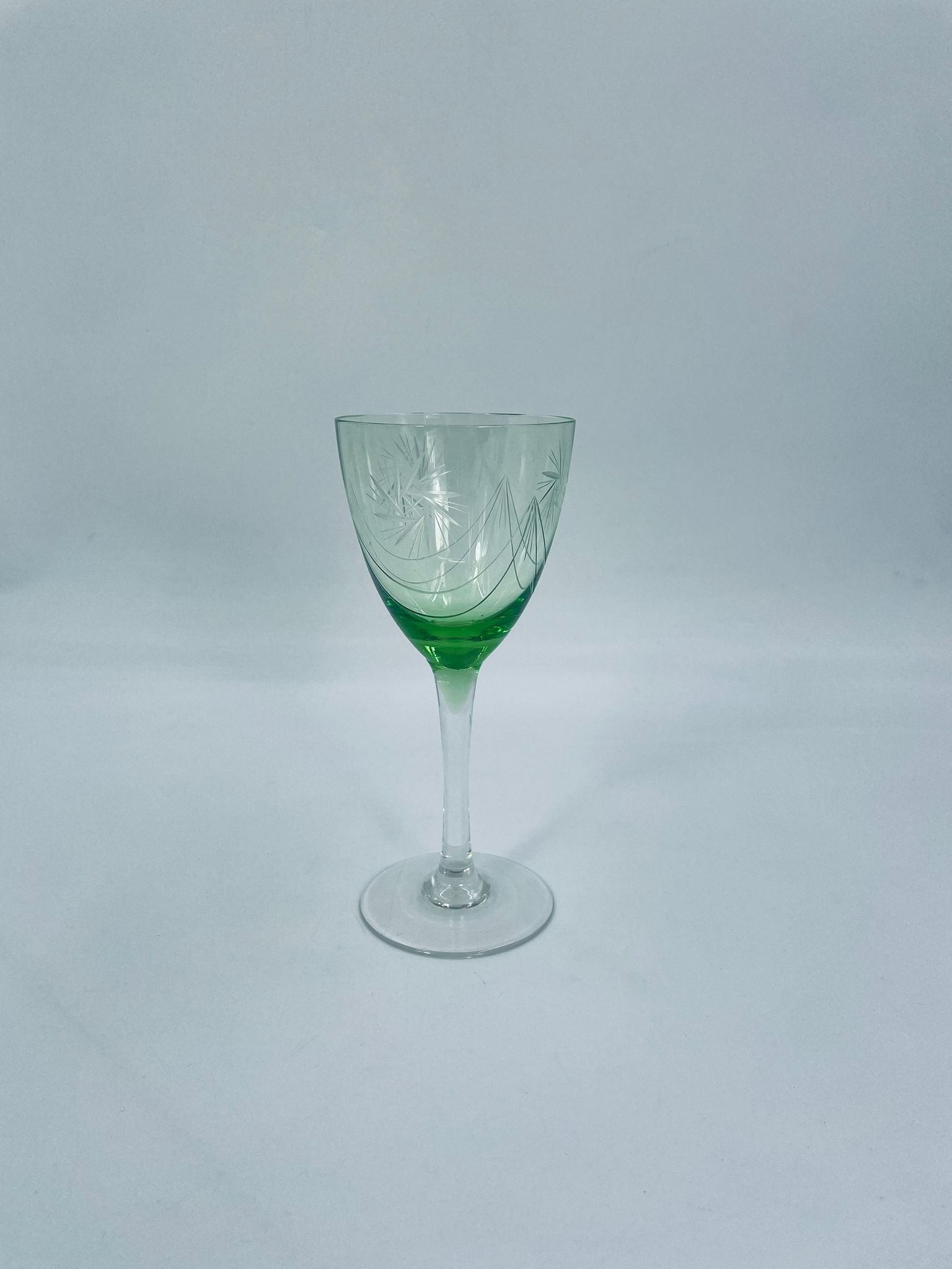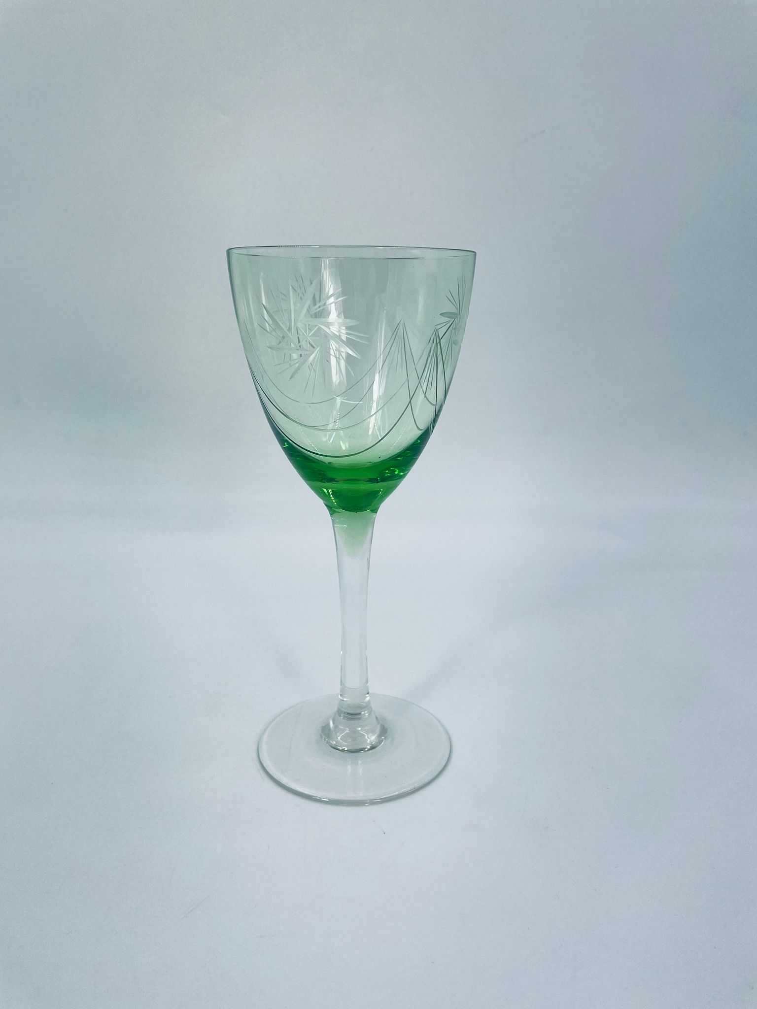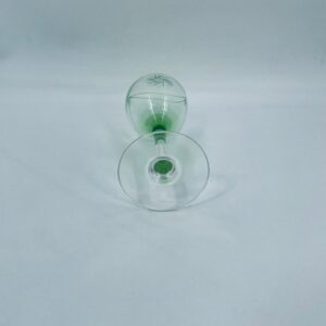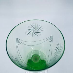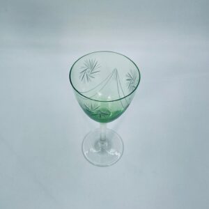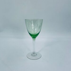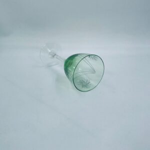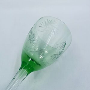 Kieliszek do wina w stylu Vintage, wykonany z wysokiej jakości szkła kryształowego. Kieliszek charakteryzuje się zielonym kolorem czaszy oraz ozdobnym, trawionym wzorem, przezroczystą smukłą i długą nóżką i stabilną podstawą. Jeden kieliszek posiada mały uszczerbek na podstawie.