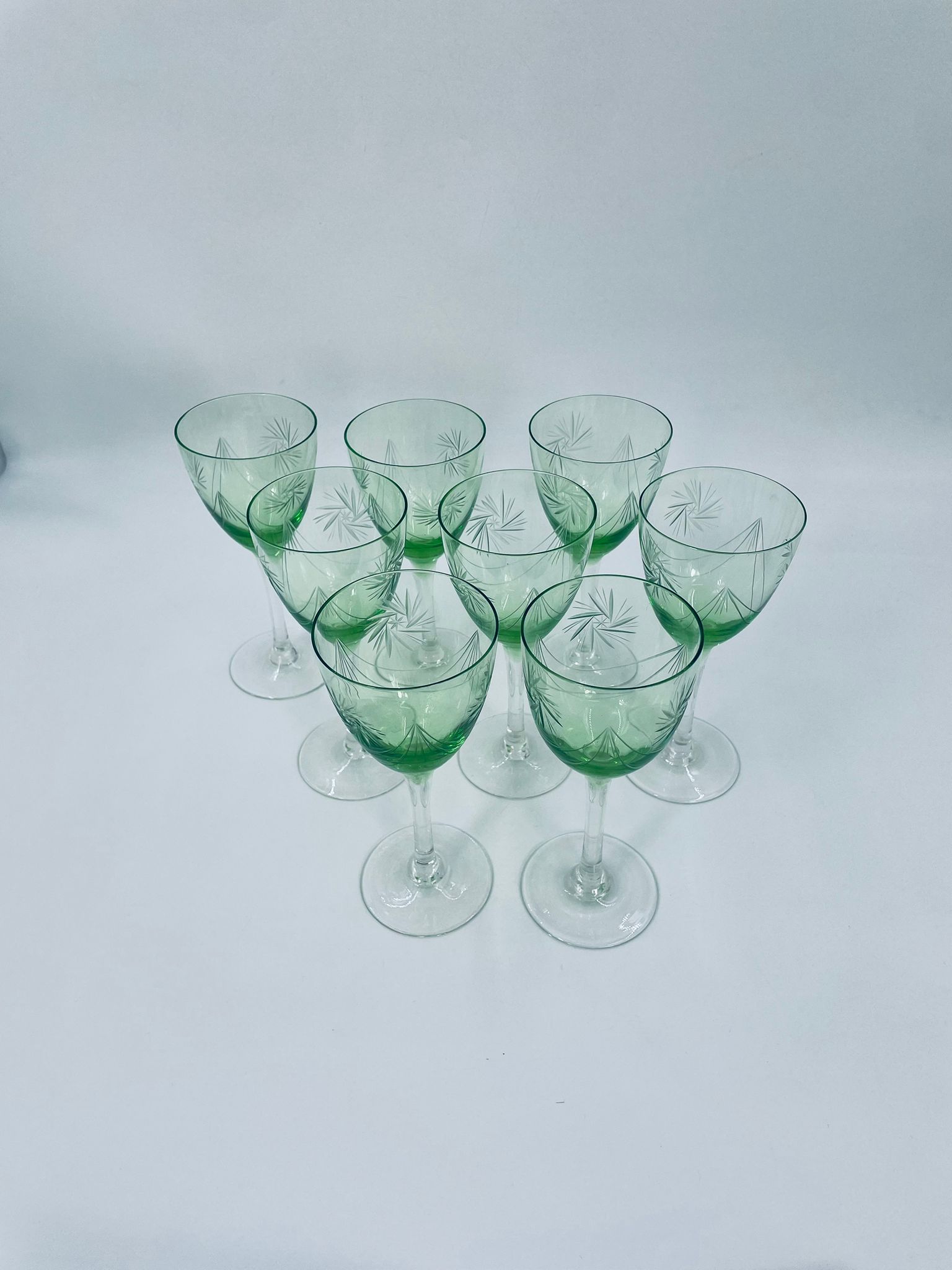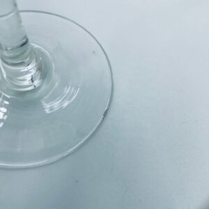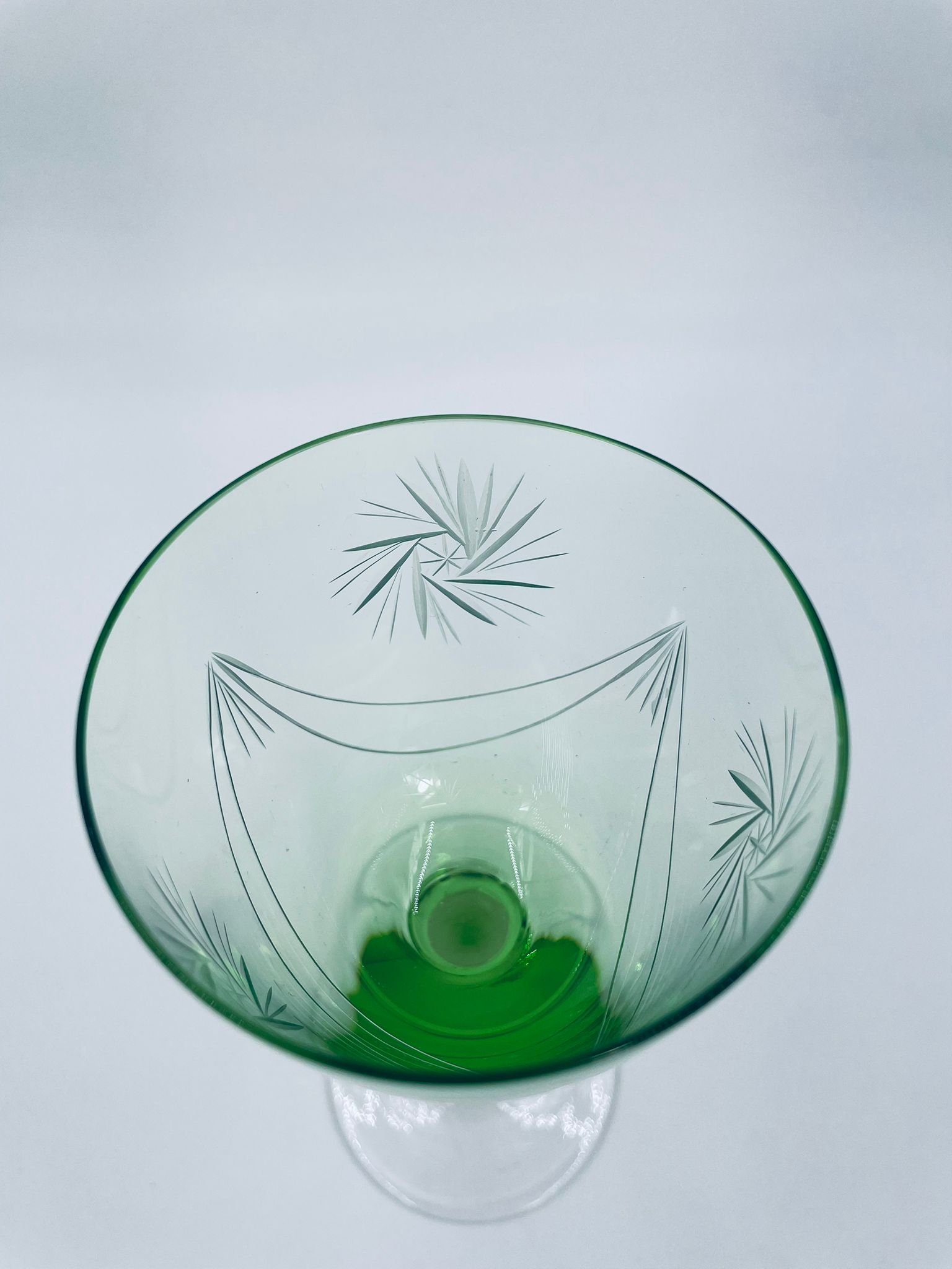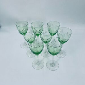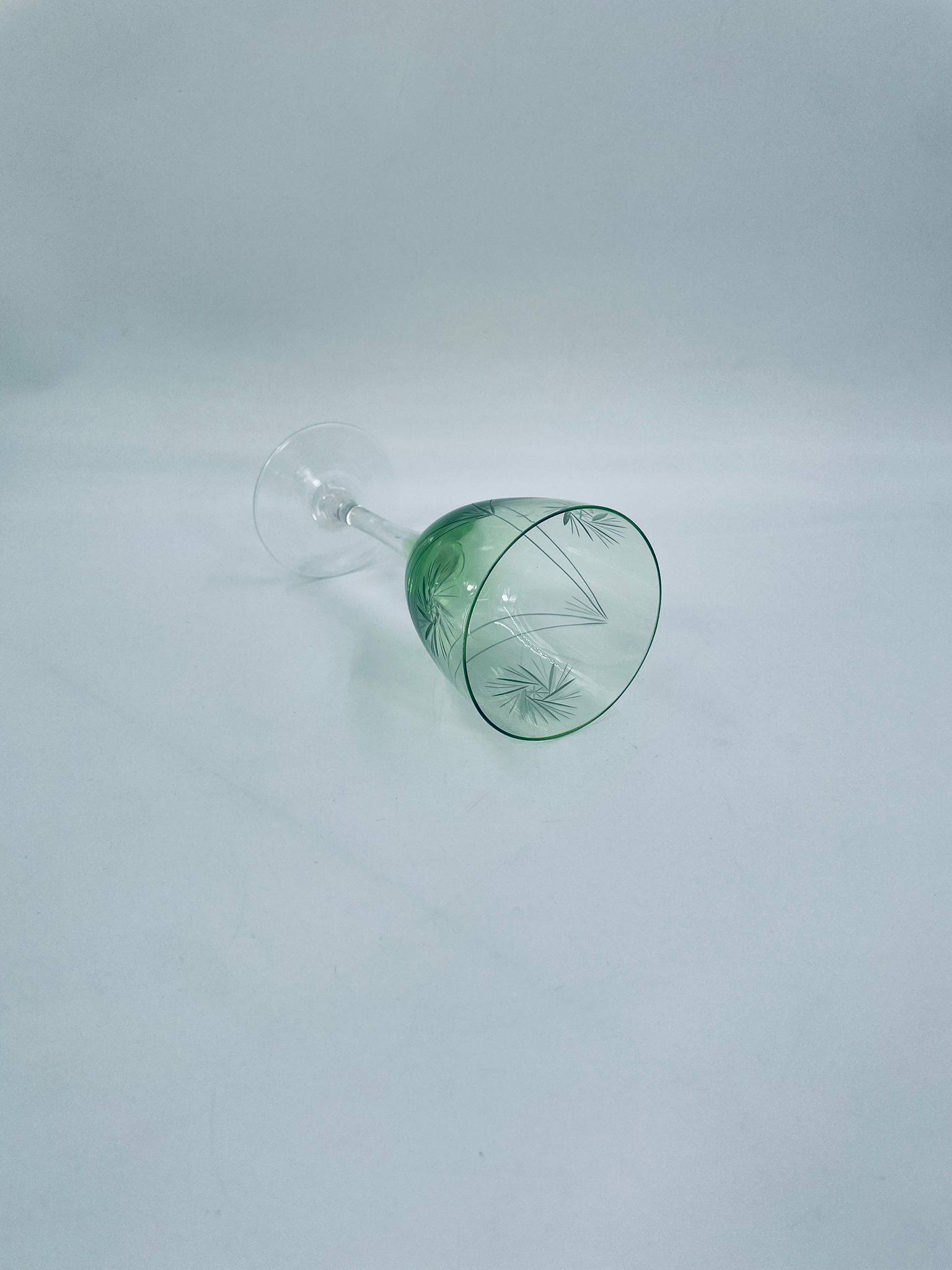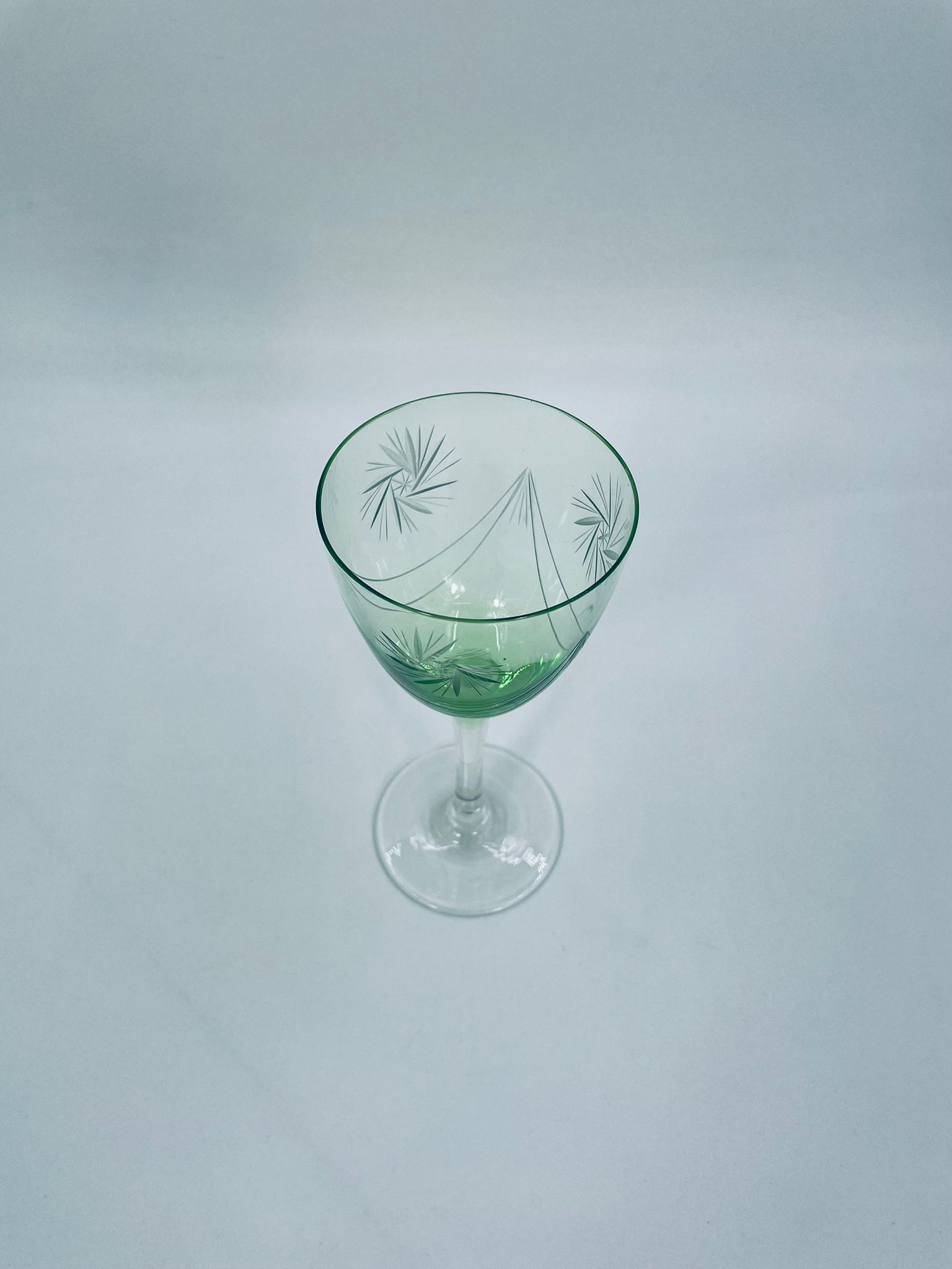 Kieliszek do wina w stylu Vintage, wykonany z wysokiej jakości szkła kryształowego. Kieliszek charakteryzuje się zielonym kolorem czaszy oraz ozdobnym, trawionym wzorem, przezroczystą smukłą i długą nóżką i stabilną podstawą. Jeden kieliszek posiada mały uszczerbek na podstawie.