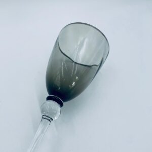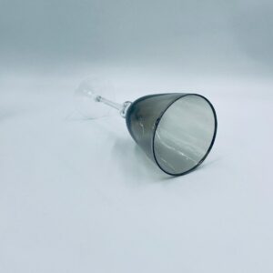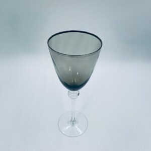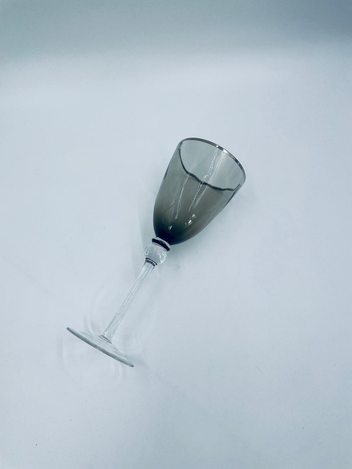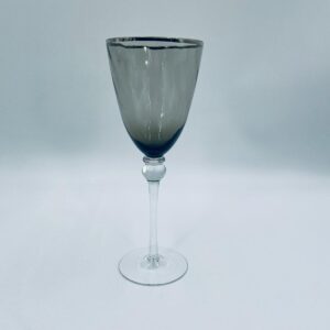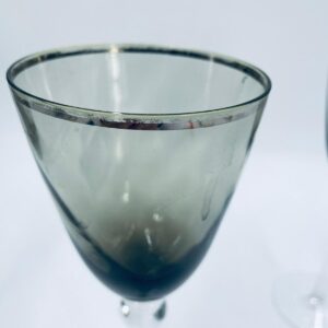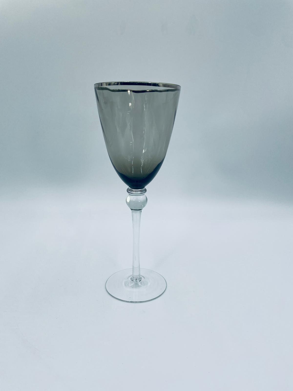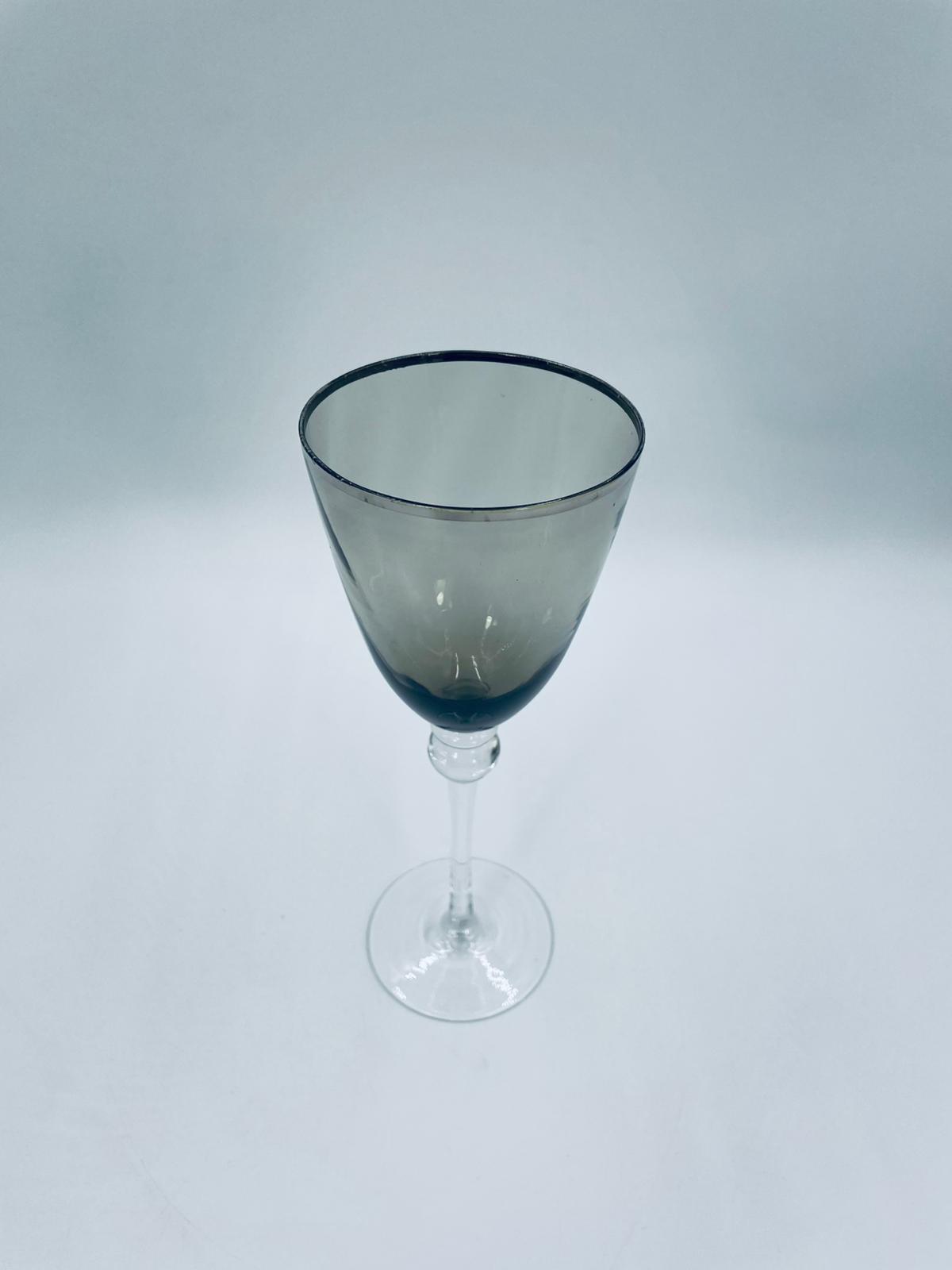 Kieliszek do wina w stylu Vintage, wykonany z wysokiej jakości szkła kryształowego. Kieliszek charakteryzuje się przydymionym kolorem na czaszy ze srebrną obwódką, smukłą i ozdobną nóżką oraz stabilną podstawą. Posiada przetarcie na obwódce.
