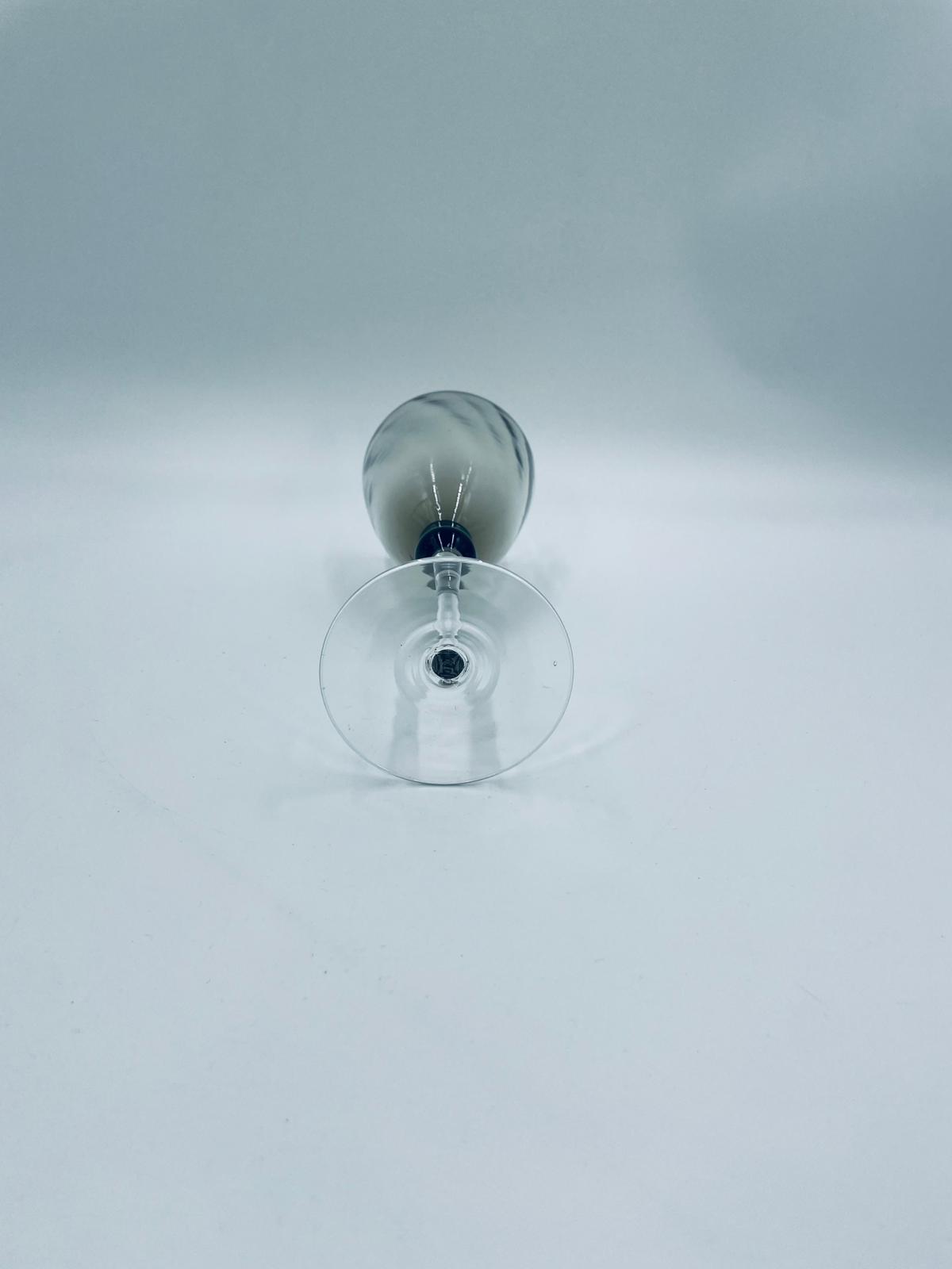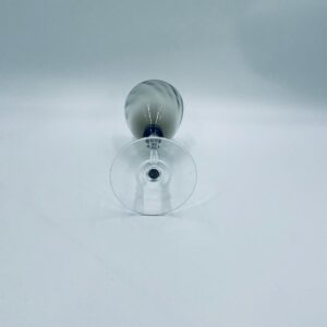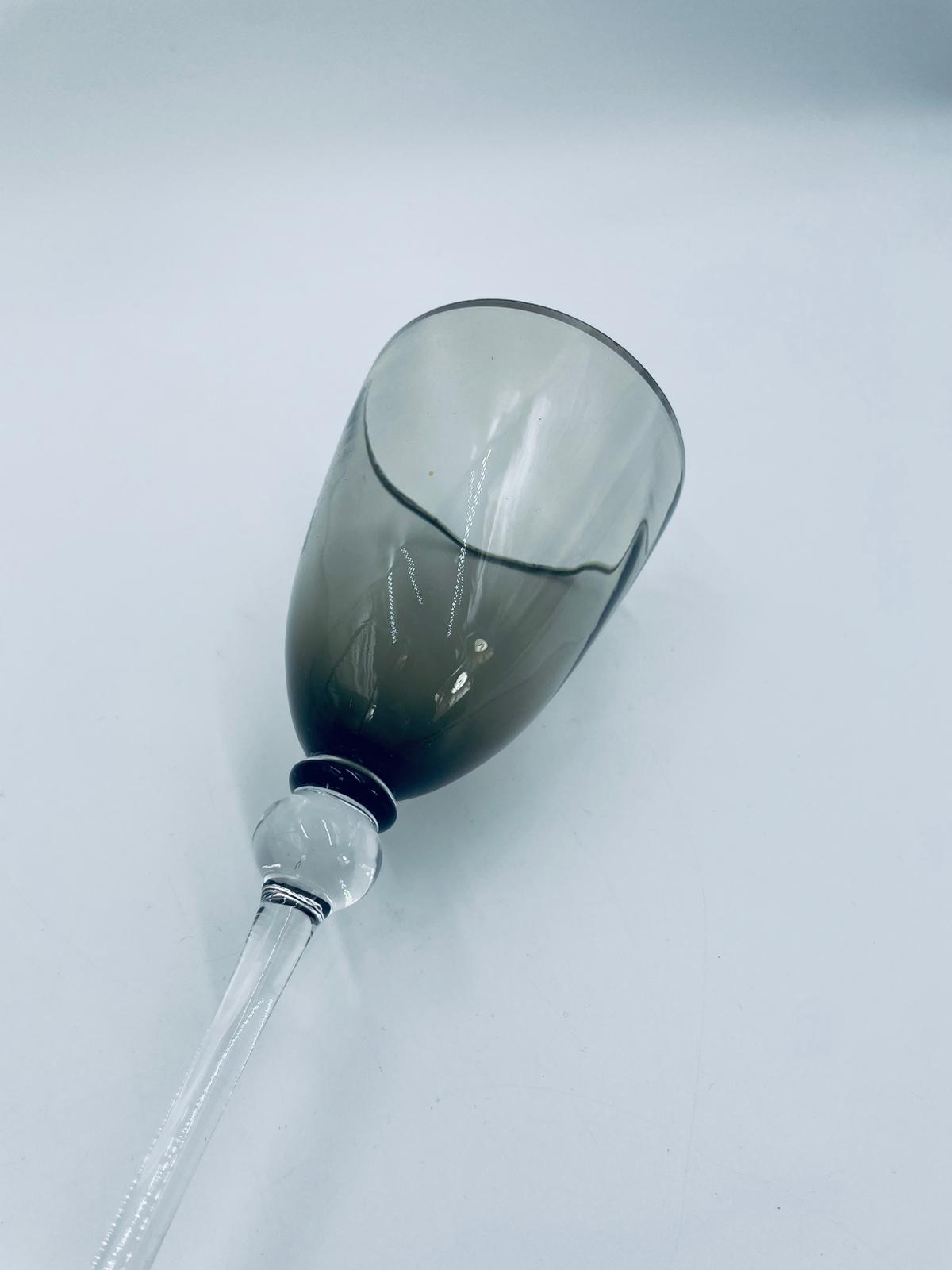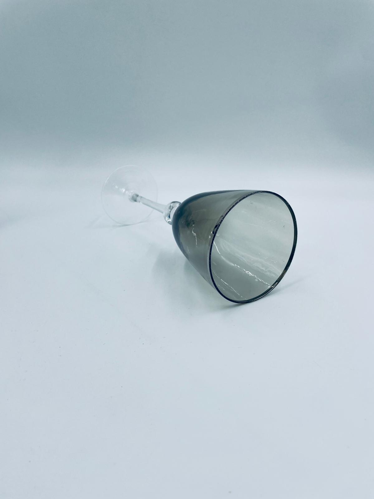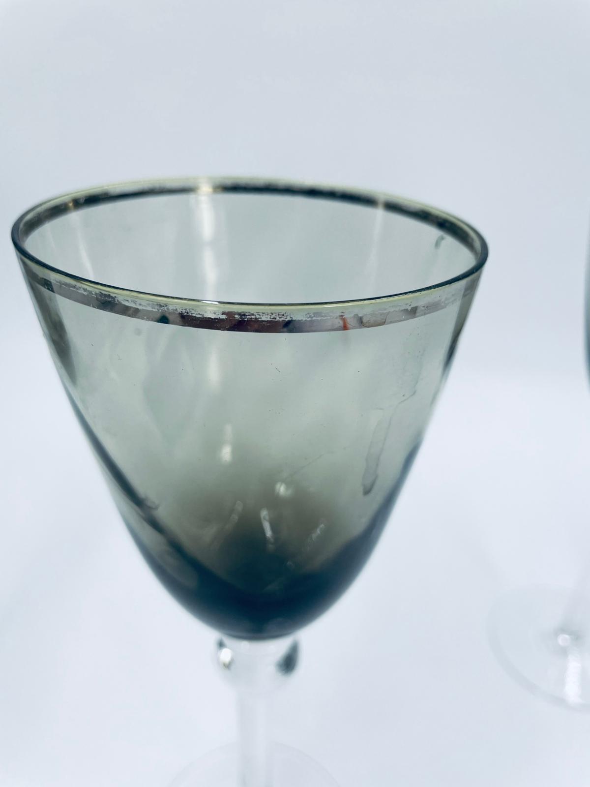 Kieliszek do wina w stylu Vintage, wykonany z wysokiej jakości szkła kryształowego. Kieliszek charakteryzuje się przydymionym kolorem na czaszy ze srebrną obwódką, smukłą i ozdobną nóżką oraz stabilną podstawą. Posiada przetarcie na obwódce.