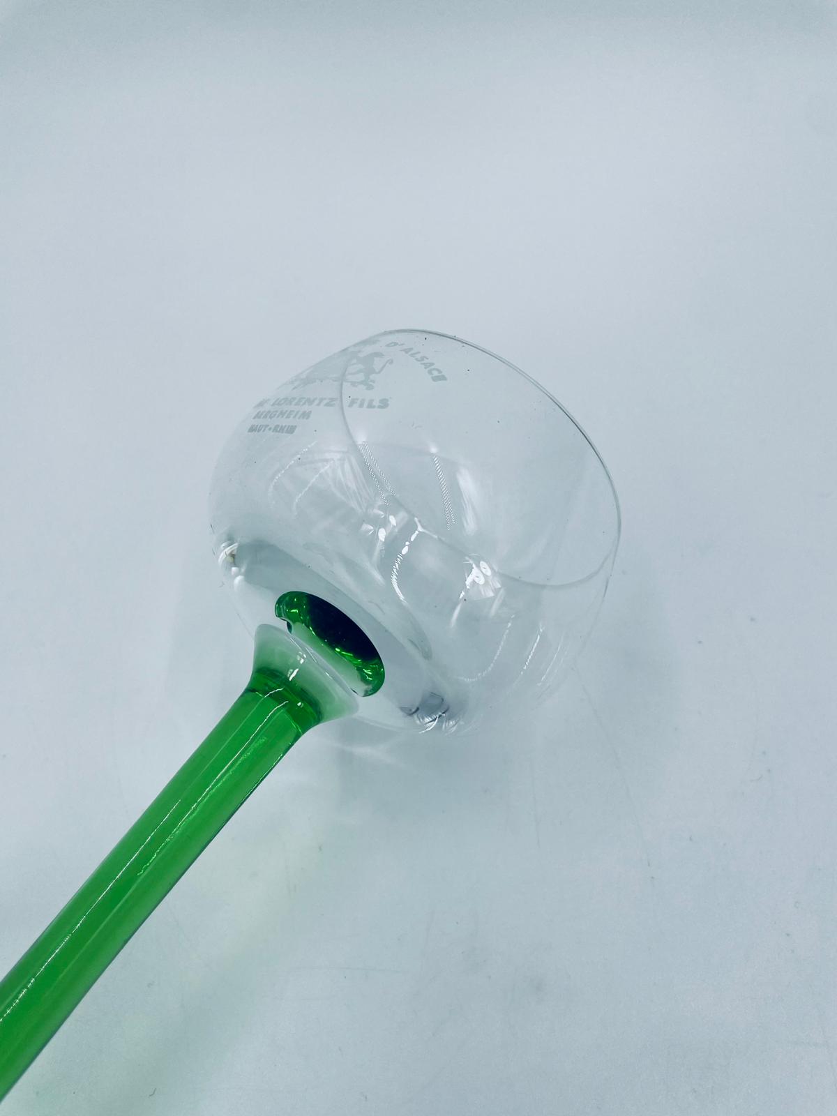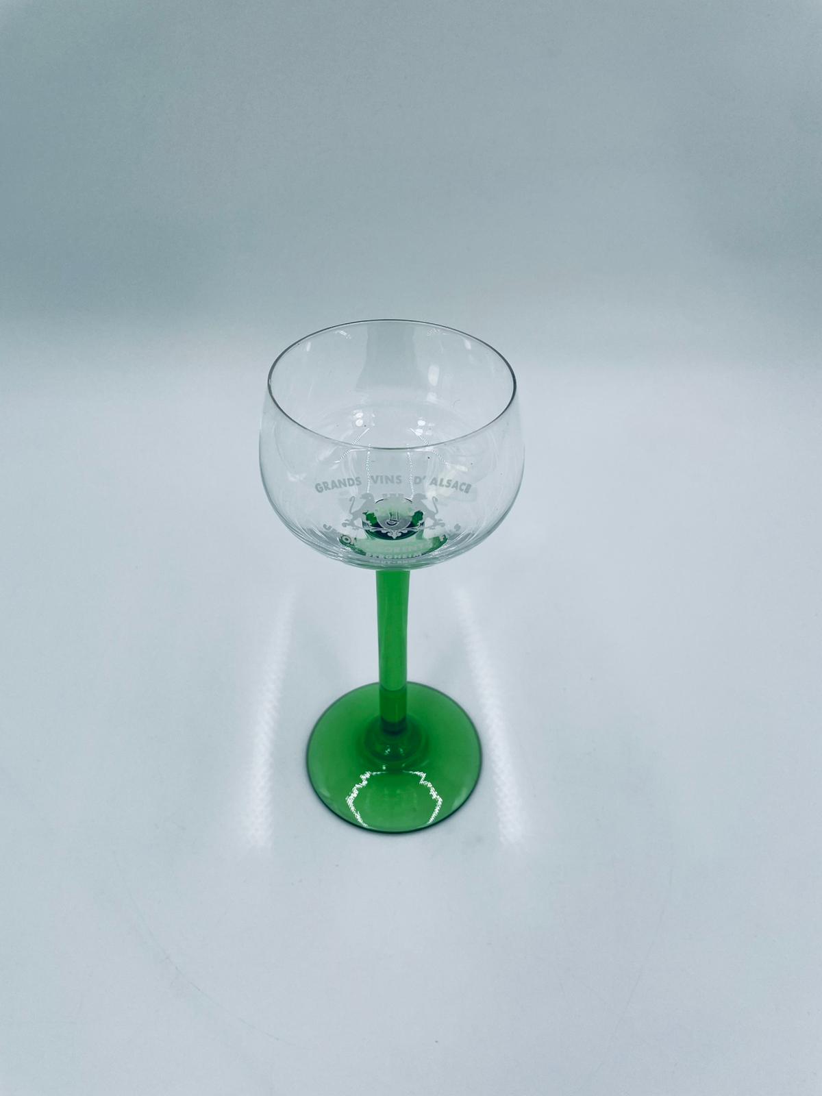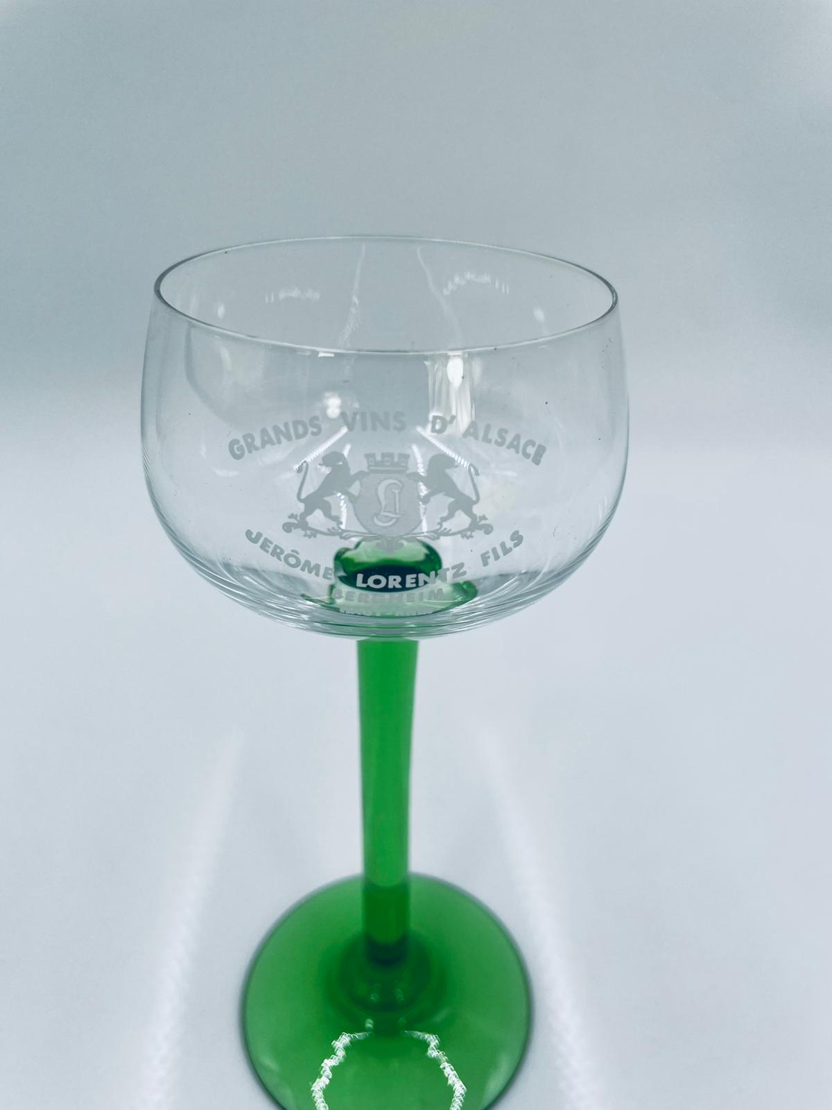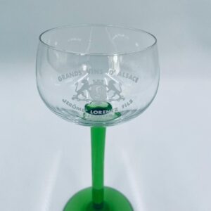 Kieliszek do wina w stylu Vintage, wykonany z wysokiej jakości szkła kryształowego. Kieliszek elegancki, klasyczny, charakteryzuje się przezroczystą czaszą z widniejącym grawerem dotyczący win alzackich od producenta Jerome Lorentz Fils z Bergheim, smukłą nóżką i podstawa w zielonym kolorze.