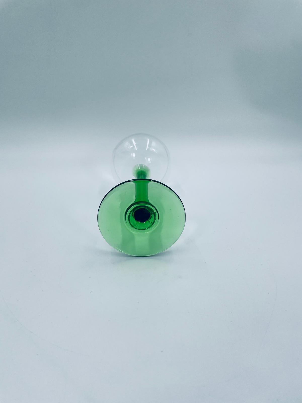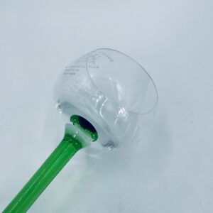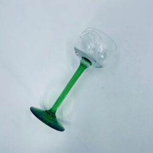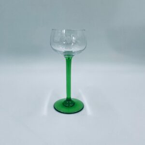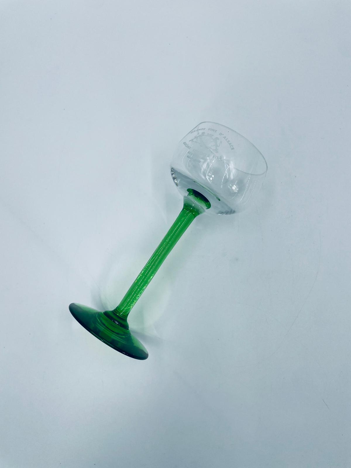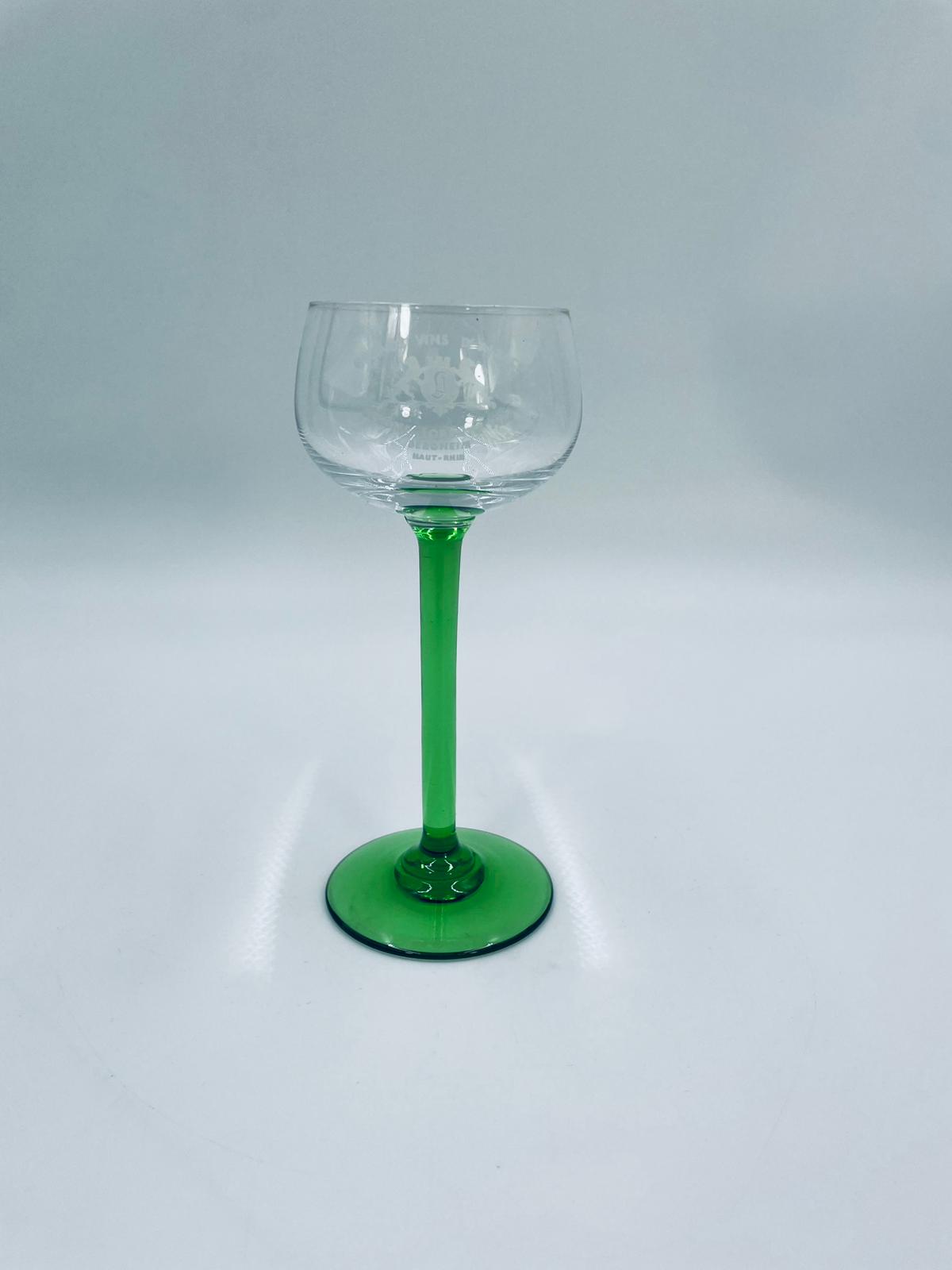 Kieliszek do wina w stylu Vintage, wykonany z wysokiej jakości szkła kryształowego. Kieliszek elegancki, klasyczny, charakteryzuje się przezroczystą czaszą z widniejącym grawerem dotyczący win alzackich od producenta Jerome Lorentz Fils z Bergheim, smukłą nóżką i podstawa w zielonym kolorze.