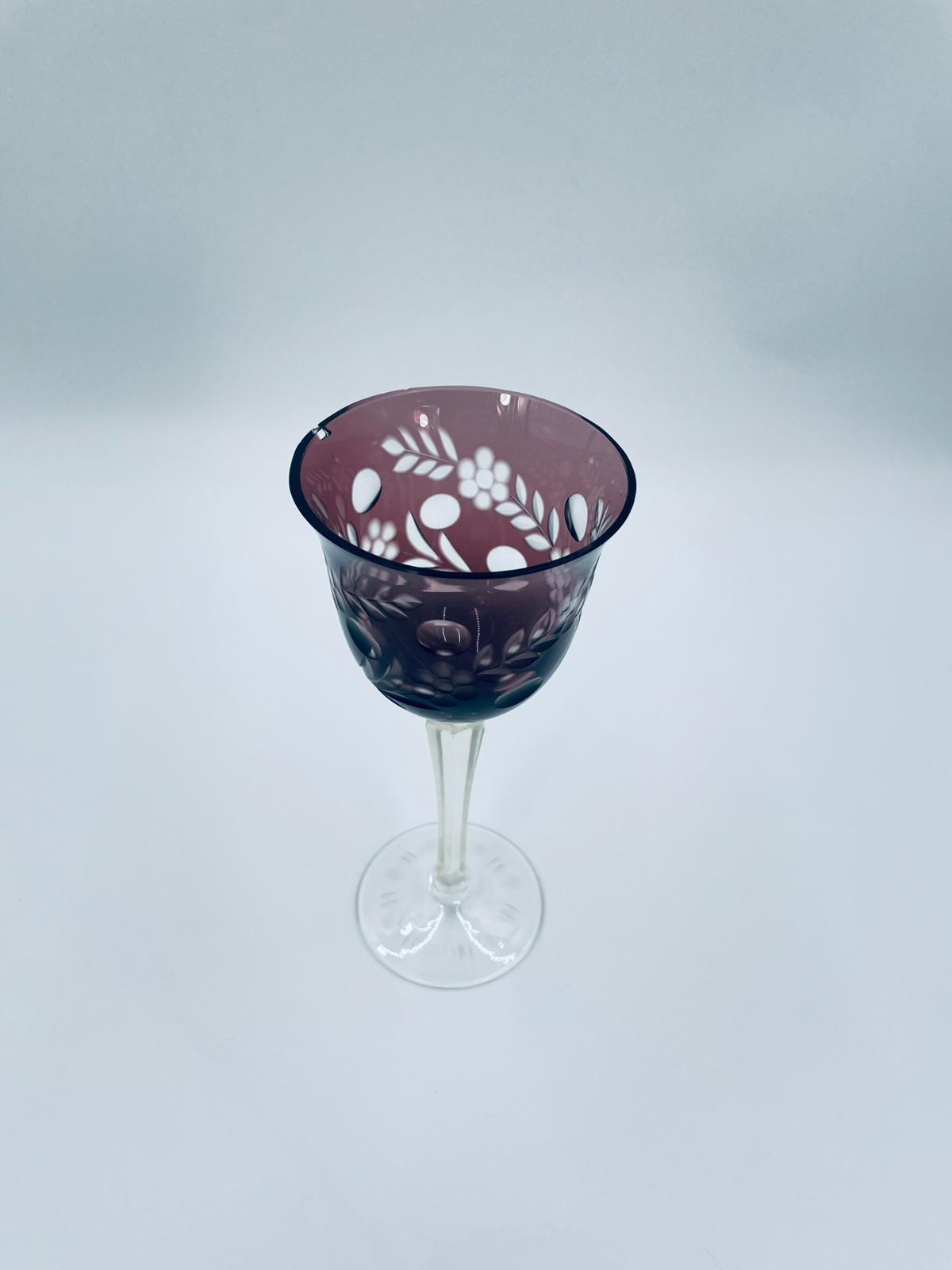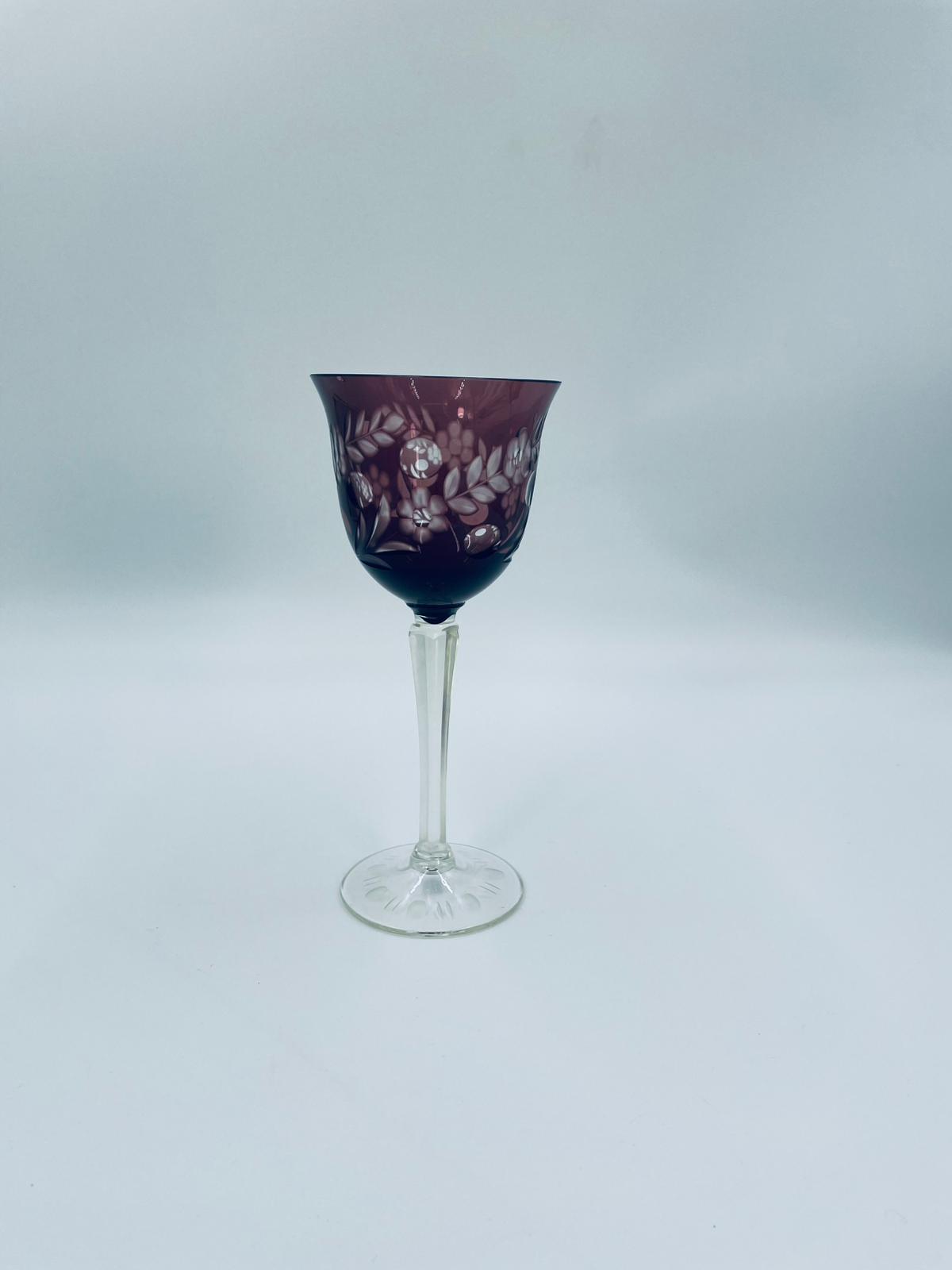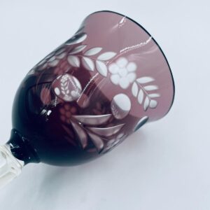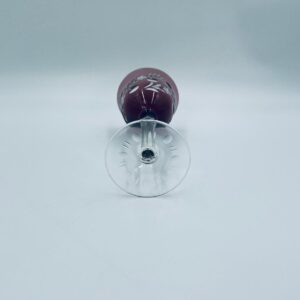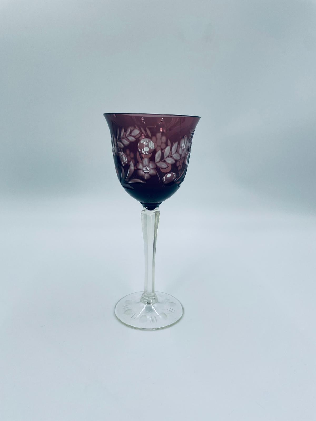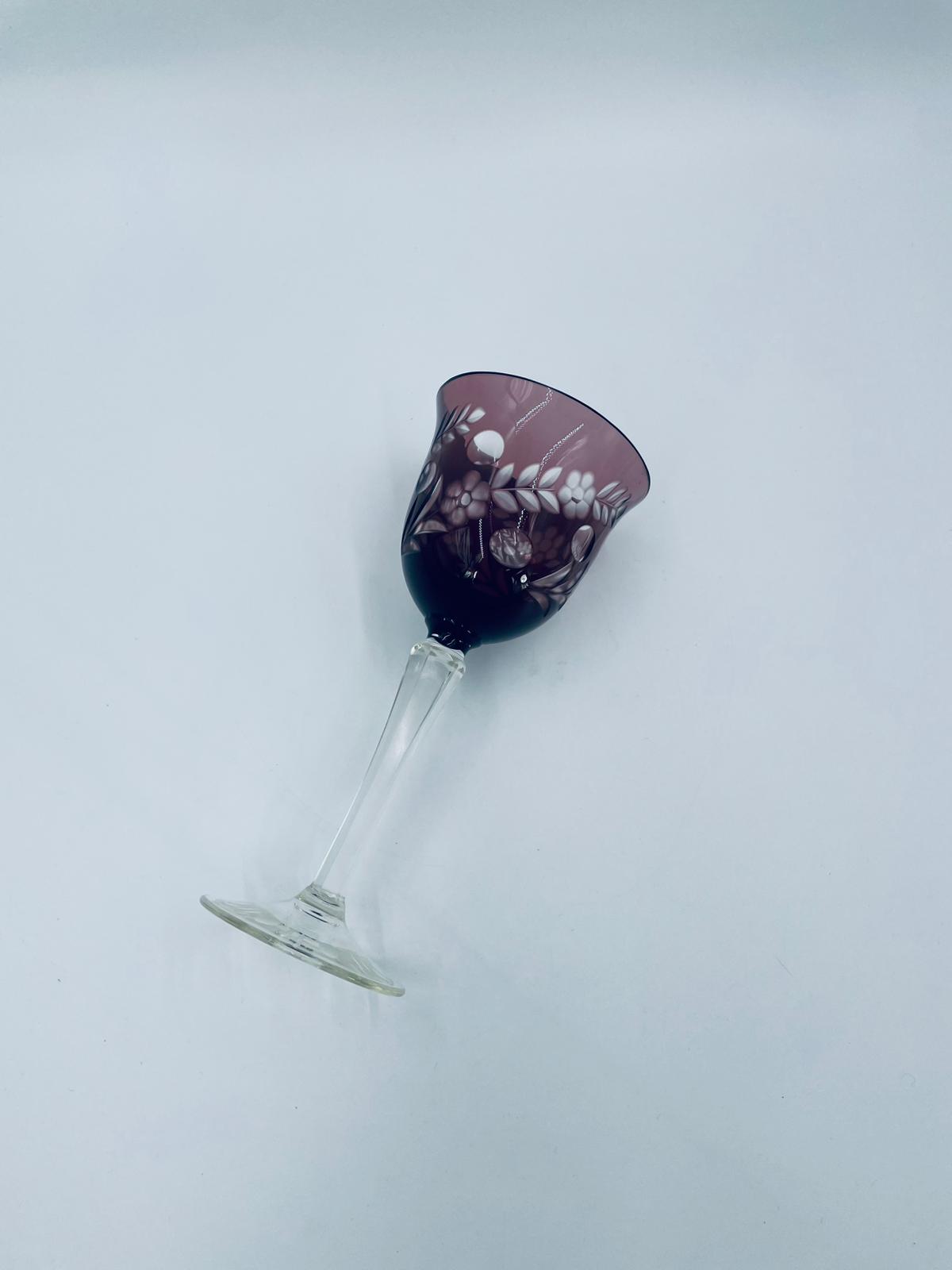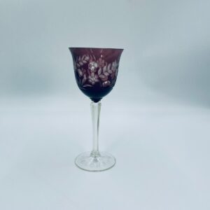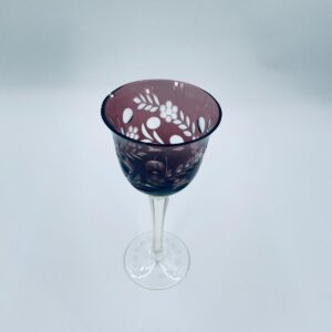 Kieliszek do wina typu Römer w stylu Vintage, wykonany z wysokiej jakości szkła kryształowego. Kieliszek posiada ametystową, czarę z ręcznie szlifowanym, ozdobnym wzorem z motywem kwiatowym , smukłą i fasetowana nóżkę oraz stabilna podstawę z precyzyjnym szlifem. Posiada mały uszczerbek na górnym rancie.