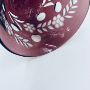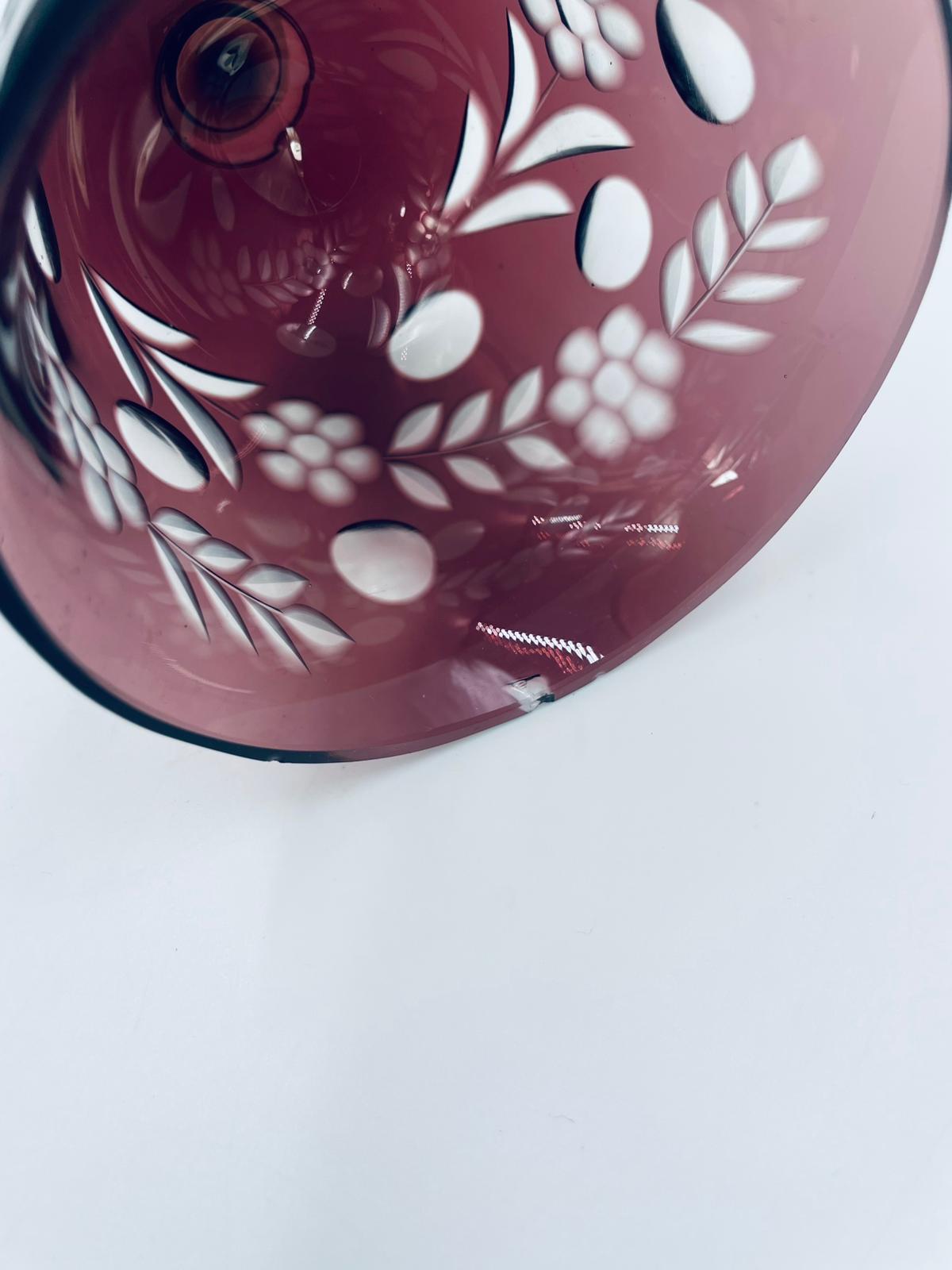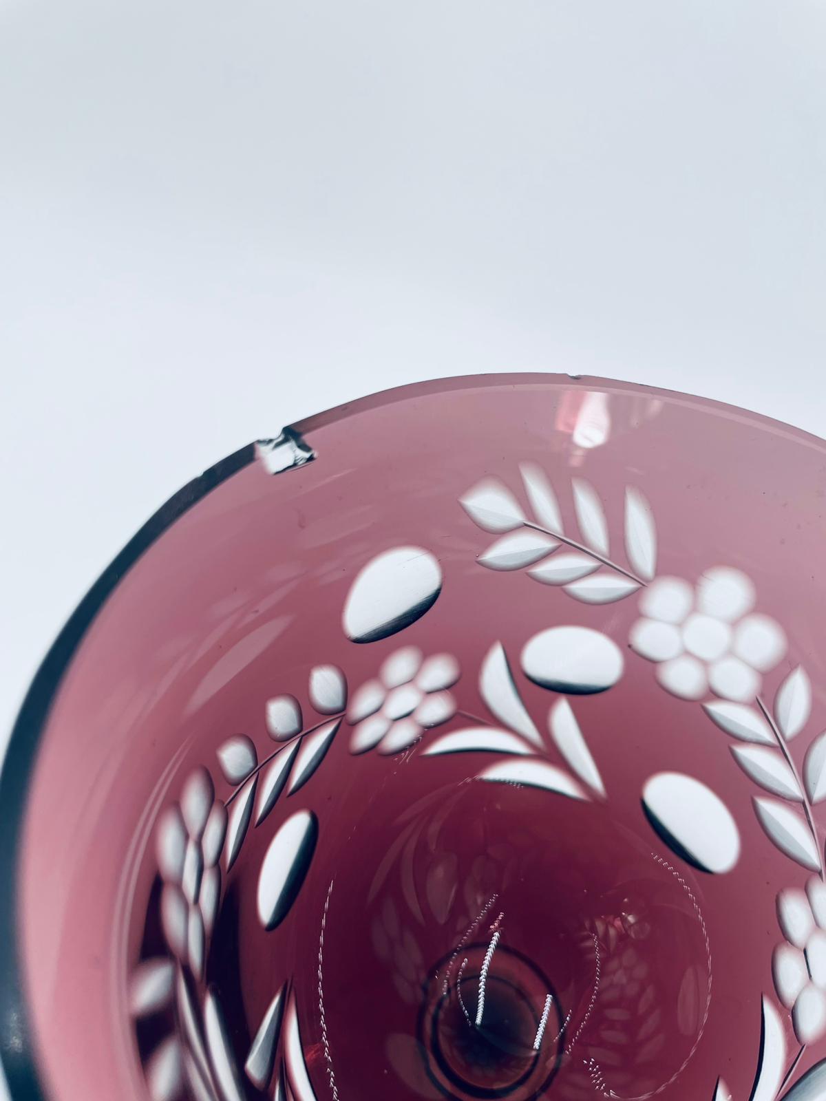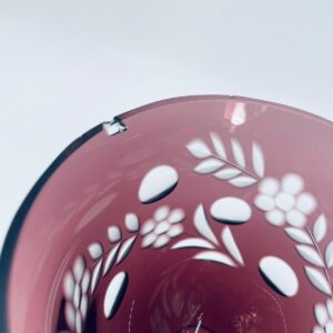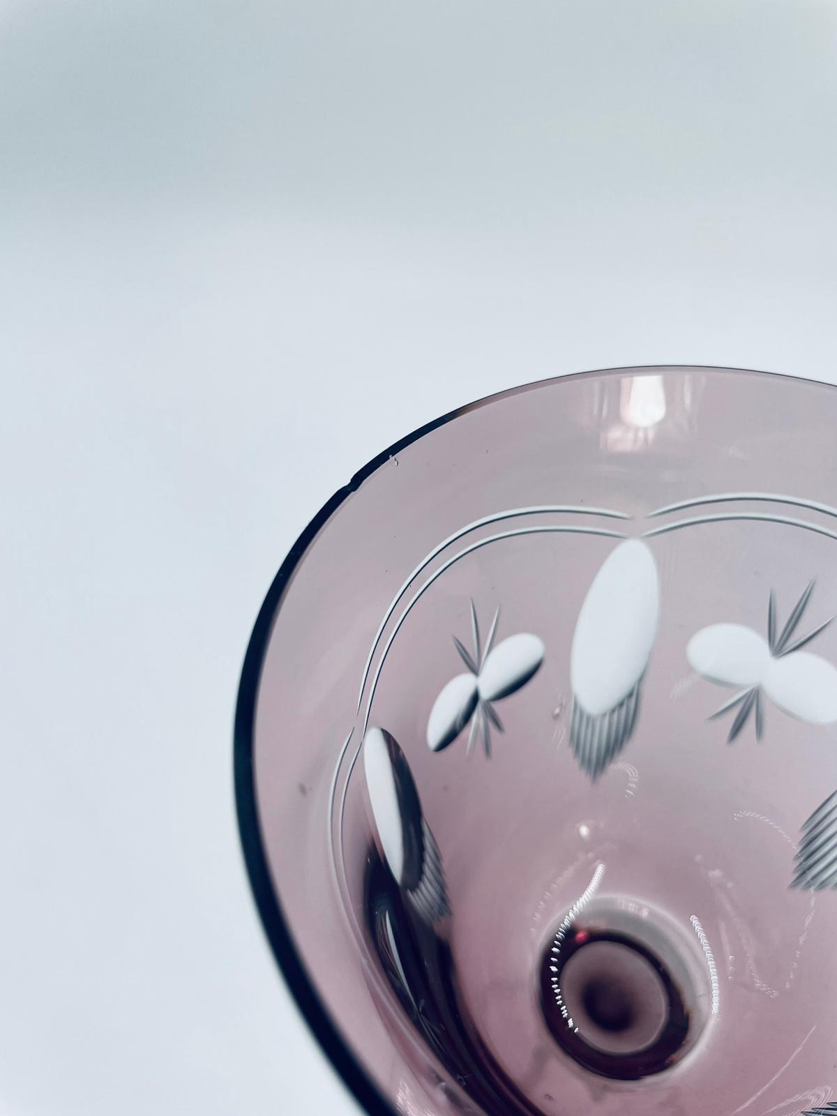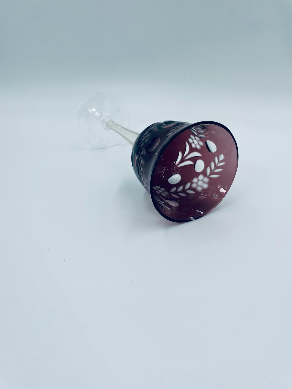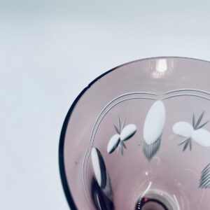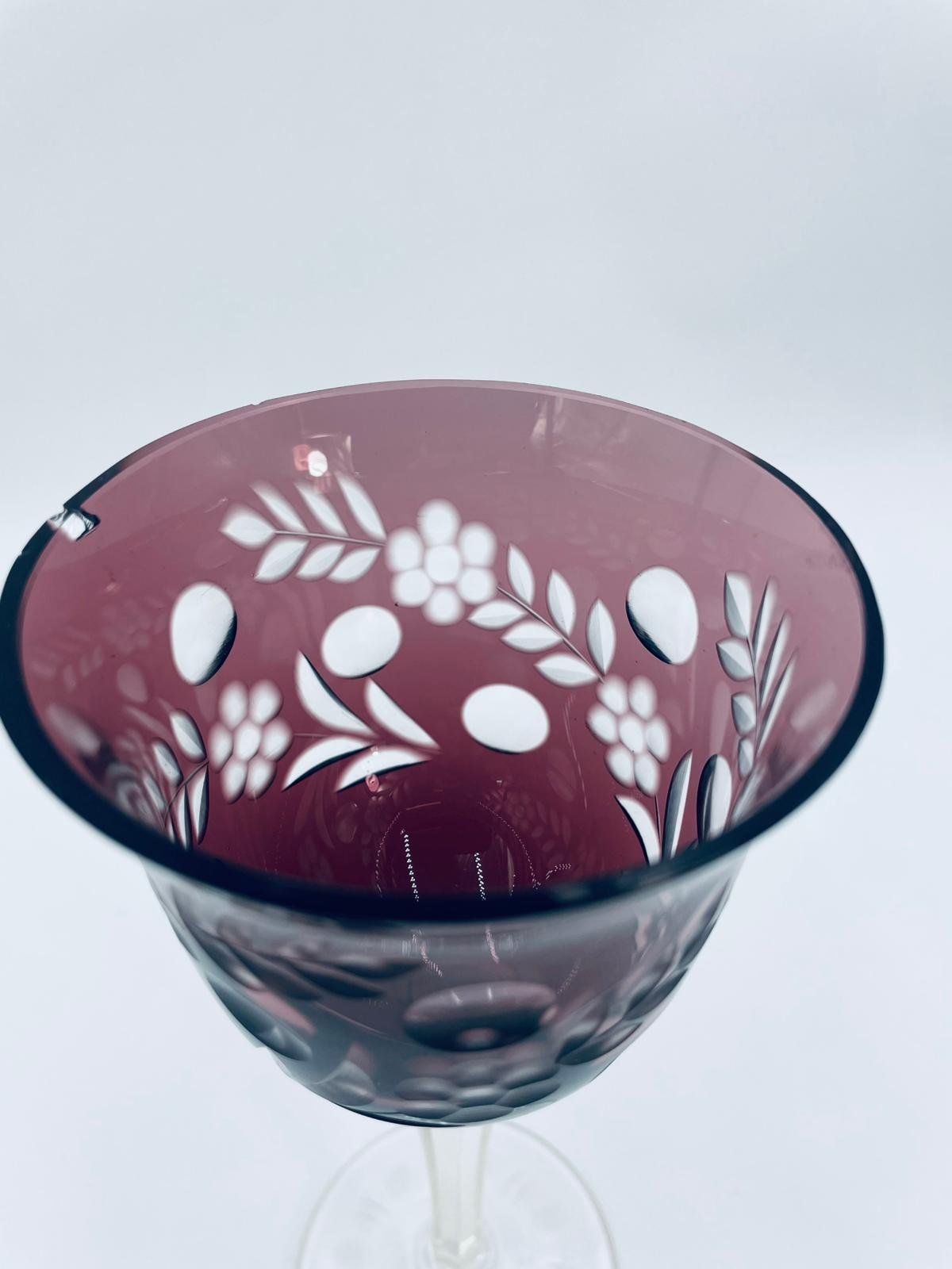 Kieliszek do wina typu Römer w stylu Vintage, wykonany z wysokiej jakości szkła kryształowego. Kieliszek posiada ametystową, czarę z ręcznie szlifowanym, ozdobnym wzorem z motywem kwiatowym , smukłą i fasetowana nóżkę oraz stabilna podstawę z precyzyjnym szlifem. Posiada mały uszczerbek na górnym rancie.