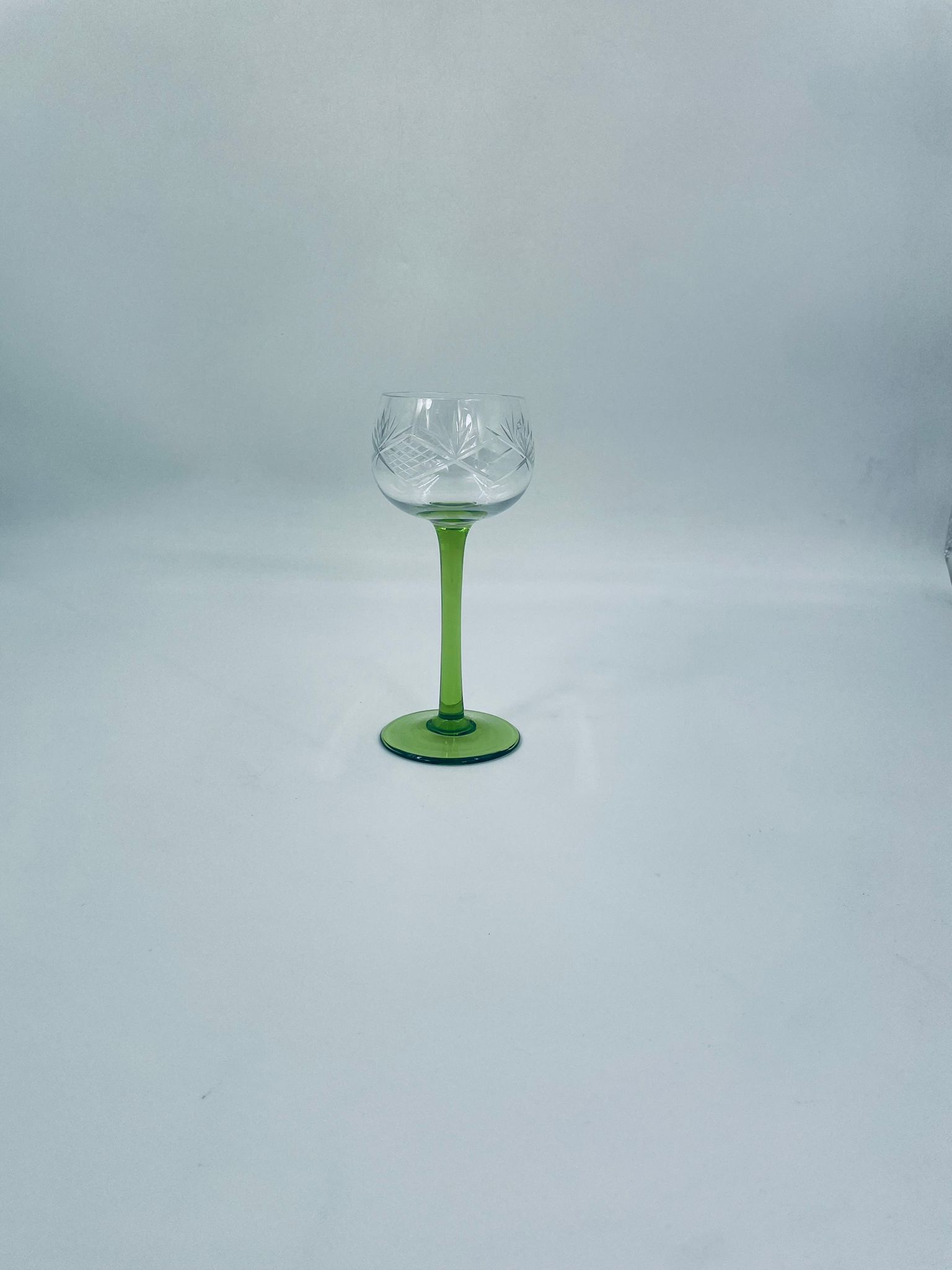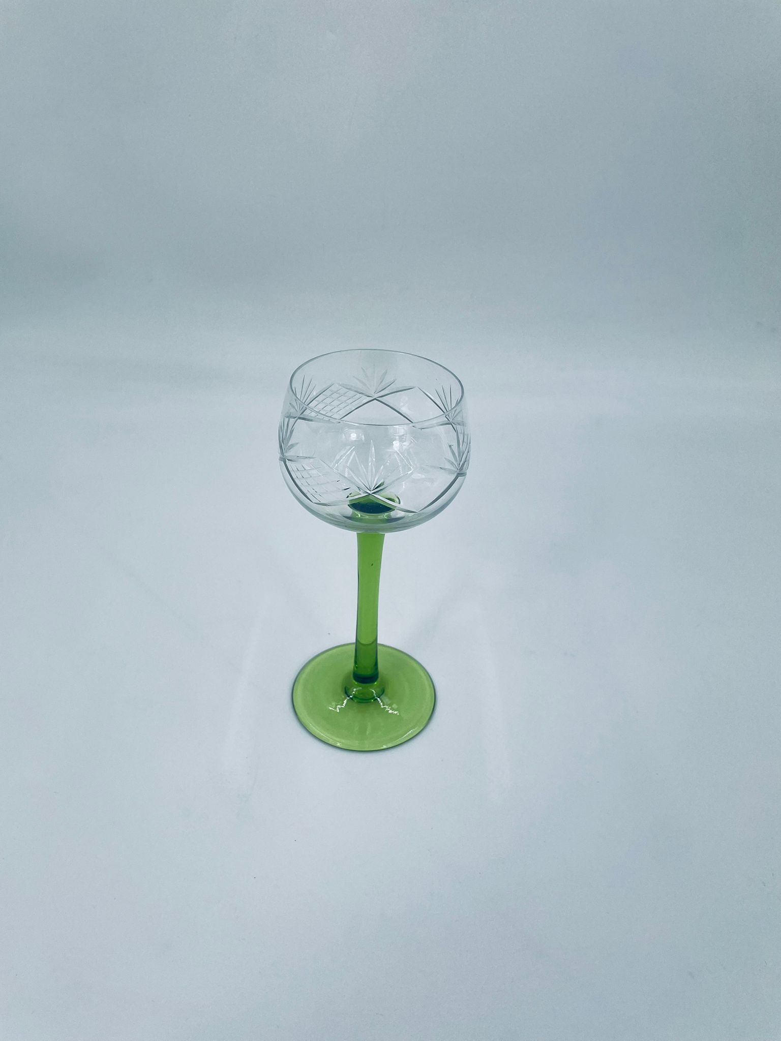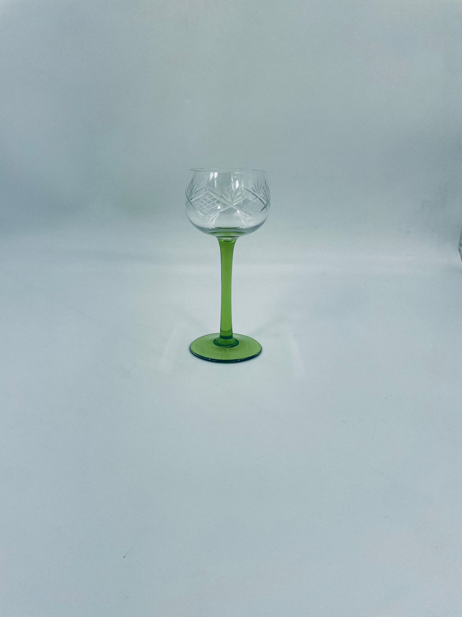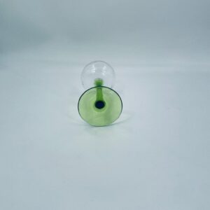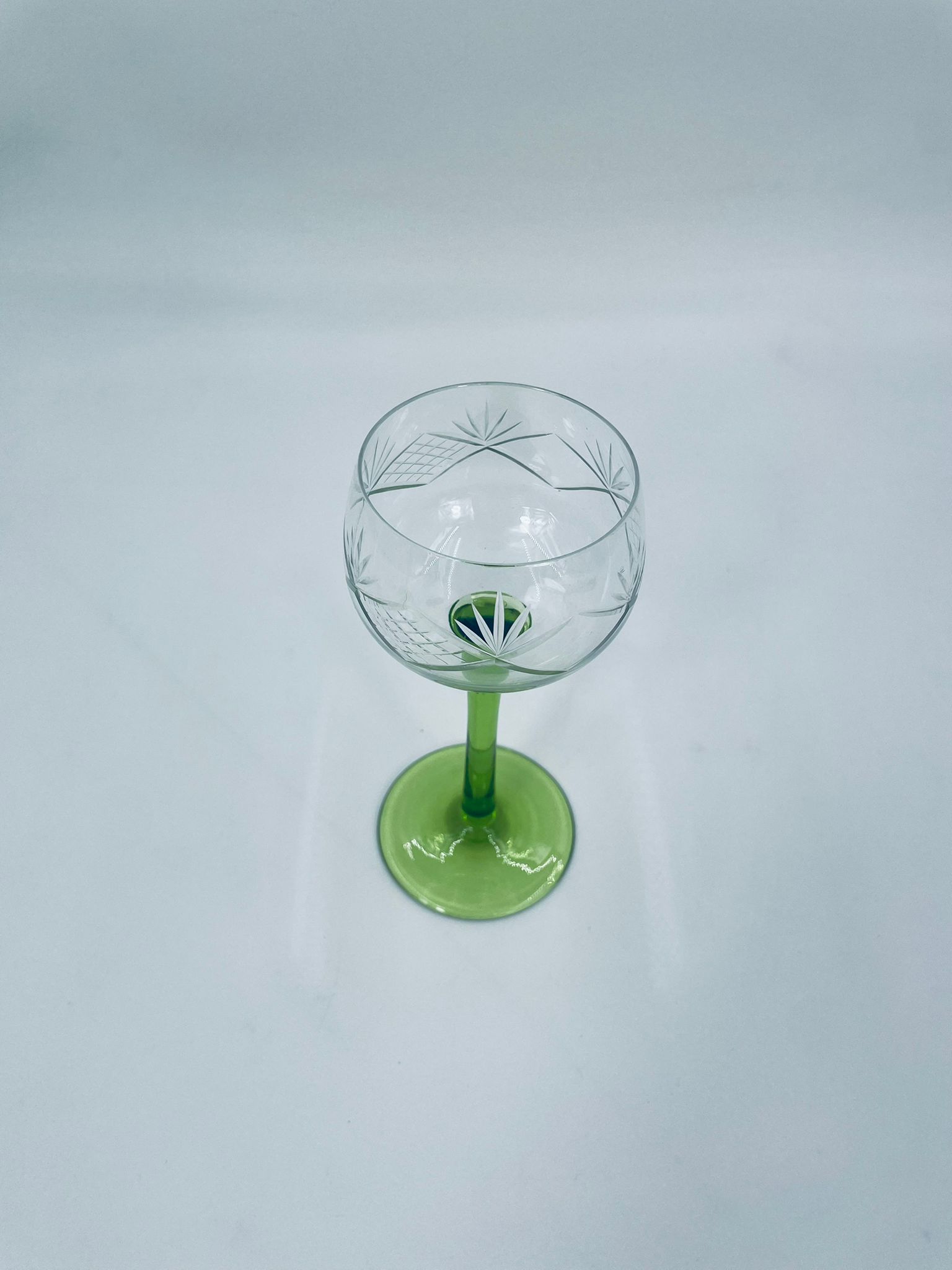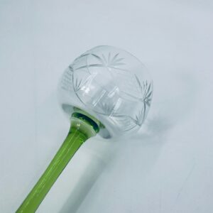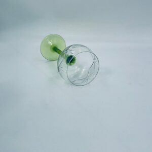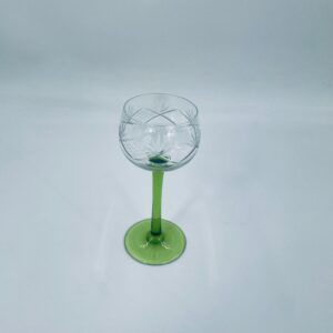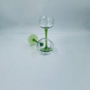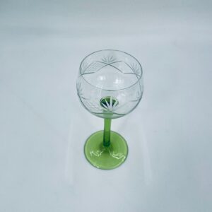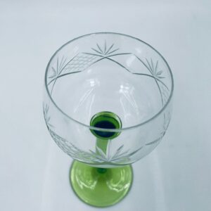Kieliszek do wina w stylu Vintage, wykonany z wysokiej jakości szkła kryształowego. Kieliszek na zielonej nóżce i podstawie, czara z ozdobnym, grawerowanym wzorem.