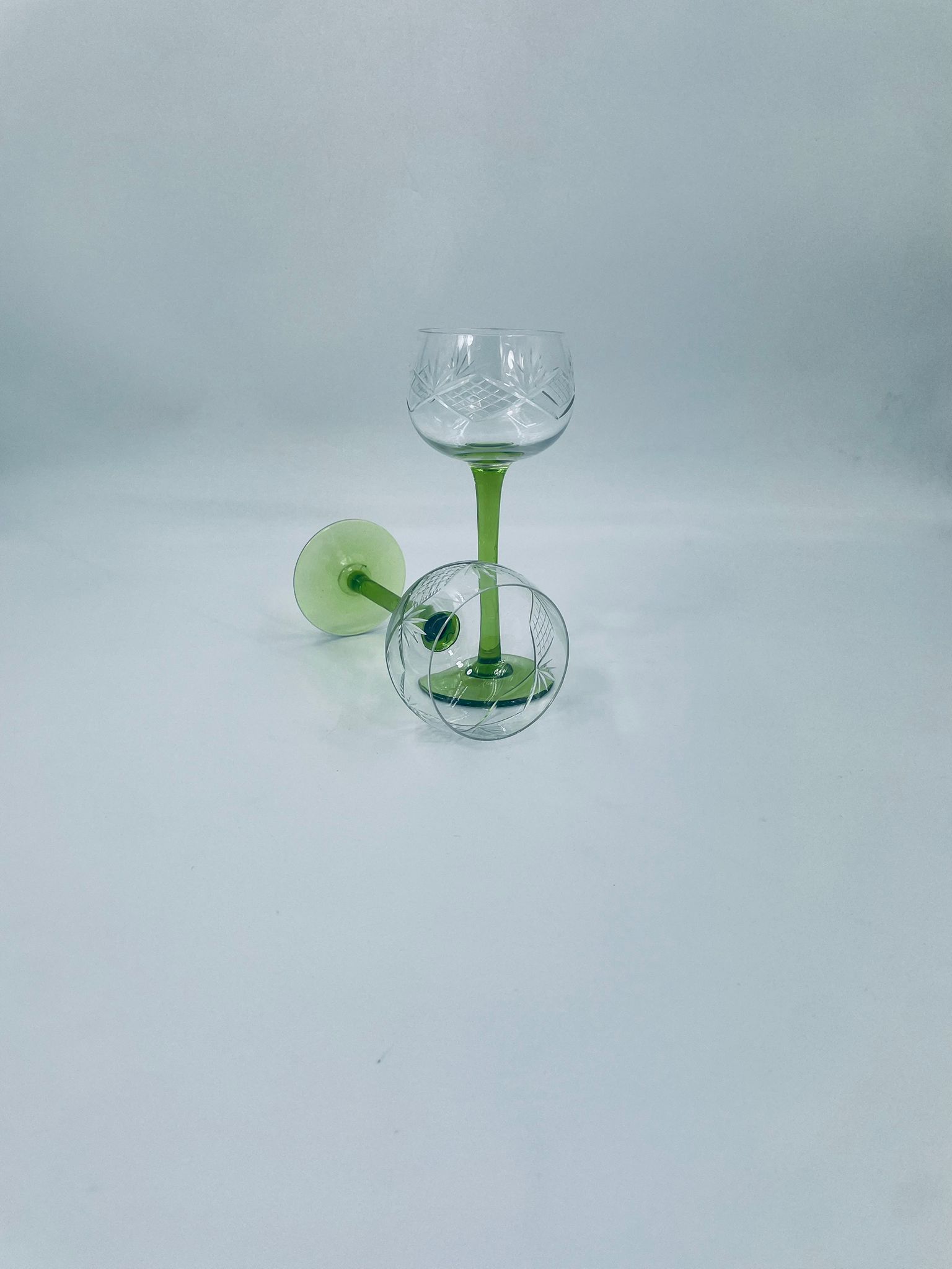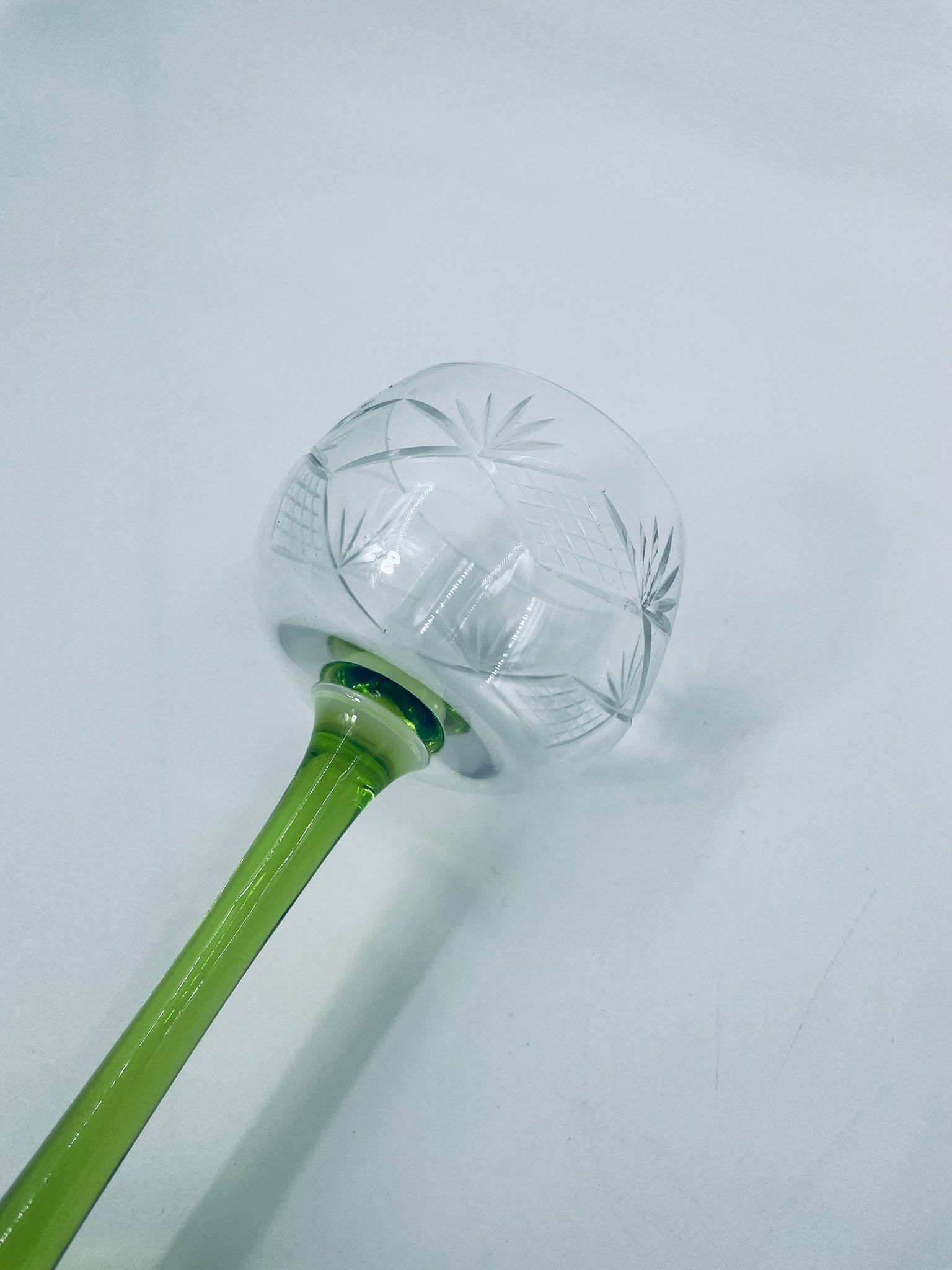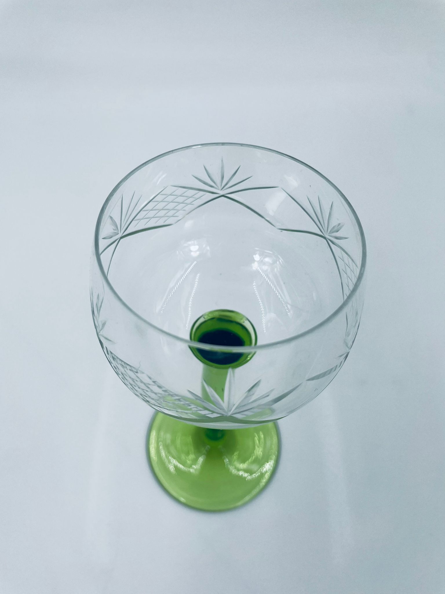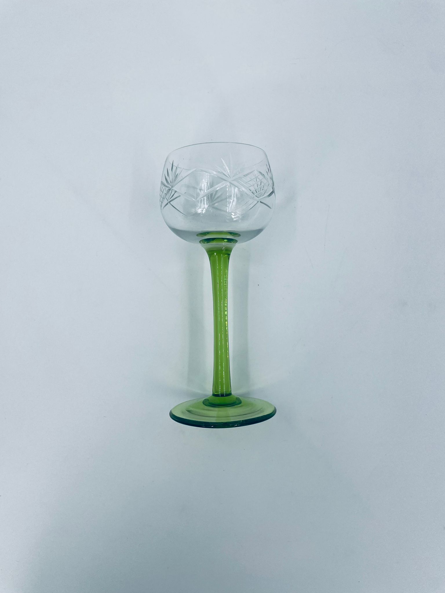 Kieliszek do wina w stylu Vintage, wykonany z wysokiej jakości szkła kryształowego. Kieliszek na zielonej nóżce i podstawie, czara z ozdobnym, grawerowanym wzorem.