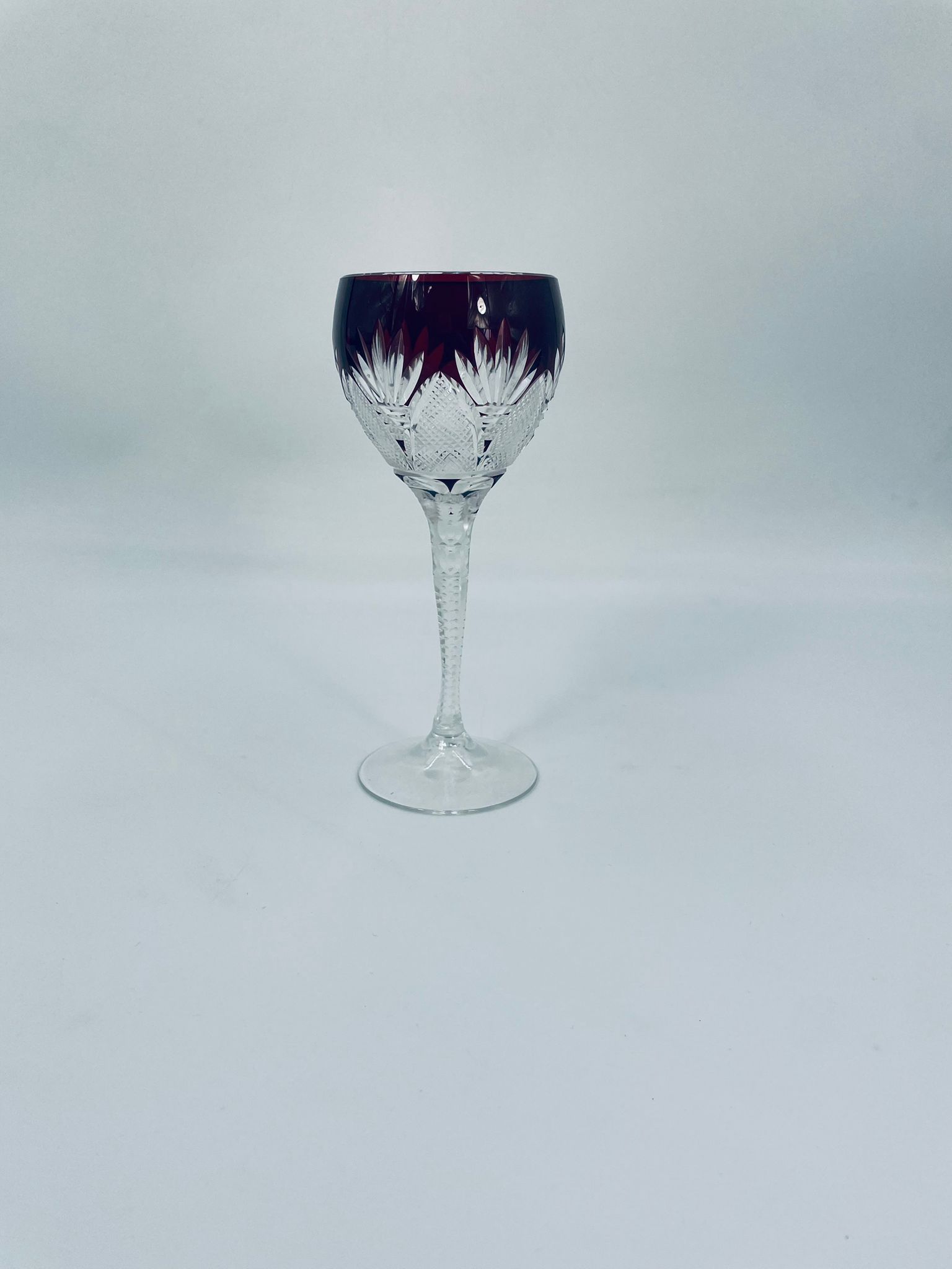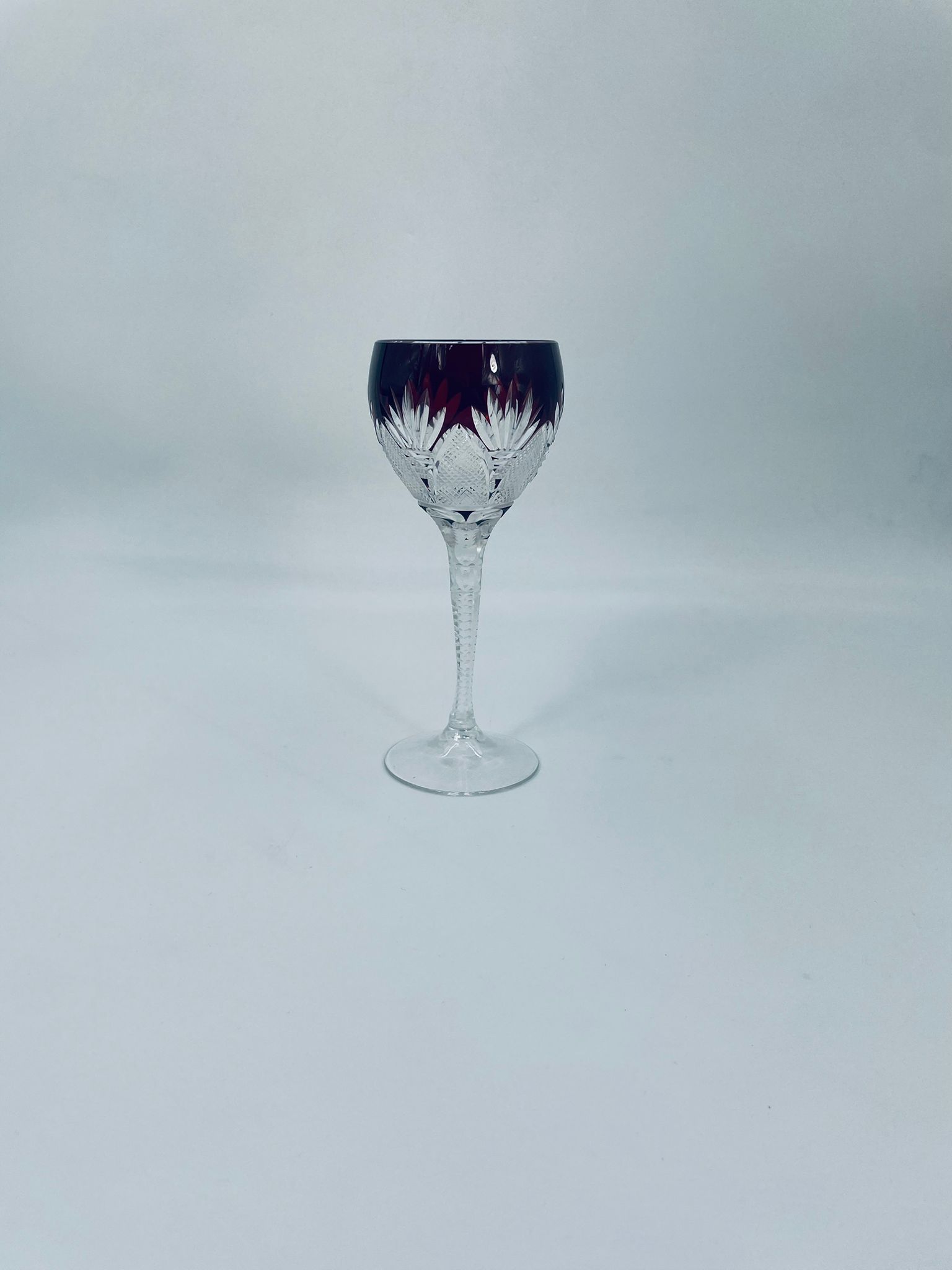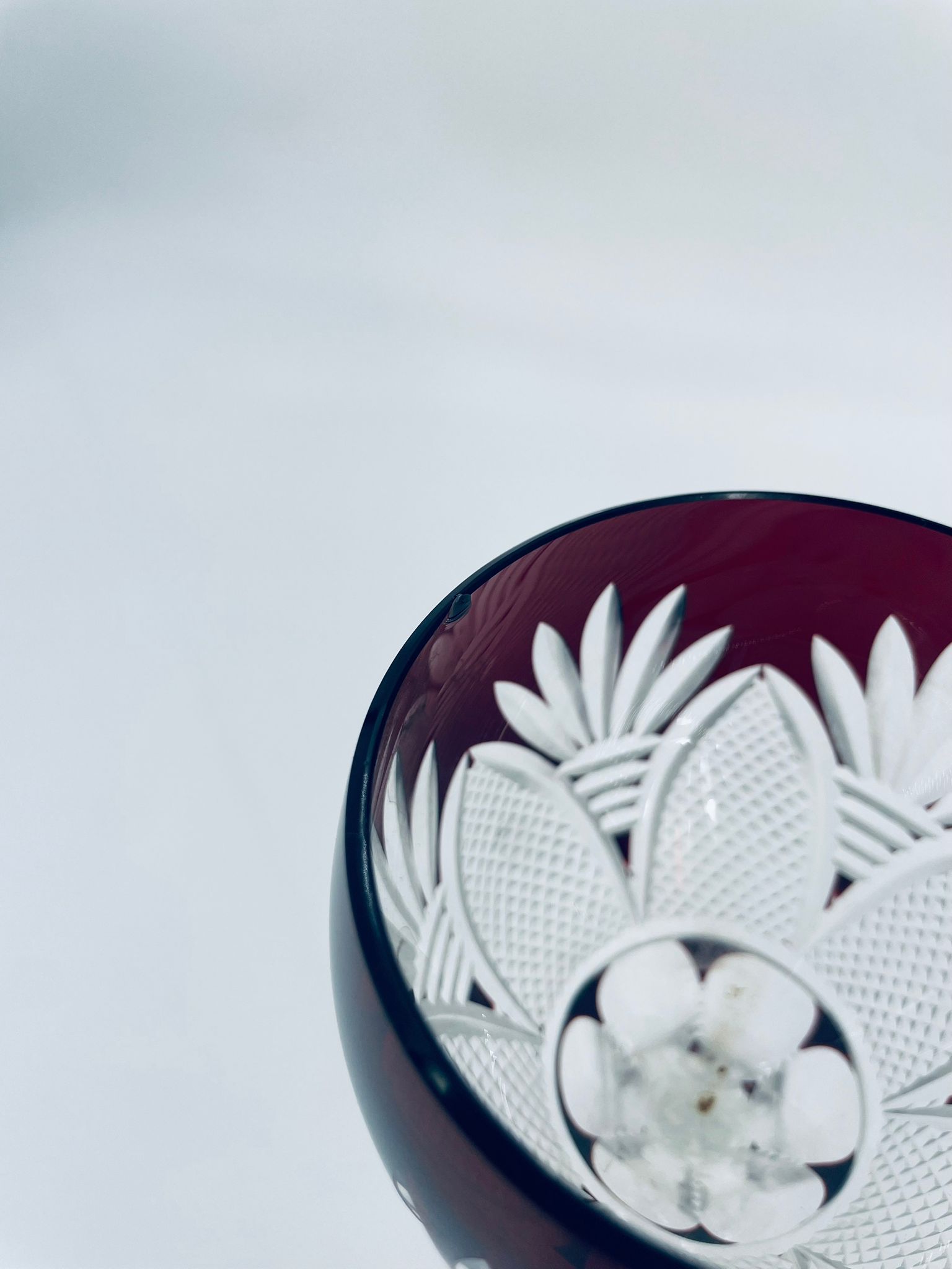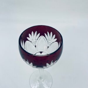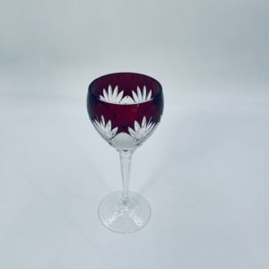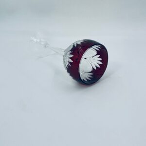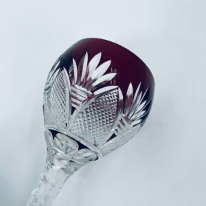 Kieliszek do wina w stylu Vintage, wykonany z wysokiej jakości szkła kryształowego. Charakteryzuje się czerwoną rubinową barwą oraz misternym, bogato szlifowanym wzorem, który nadaje mu luksusowego wyglądu. Posiada małe uszczerbienie na górnym rancie.