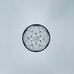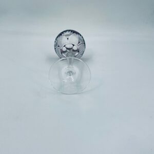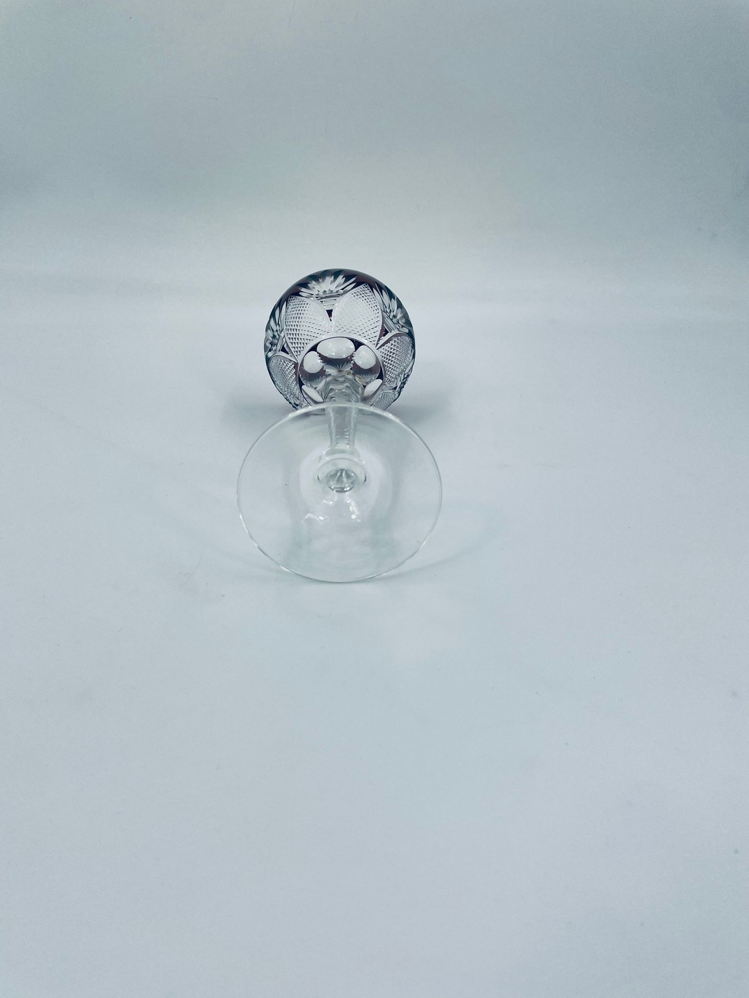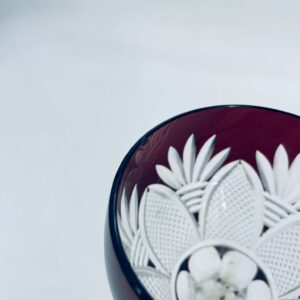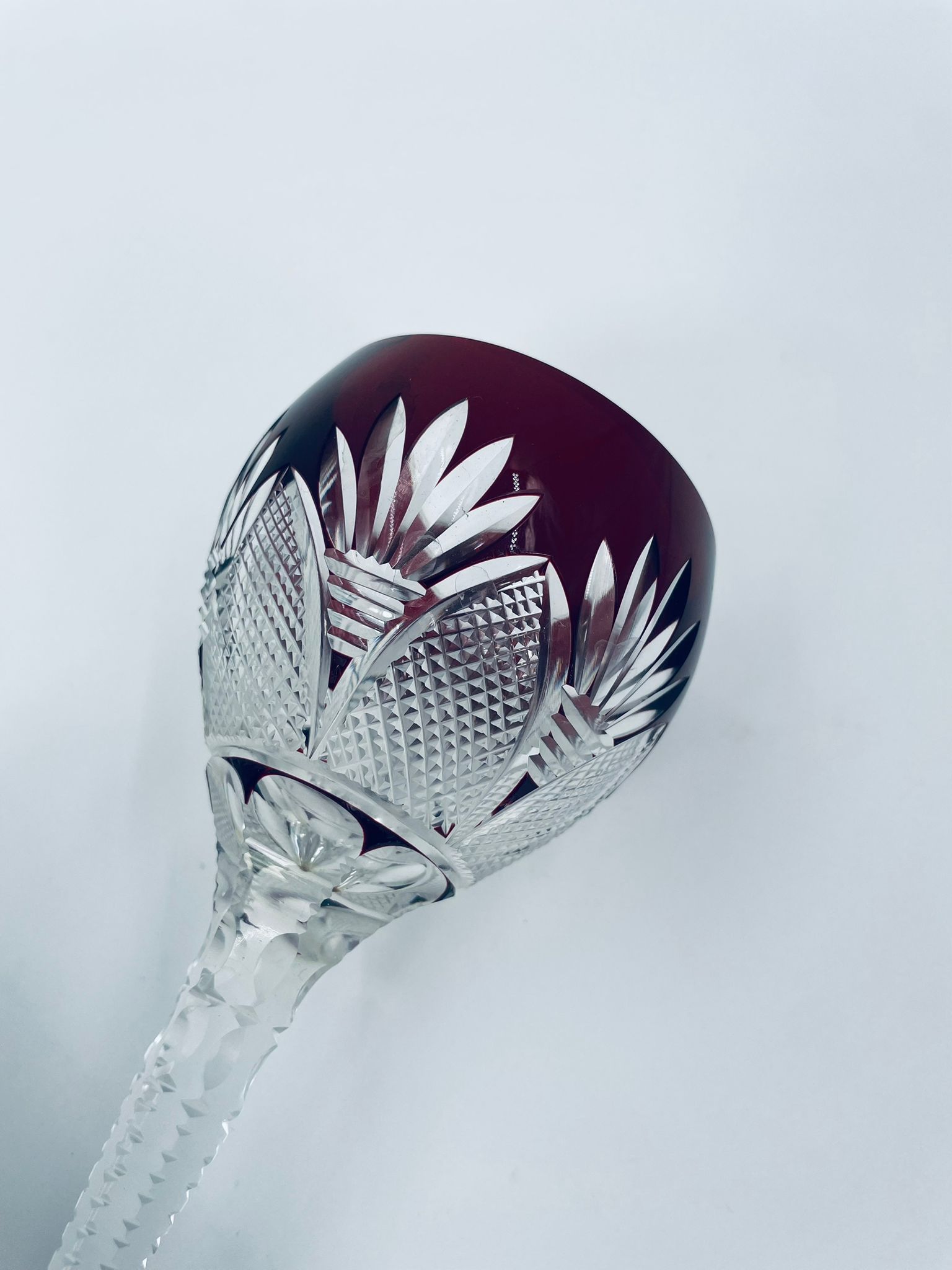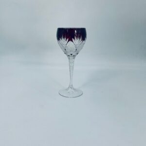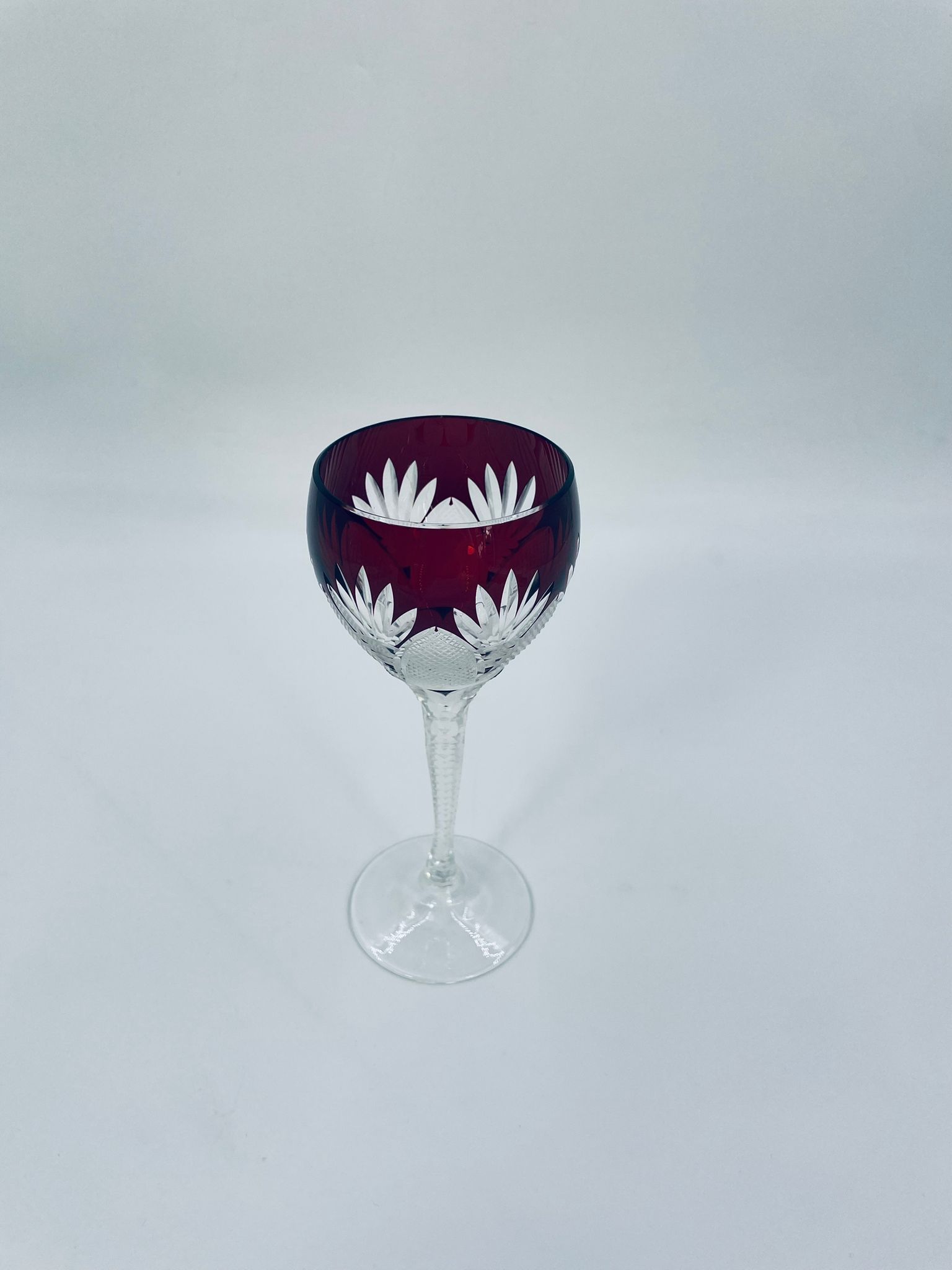 Kieliszek do wina w stylu Vintage, wykonany z wysokiej jakości szkła kryształowego. Charakteryzuje się czerwoną rubinową barwą oraz misternym, bogato szlifowanym wzorem, który nadaje mu luksusowego wyglądu. Posiada małe uszczerbienie na górnym rancie.
