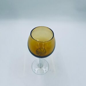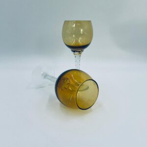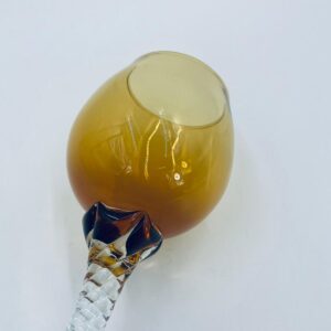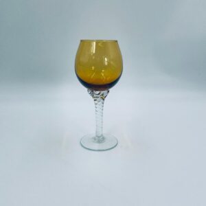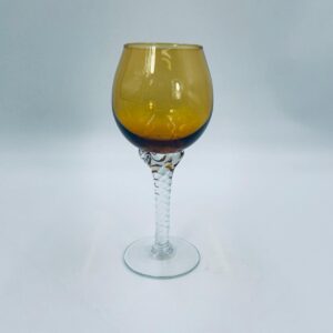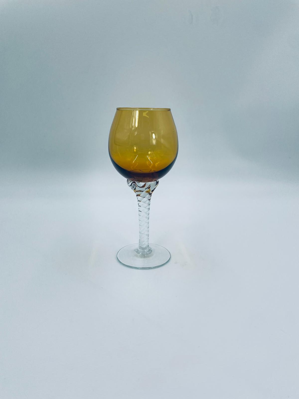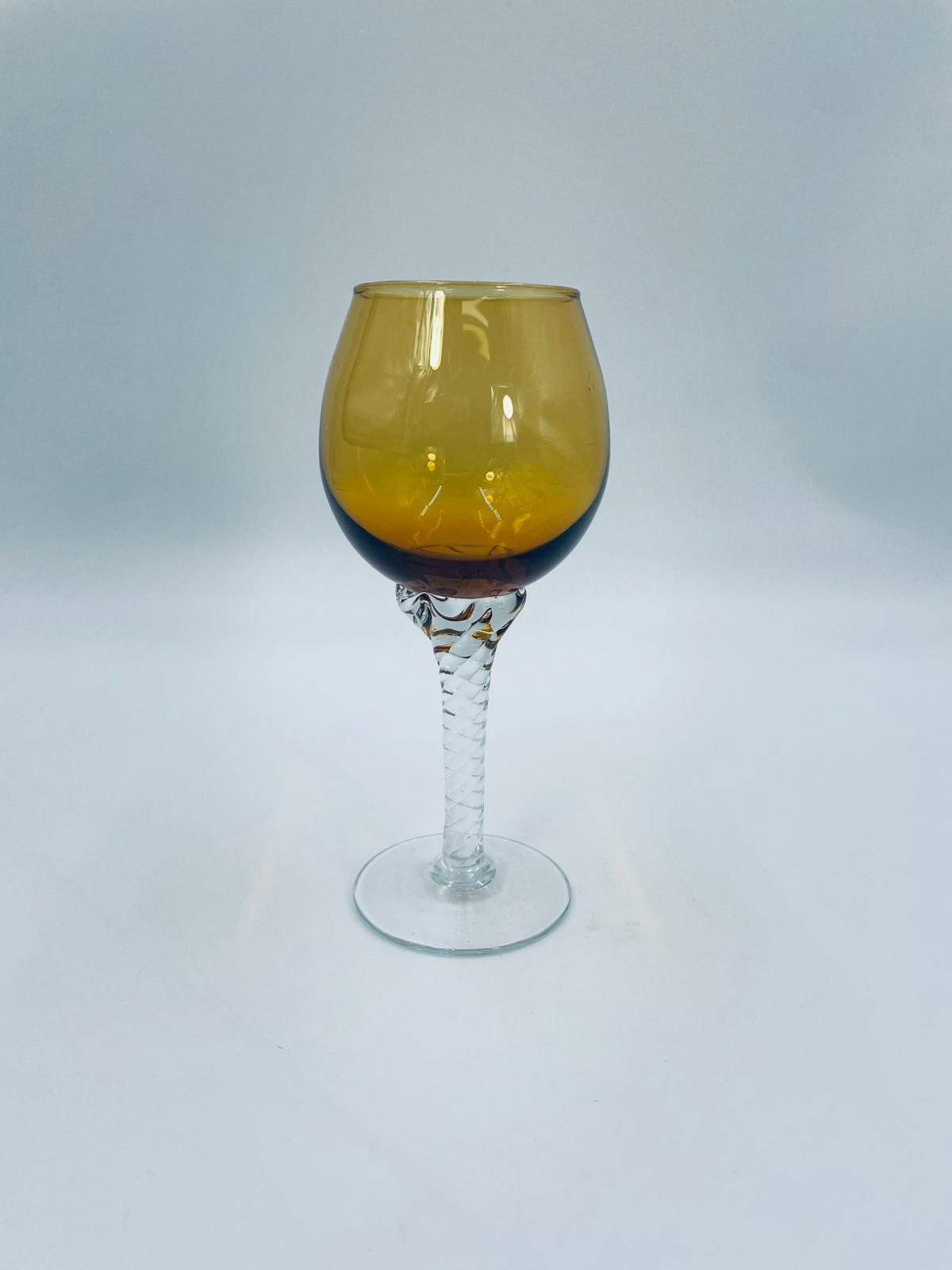 Kieliszek do wina Włoski, z lat 50 i 70tych XX wieku, w stylu Vintage, wykonany z wysokiej jakości szkła kryształowego. Kieliszek charakteryzuje się barwiona na kolor miodowy czaszą oraz przeźroczystą skręconą/ plecioną nóżką i stabilną podstawą.