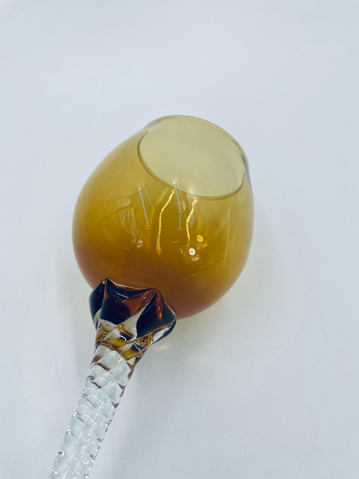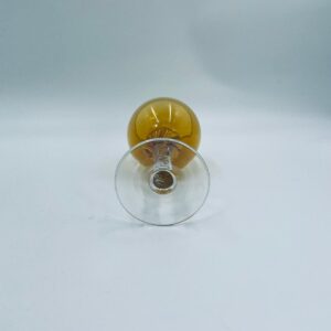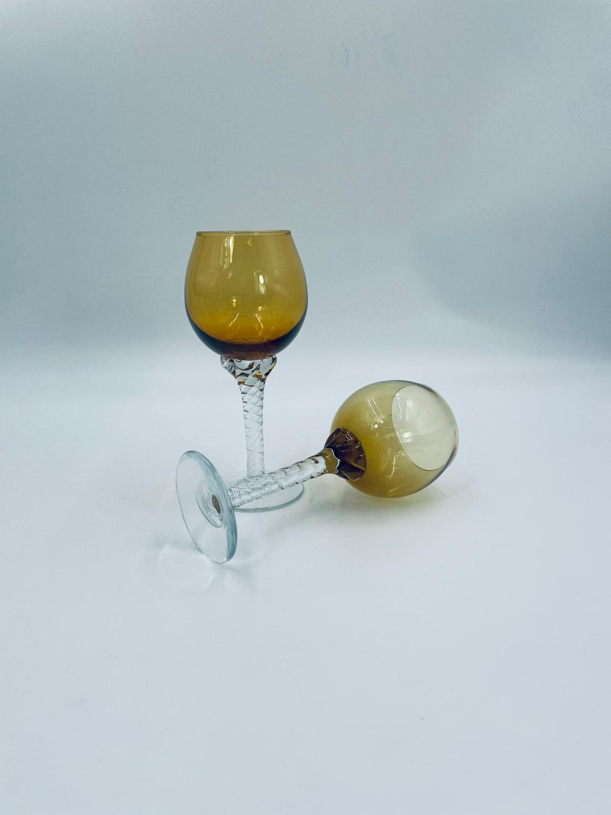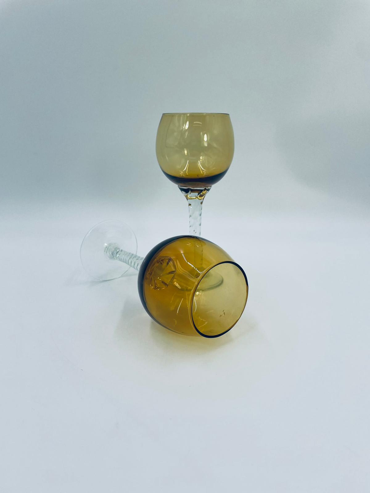 Kieliszek do wina Włoski, z lat 50 i 70tych XX wieku, w stylu Vintage, wykonany z wysokiej jakości szkła kryształowego. Kieliszek charakteryzuje się barwiona na kolor miodowy czaszą oraz przeźroczystą skręconą/ plecioną nóżką i stabilną podstawą.