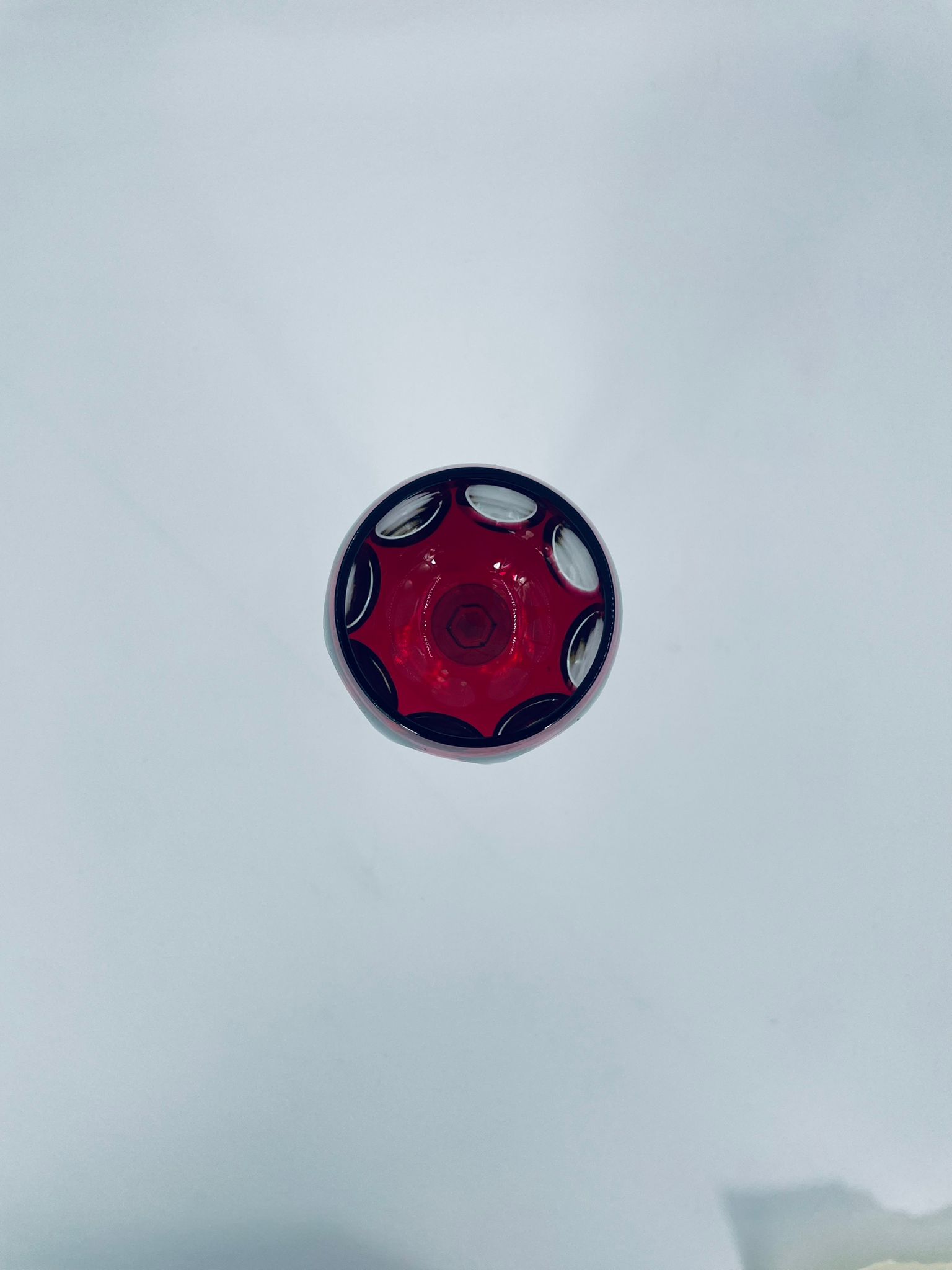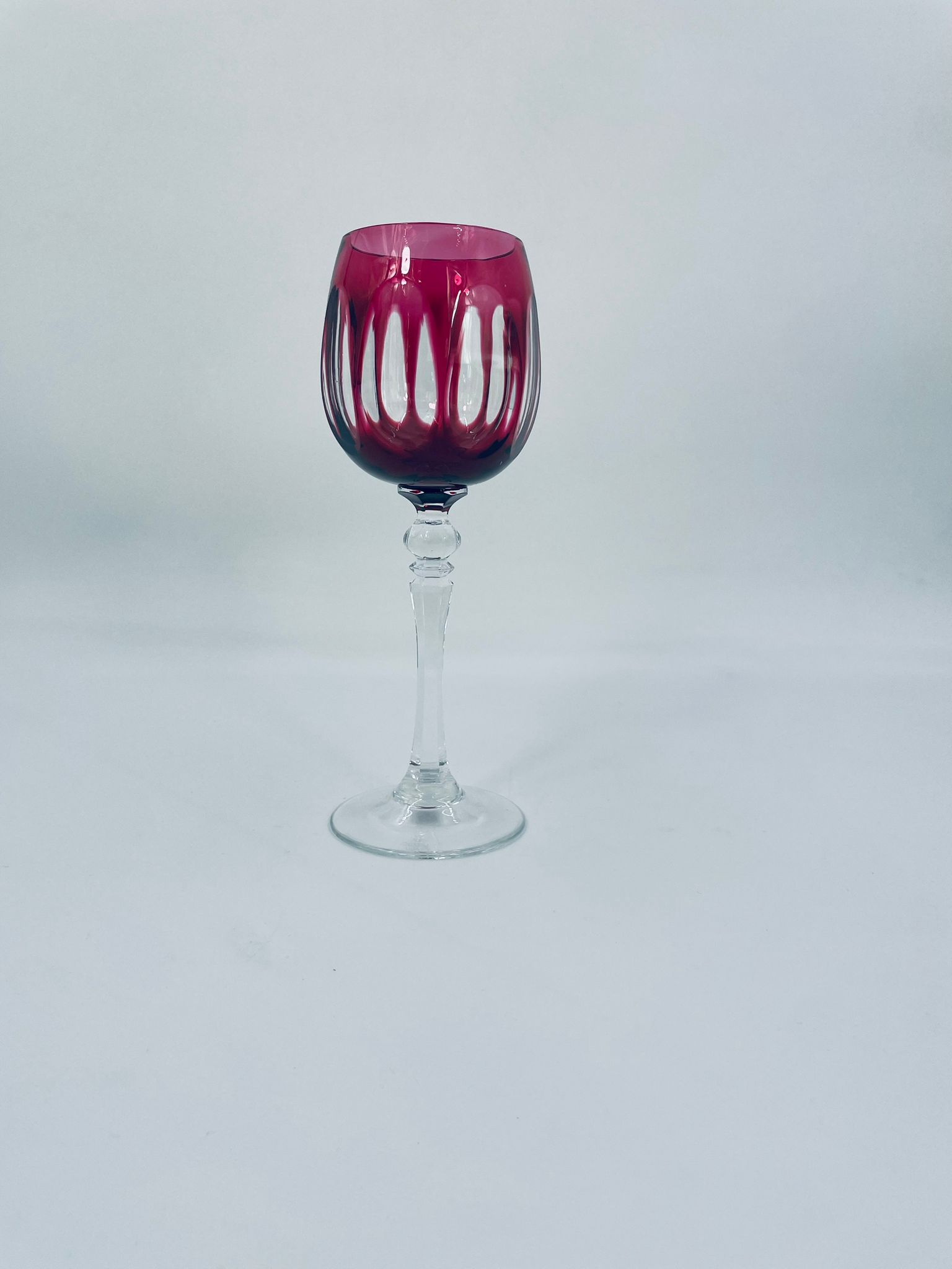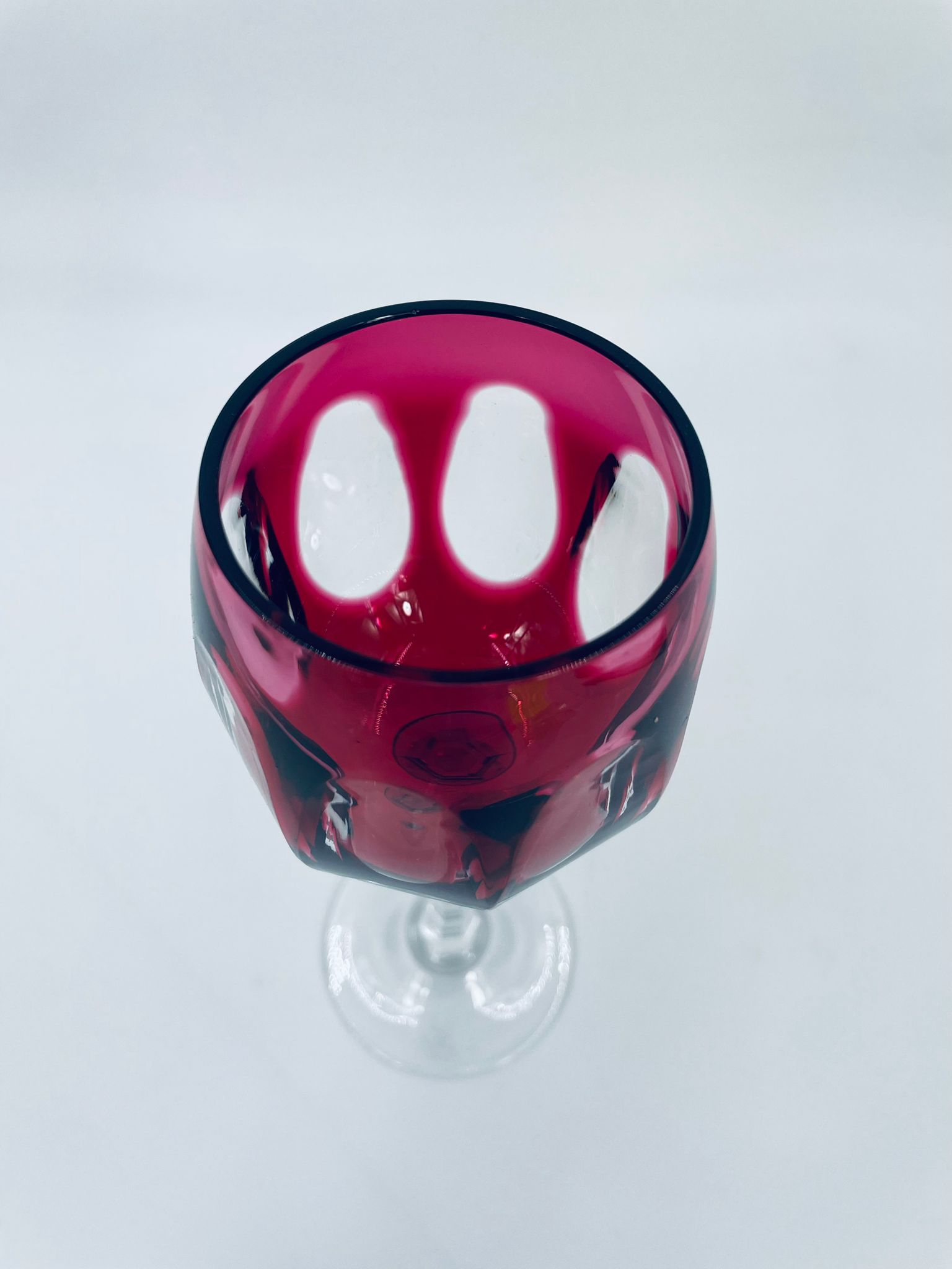 Kieliszek do wina renomowanej firmy WMF, wykonany z wysokiej jakości szkła kryształowego dwuwarstwowego, barwiony na kolor czerwony. Kieliszek ręcznie formowany, fasetowany i szlifowany.