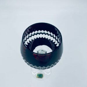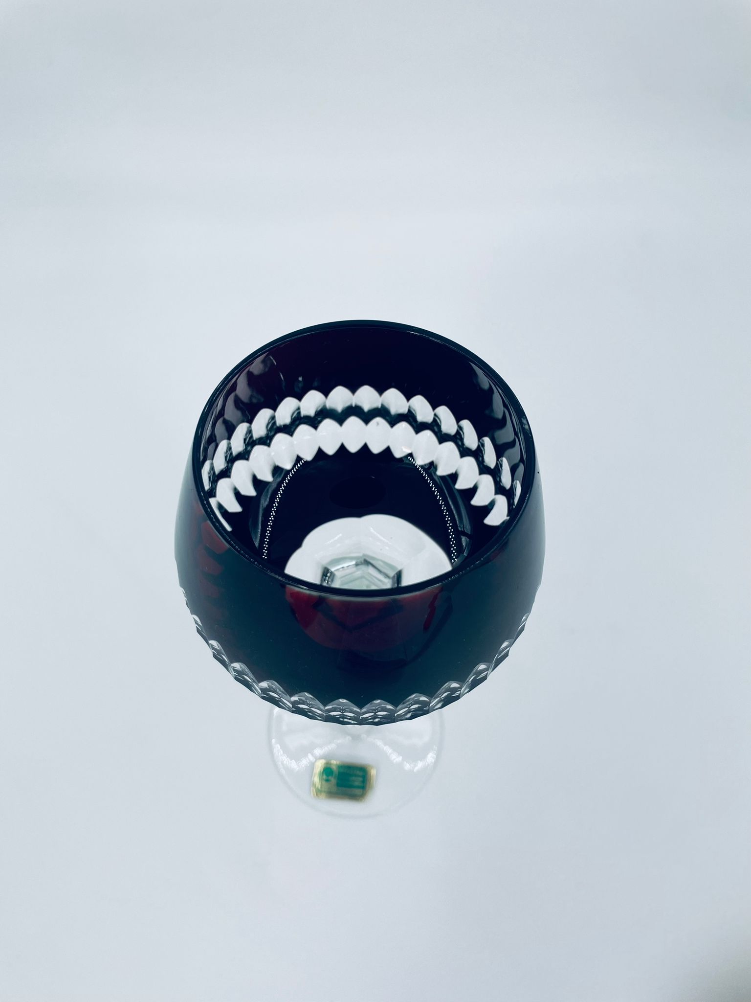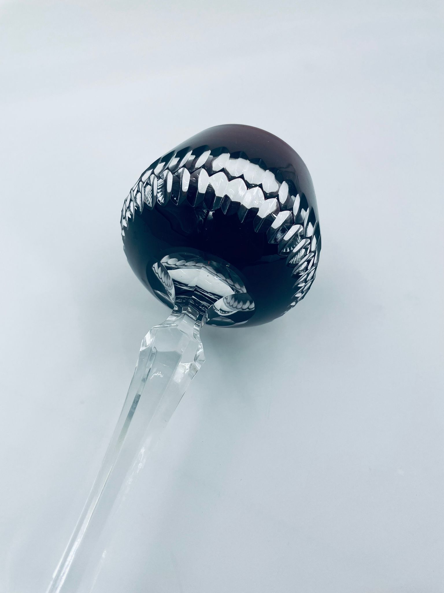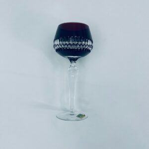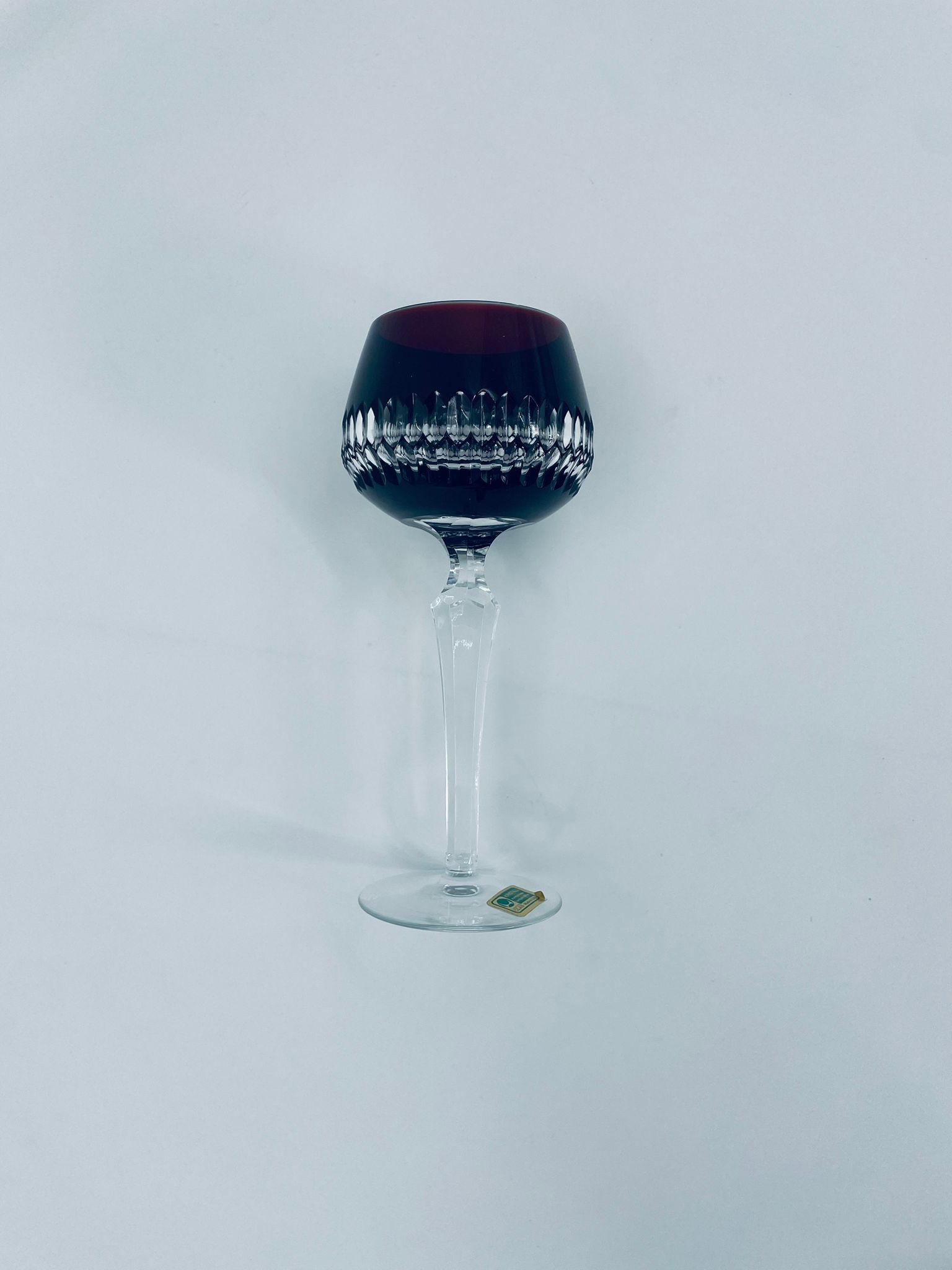 Kieliszek do wina marki Lausitzer Glas GDR, wykonany z wysokiej jakości szkła kryształowego barwionego na kolor rubinowej czerwieni. Czaszą posiada charakterystyczne, precyzyjne szlify, nóżka przezroczysta, fasetowana.