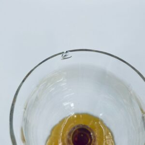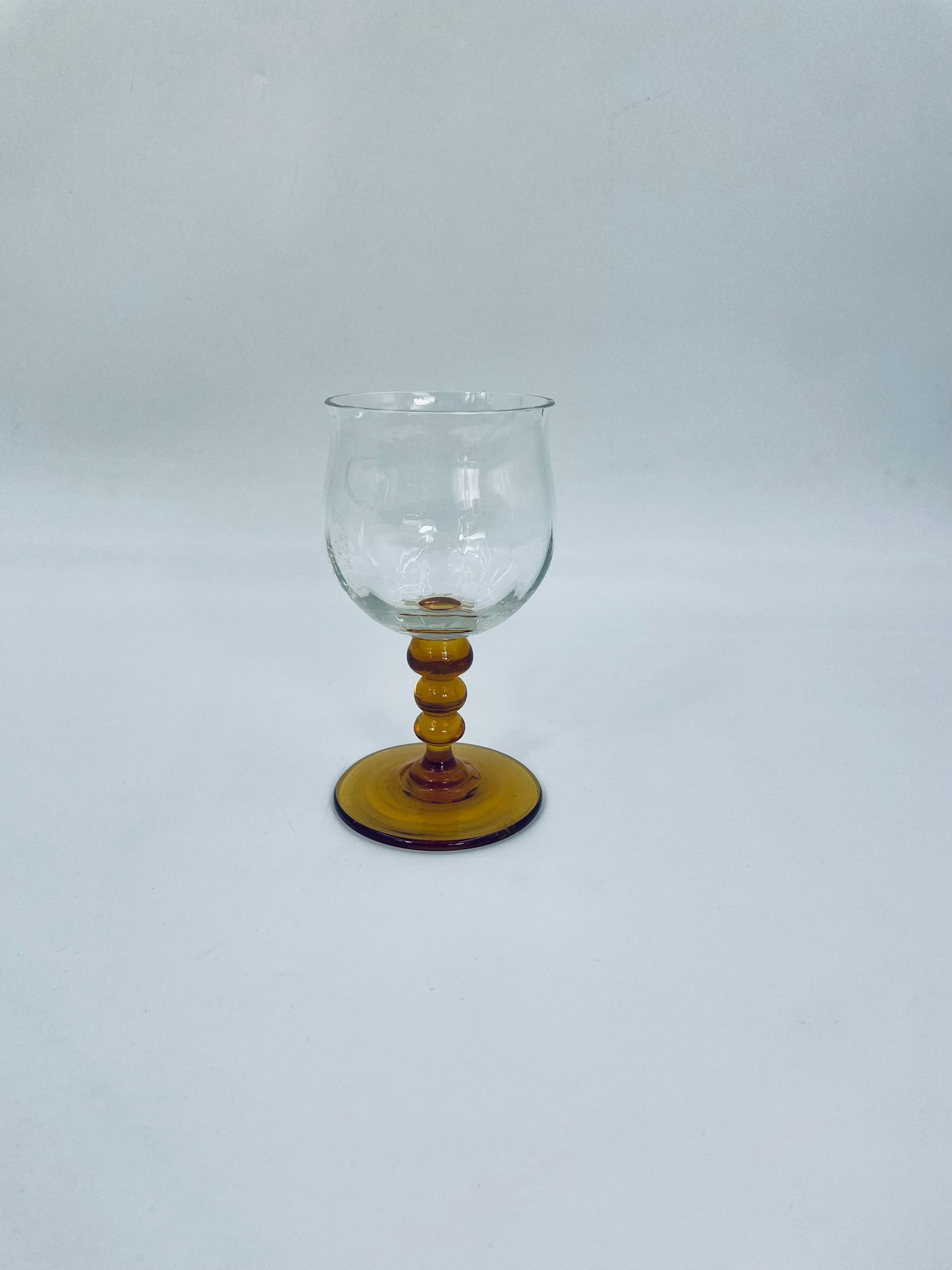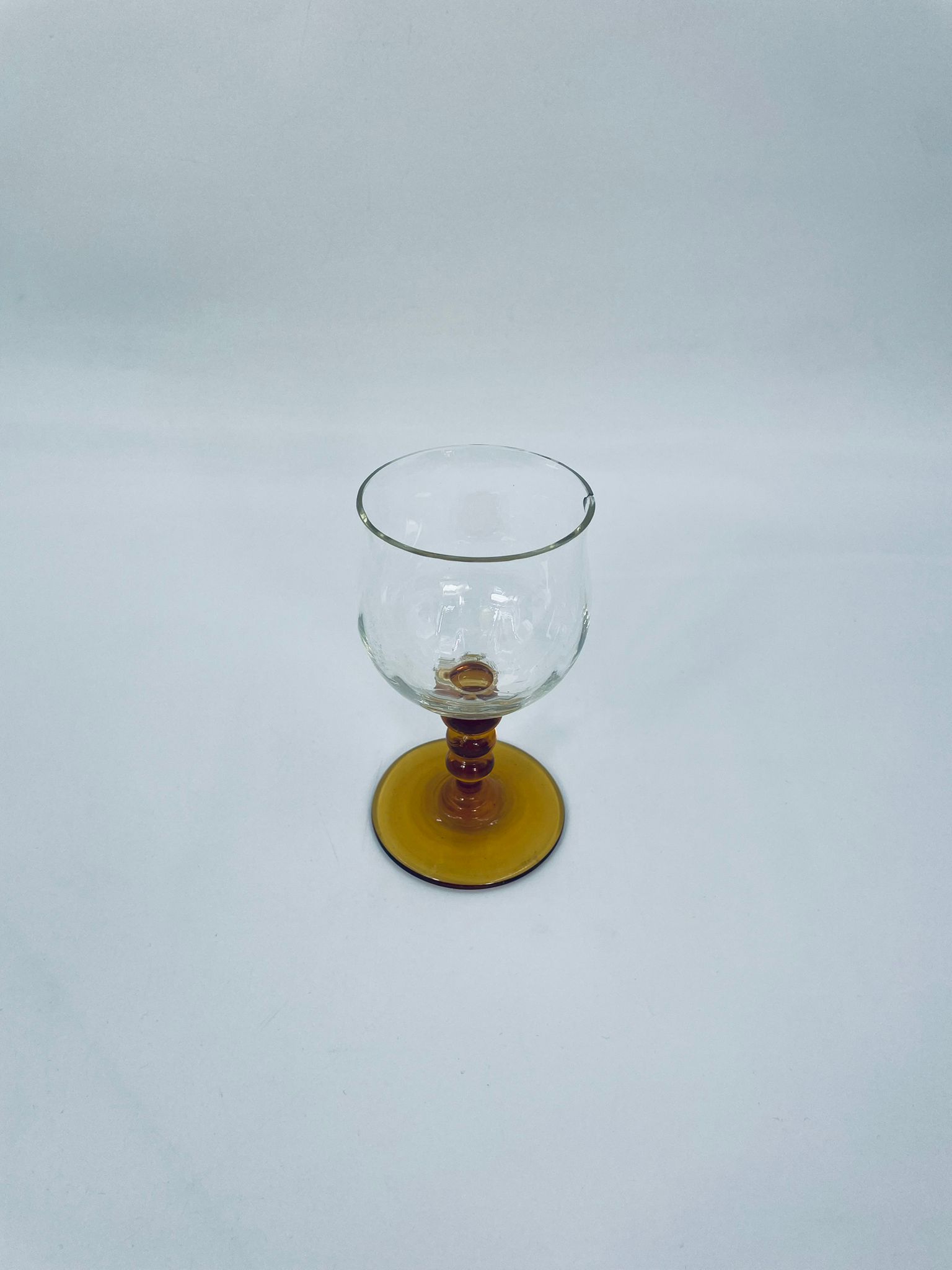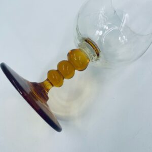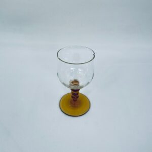 Kieliszek do wina typu Römer, wykonany z wysokiej jakości szkła kryształowego. Czasza kieliszka przezroczysta, nóżka ozdobna, bursztynowa. Posiada uszczerbek na górnym rancie.