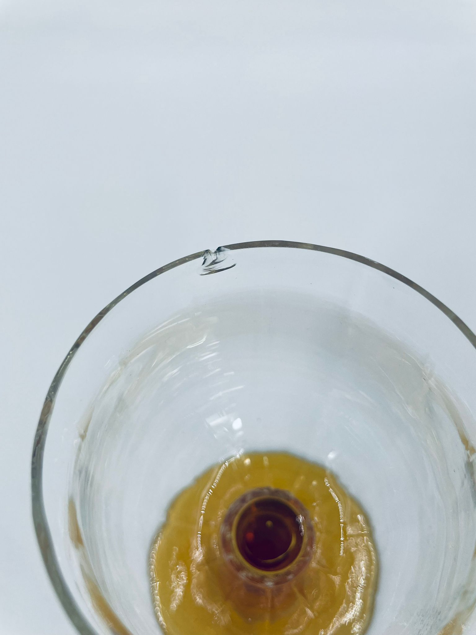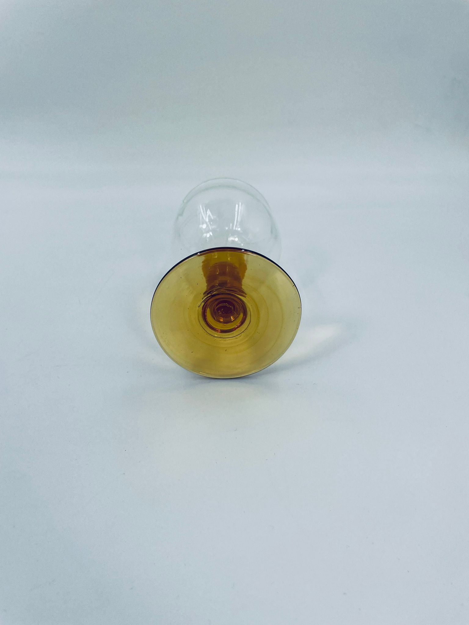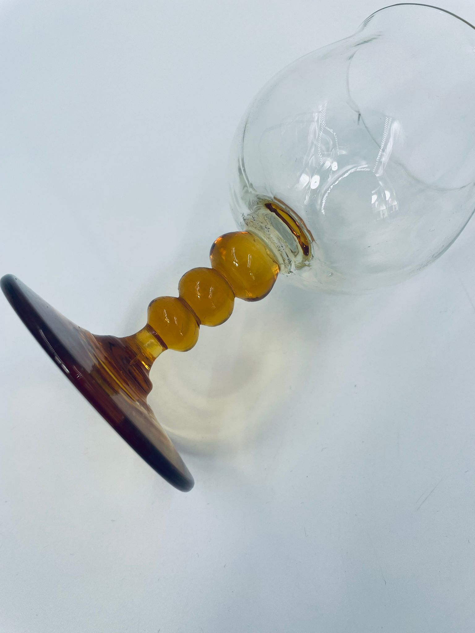Kieliszek do wina typu Römer, wykonany z wysokiej jakości szkła kryształowego. Czasza kieliszka przezroczysta, nóżka ozdobna, bursztynowa. Posiada uszczerbek na górnym rancie.