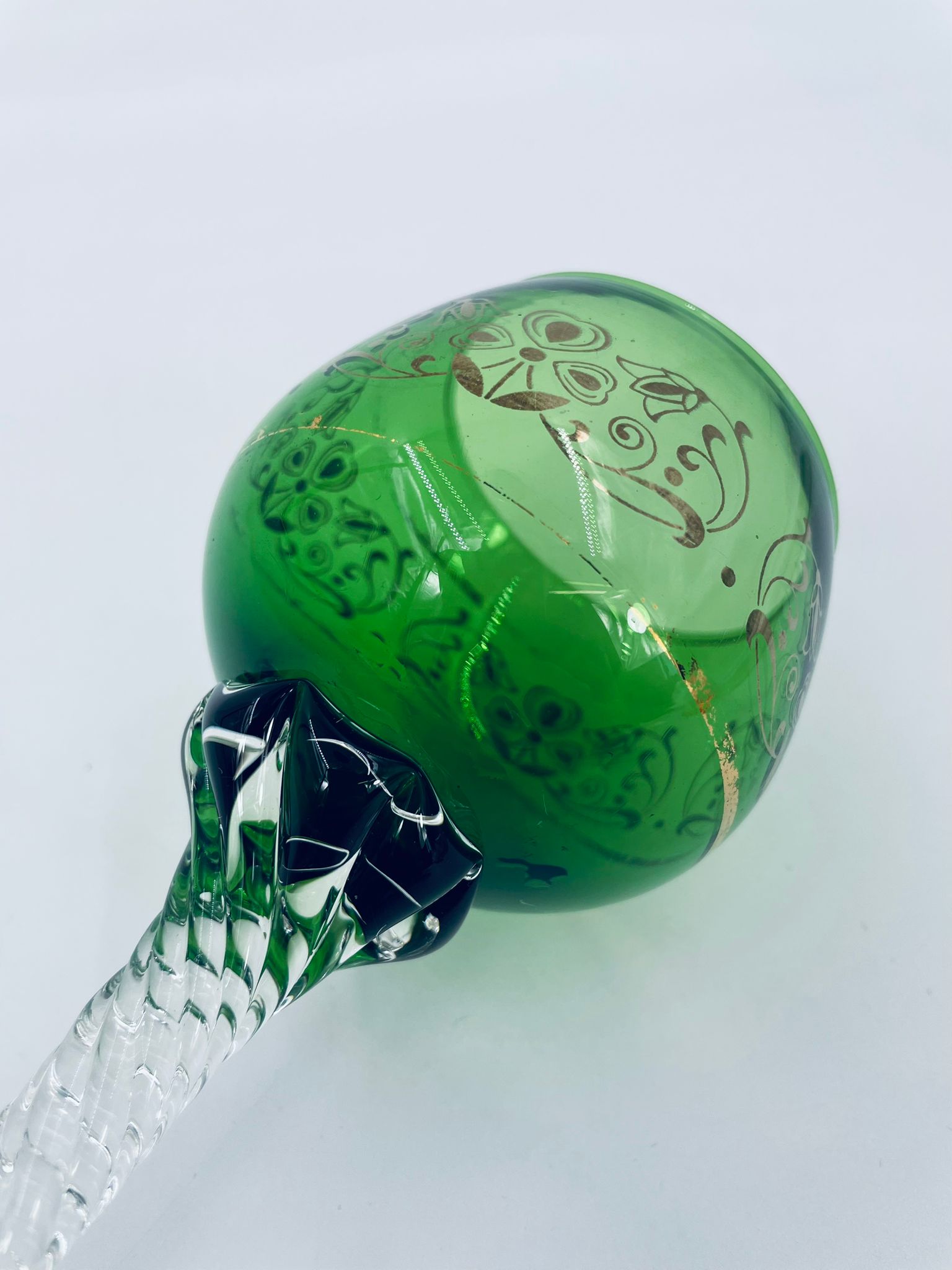 Kieliszek do wina Włoski, wykonany z wysokiej jakości szkła Murano. Kieliszek charakteryzuje się czaszą w kolorze butelkowej zieleni, ze złotymi wzorkami, nóżka przezroczysta o spiralnym kształcie i stabilna podstawa. Posiada przetarcia na złoceniu.