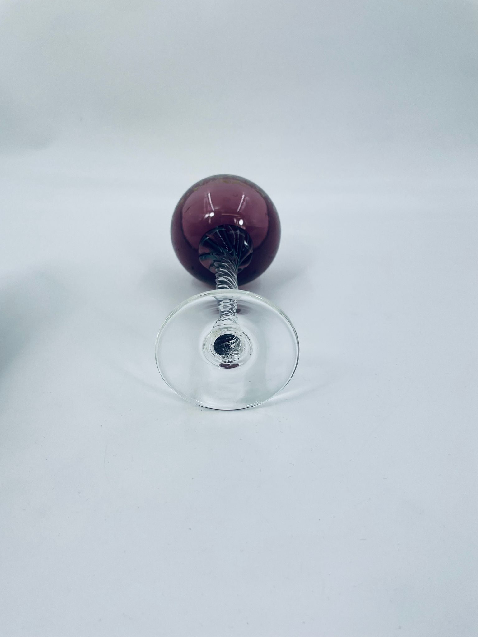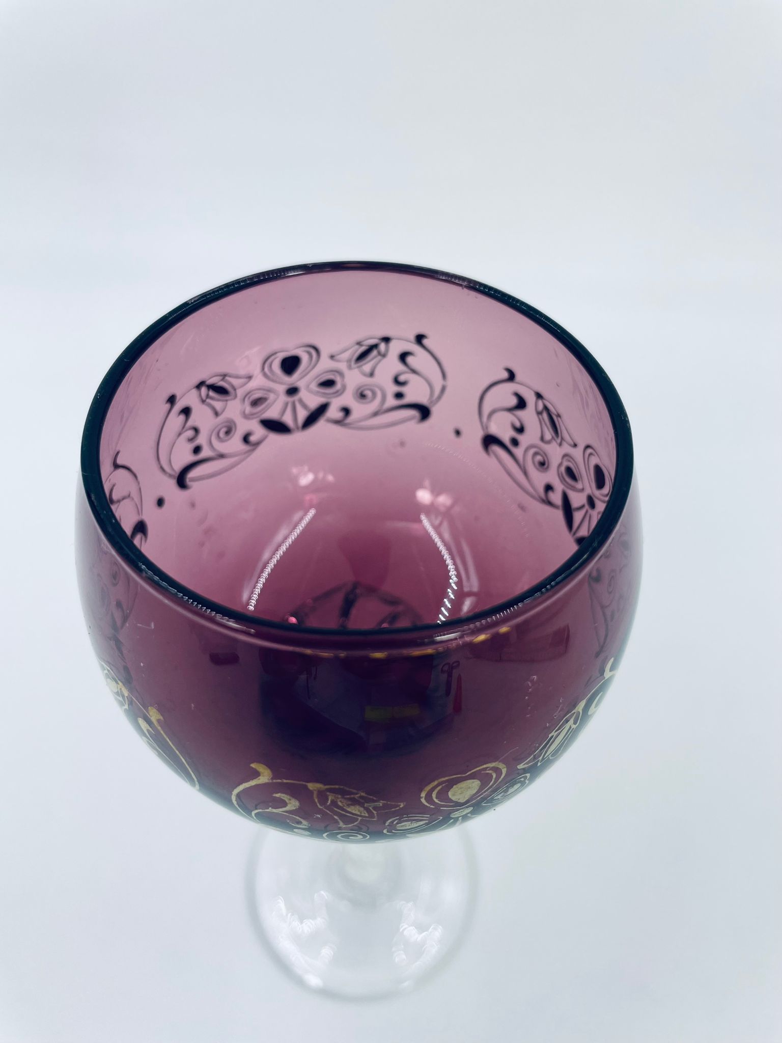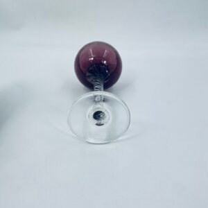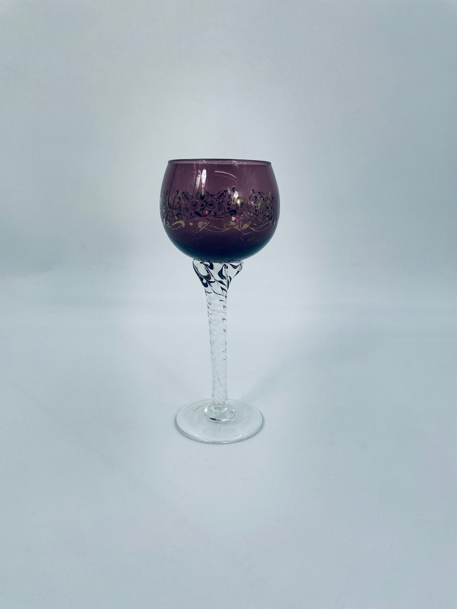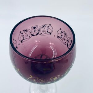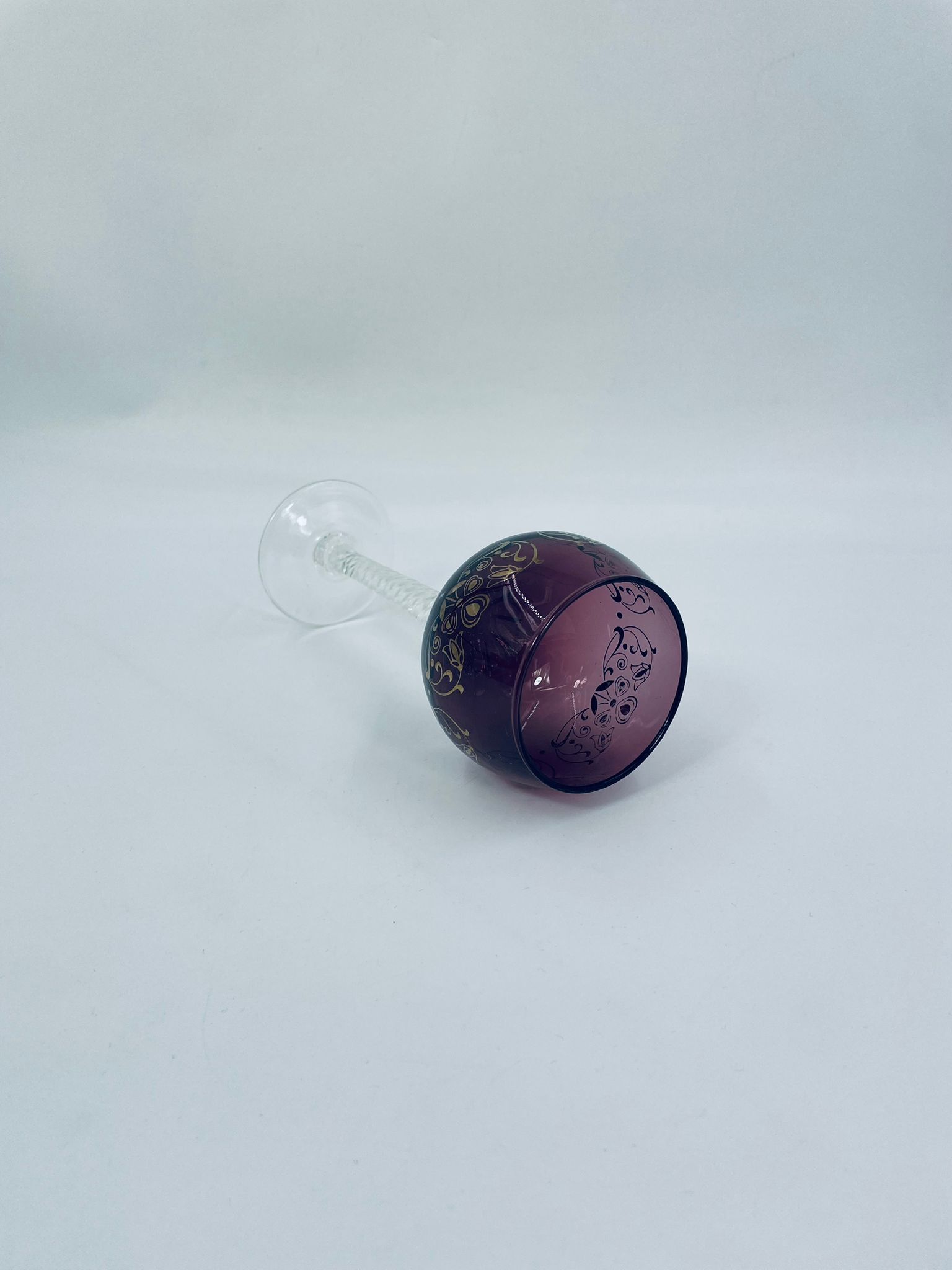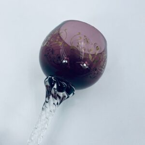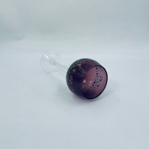 Kieliszek do wina Włoski, wykonany z wysokiej jakości szkła Murano. Kieliszek charakteryzuje się fioletową czaszą ze złotymi wzorkami, nóżka przezroczysta o spiralnym kształcie i stabilna podstawa. Posiada przetarcia na złoceniu.