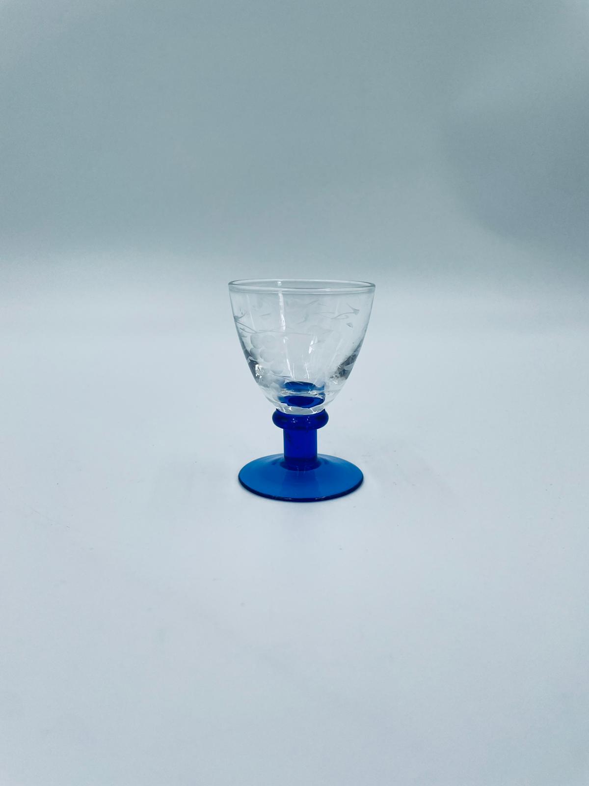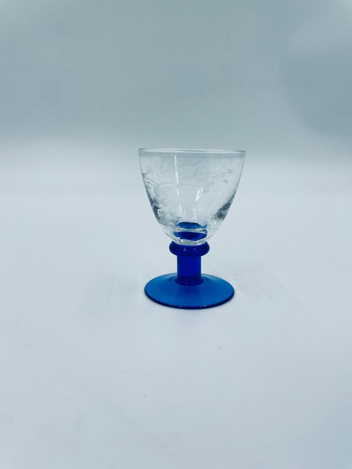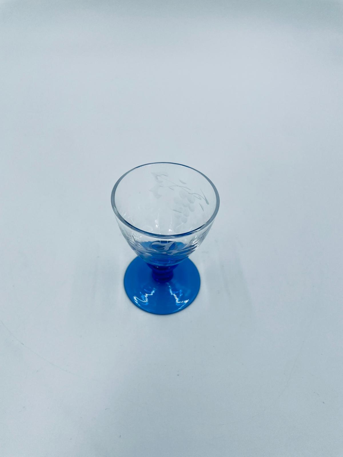 Kieliszek do wódki, likieru w stylu Vintage , wykonany z wysokiej jakości szkła. Kieliszek posiada przezroczystą czarę z ręcznie szlifowanym wzorem roślinnym oraz dekoracyjną nóżką i podstawa w kolorze kobaltowym.