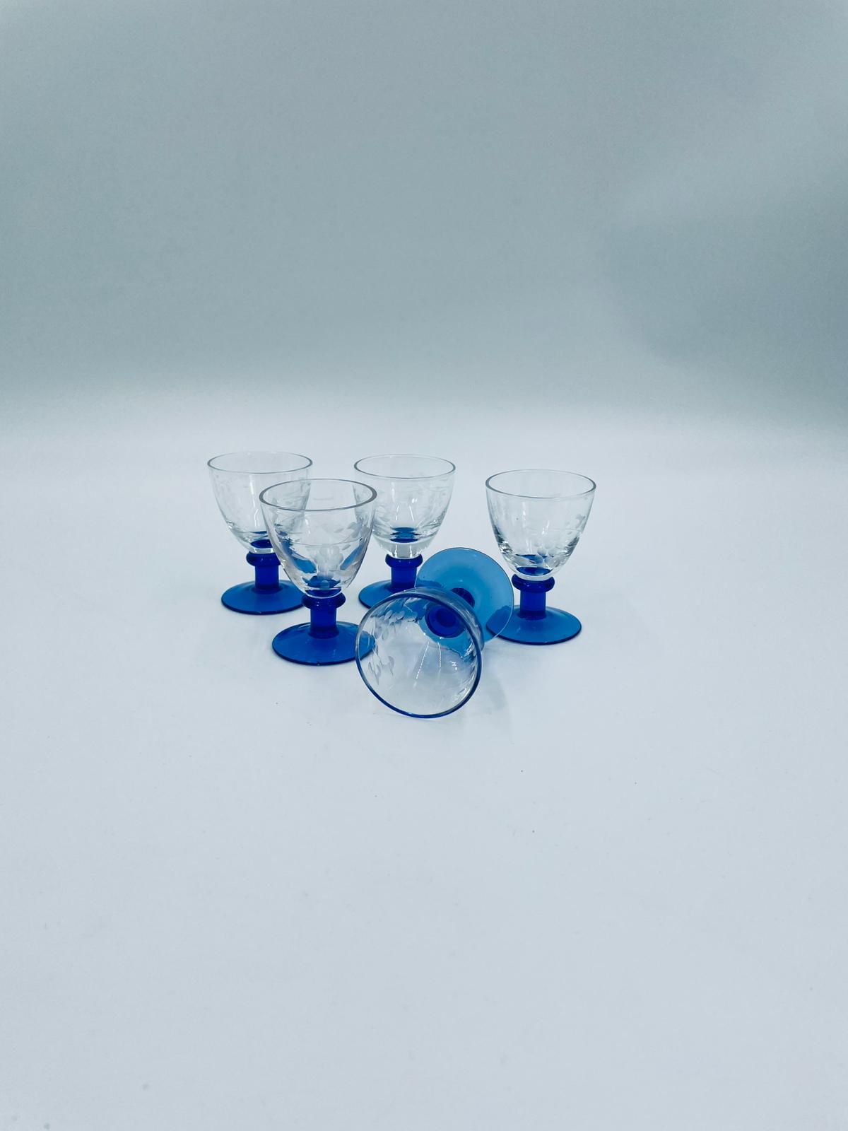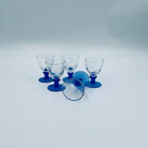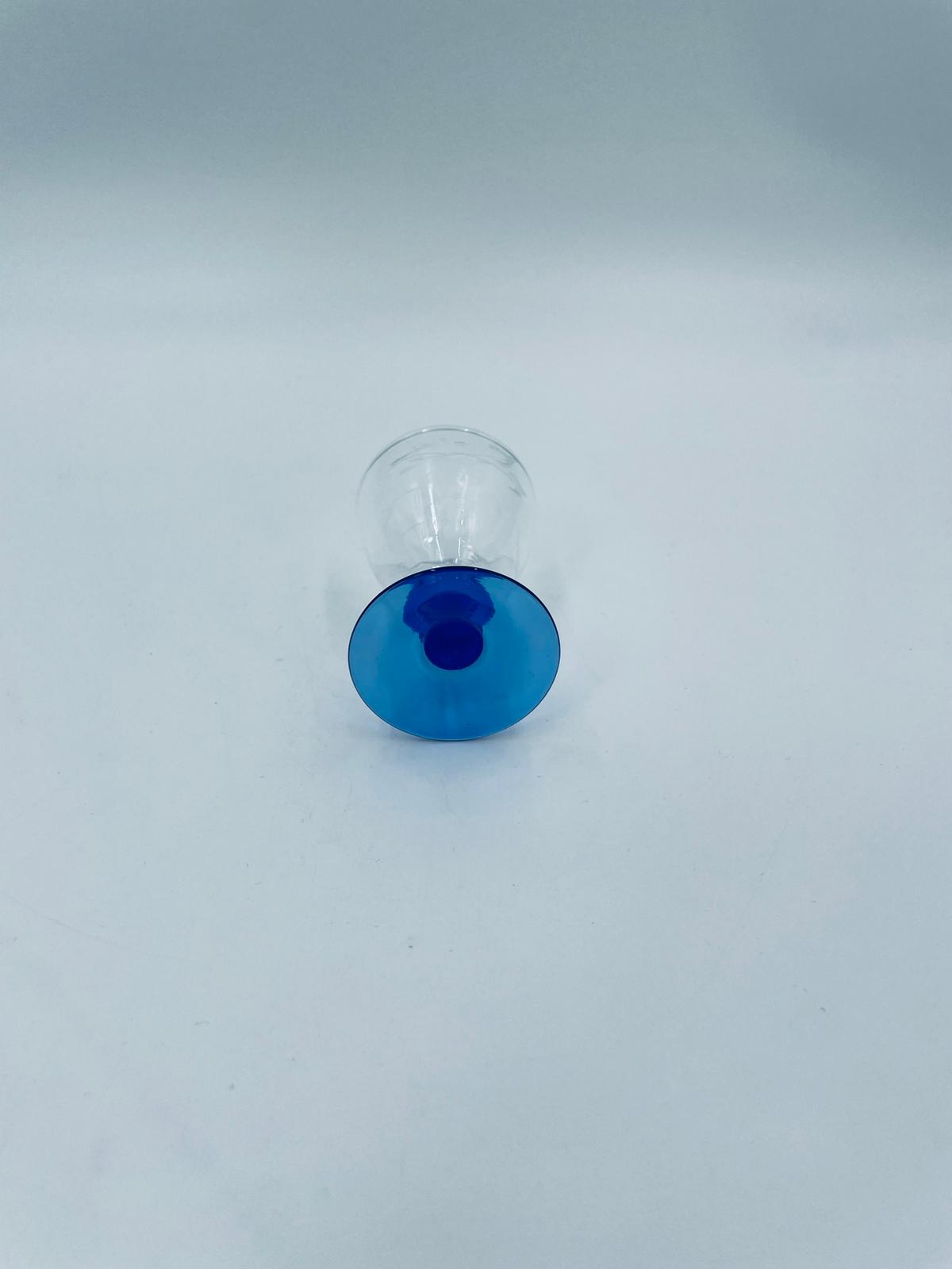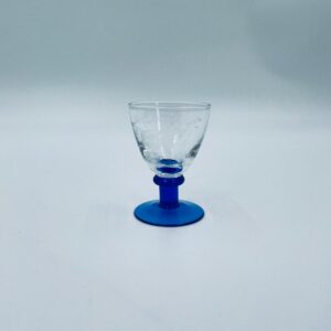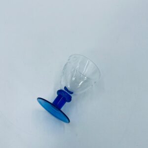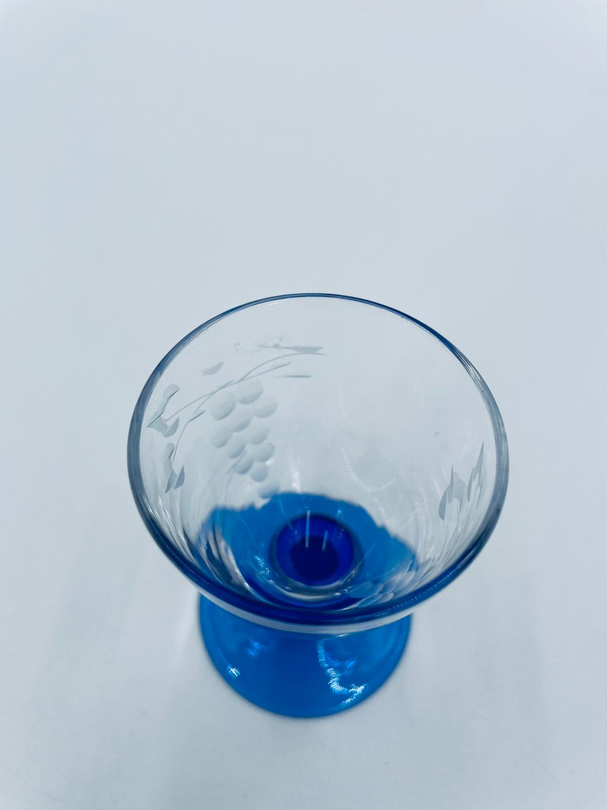 Kieliszek do wódki, likieru w stylu Vintage , wykonany z wysokiej jakości szkła. Kieliszek posiada przezroczystą czarę z ręcznie szlifowanym wzorem roślinnym oraz dekoracyjną nóżką i podstawa w kolorze kobaltowym.