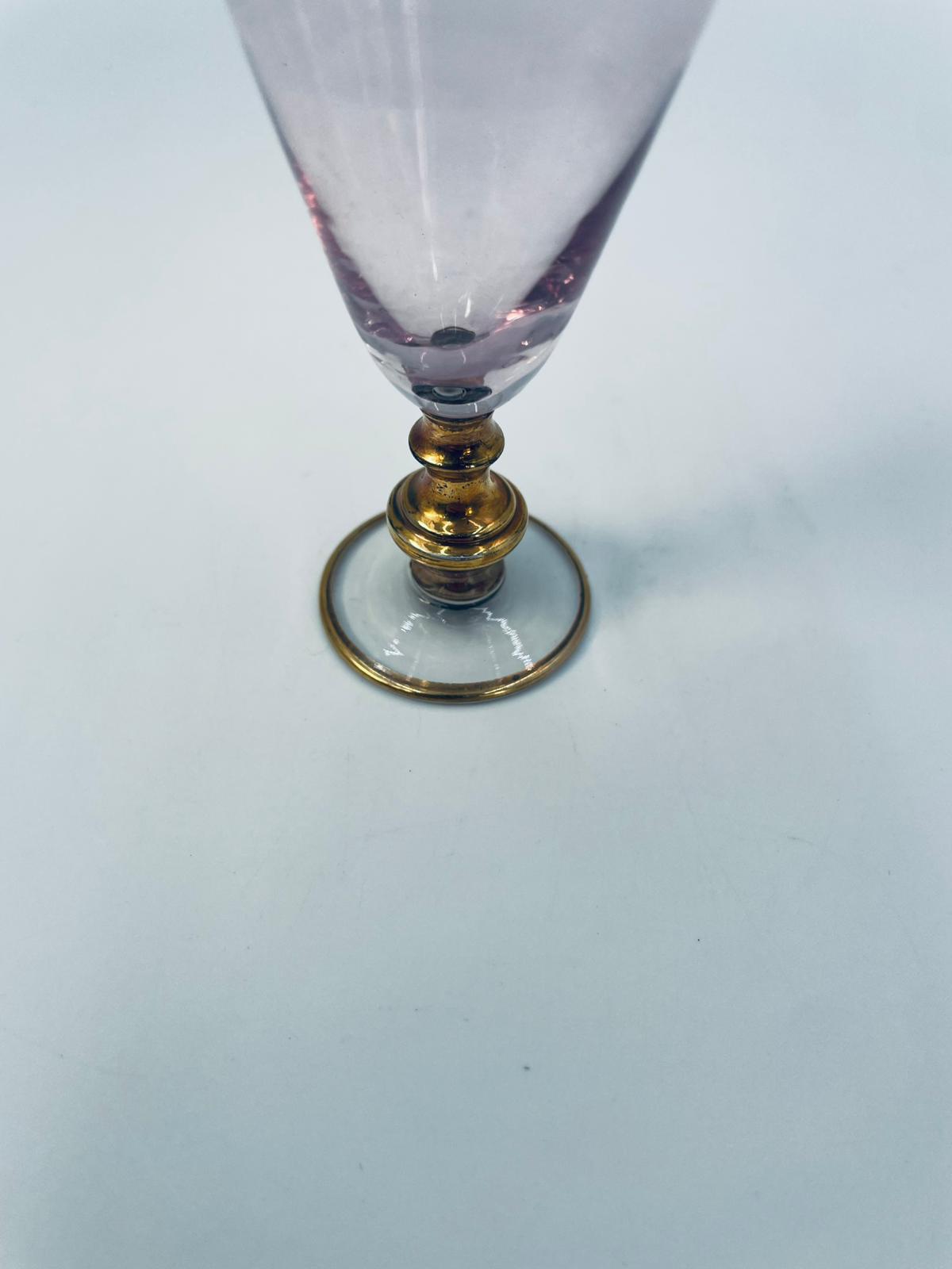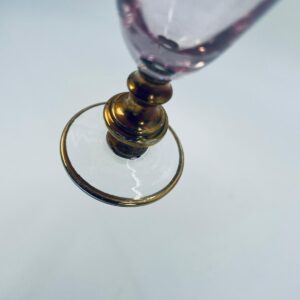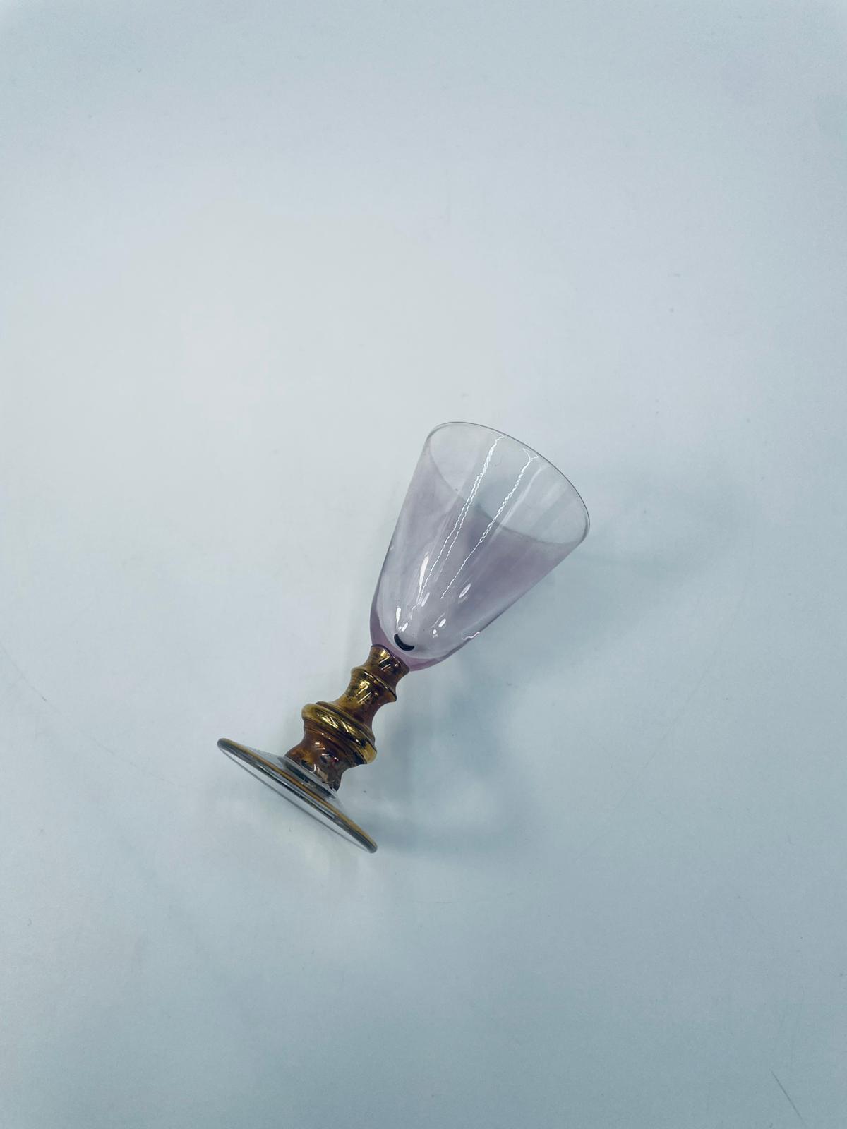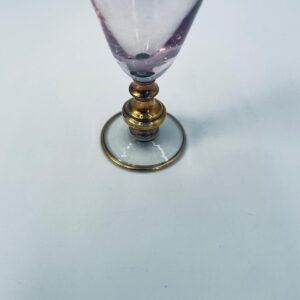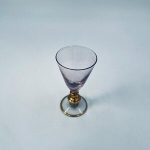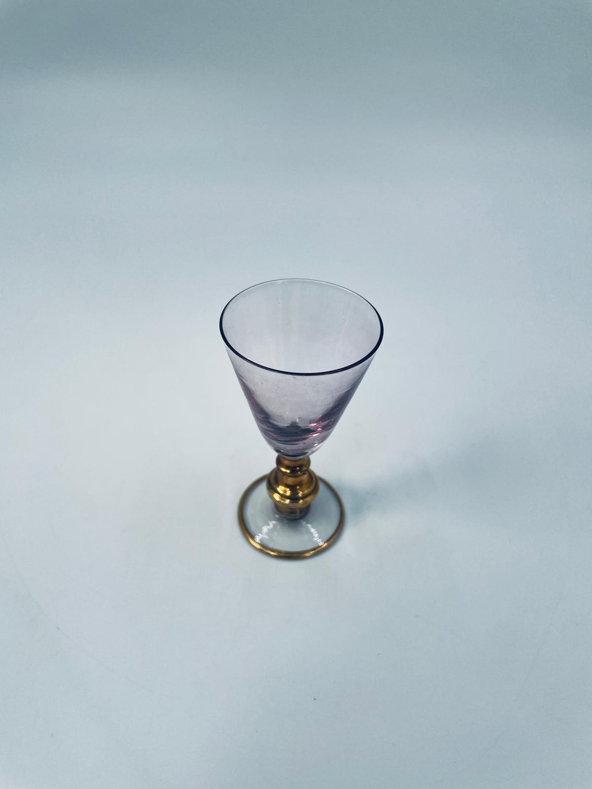 Kieliszek do wódki, nalewki w stylu Vintage, wykonany z wysokiej jakości szkła. Kieliszek charakteryzuje się stożkową, barwioną na jasnoróżowy kolor czarę oraz ozdobna, złota nóżkę i podstawę ze złoconym rantem. Posiada przetarcia na kolorze.