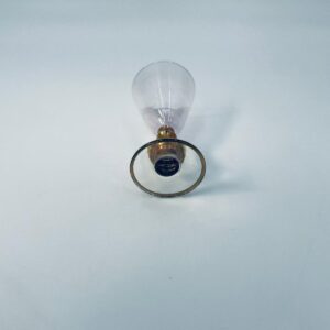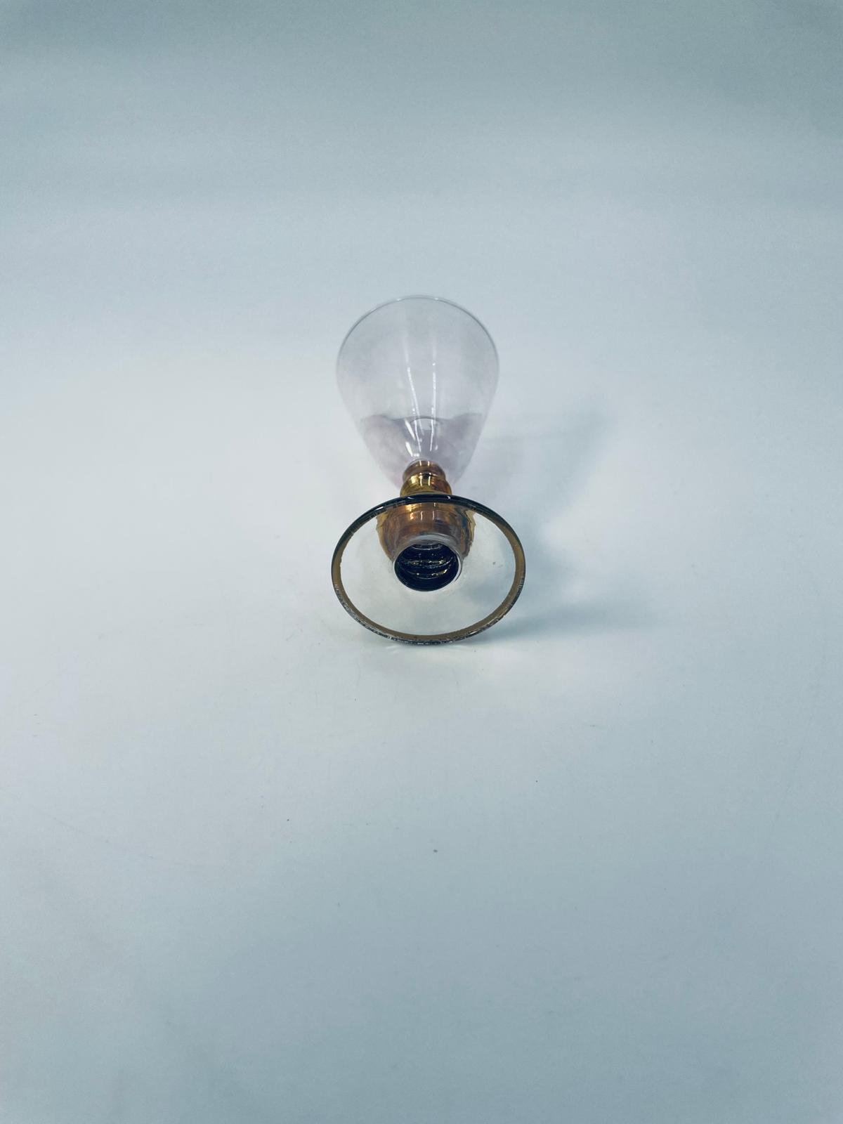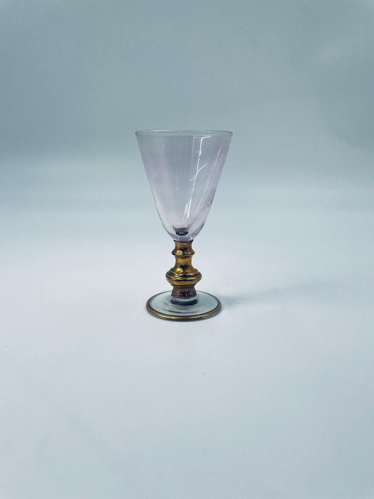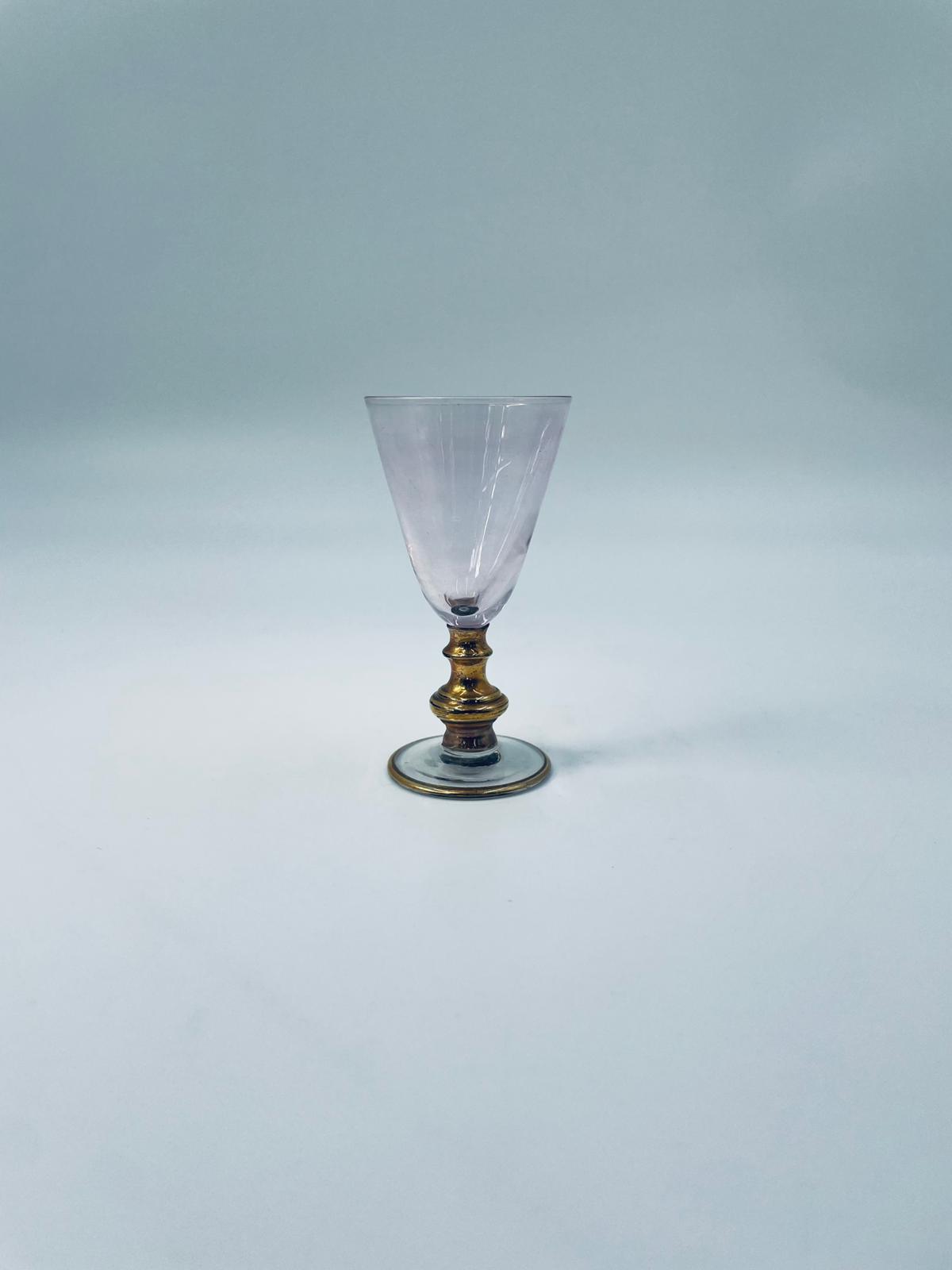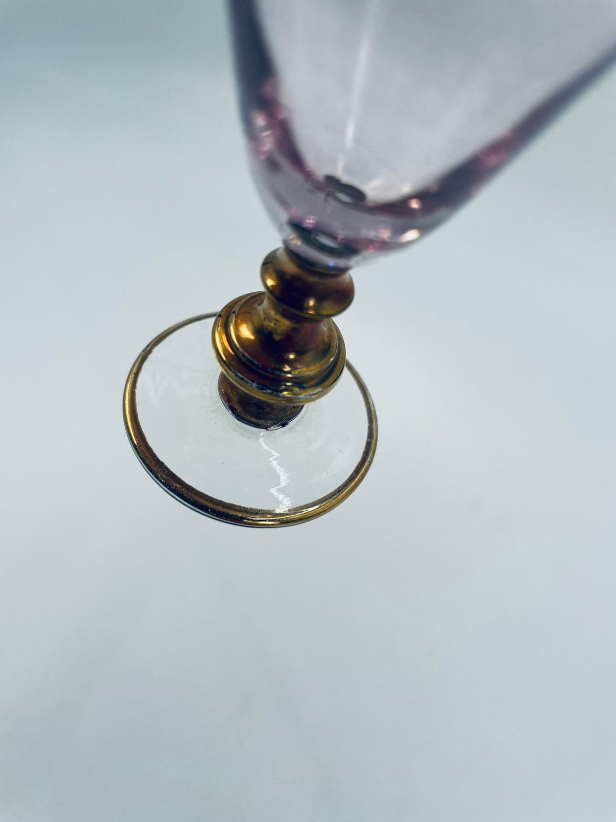Kieliszek do wódki, nalewki w stylu Vintage, wykonany z wysokiej jakości szkła. Kieliszek charakteryzuje się stożkową, barwioną na jasnoróżowy kolor czarę oraz ozdobna, złota nóżkę i podstawę ze złoconym rantem. Posiada przetarcia na kolorze.