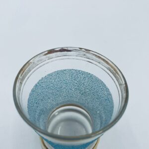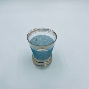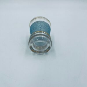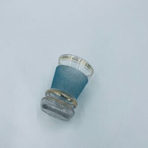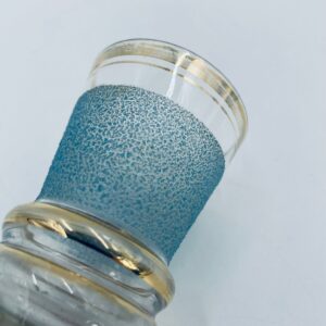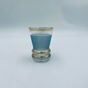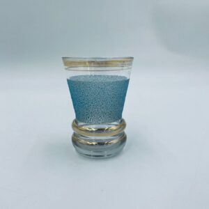 Kieliszek do wódki w stylu Vintage, wykonany z wysokie jakości szkła. Kieliszek charakteryzuje się dekoracją w postaci niebieskiego, chropowatego wzoru oraz złoceniem na górnej krawędzi oraz postawie. Posiada przetarcie złocenia.